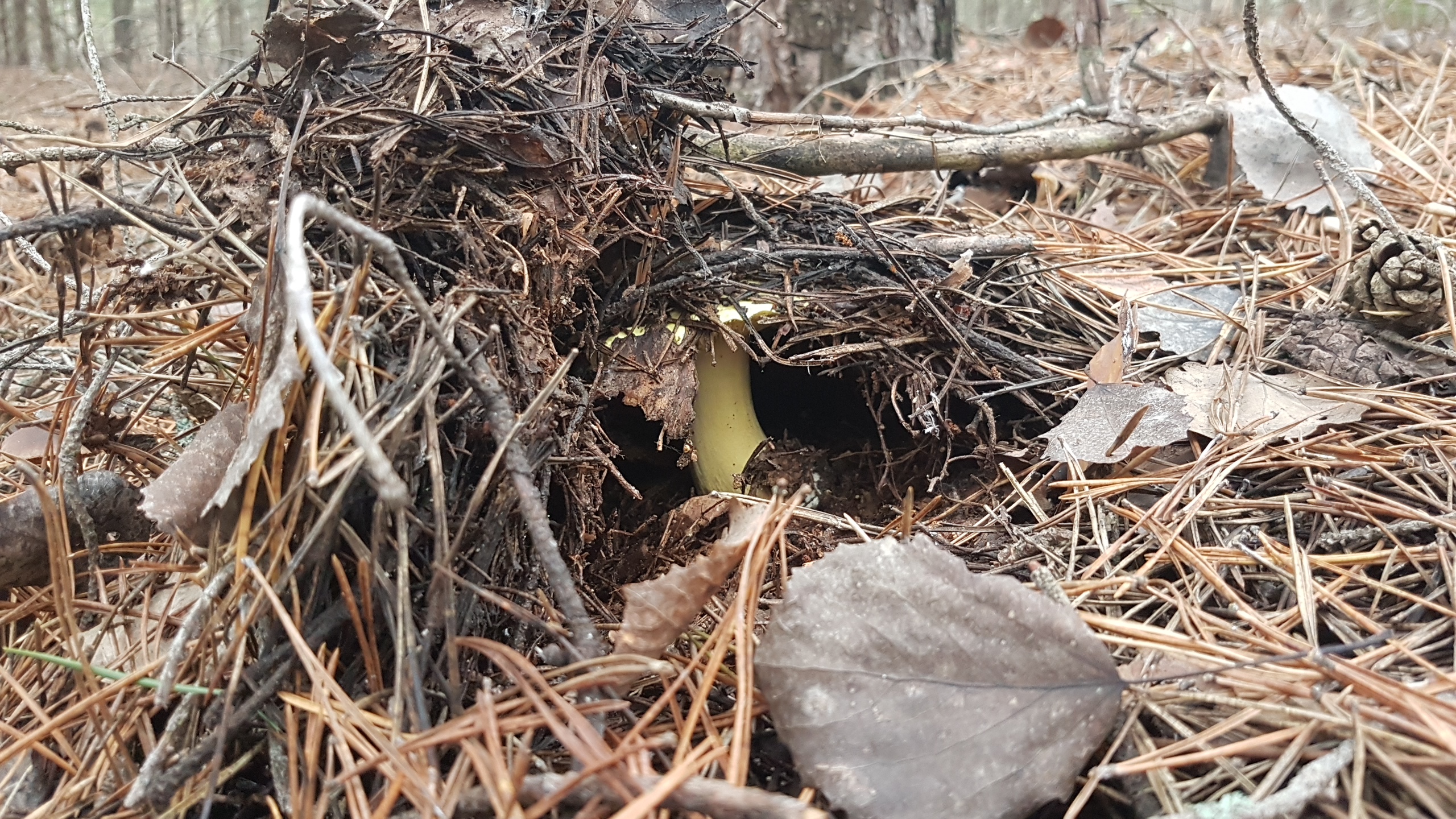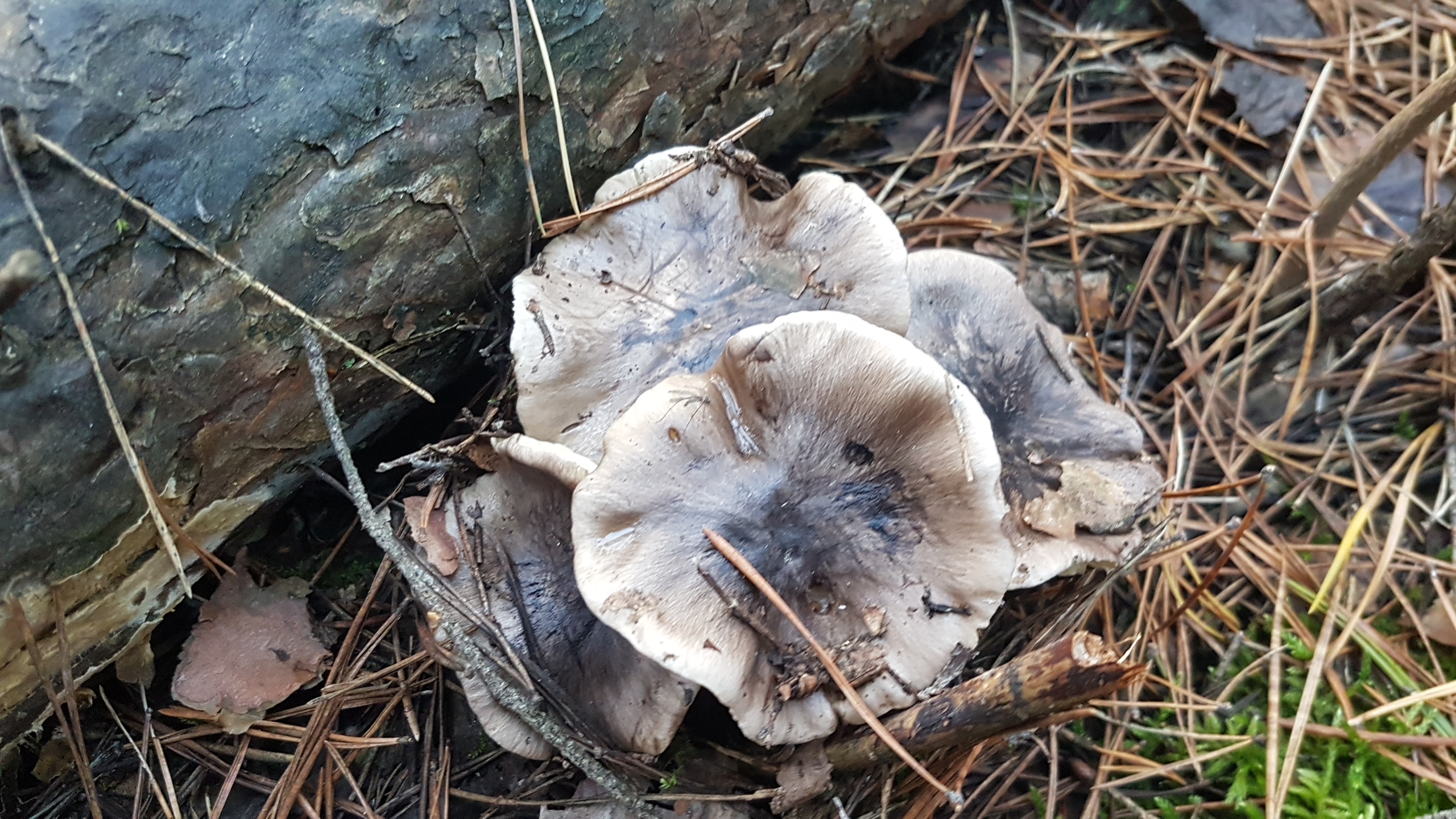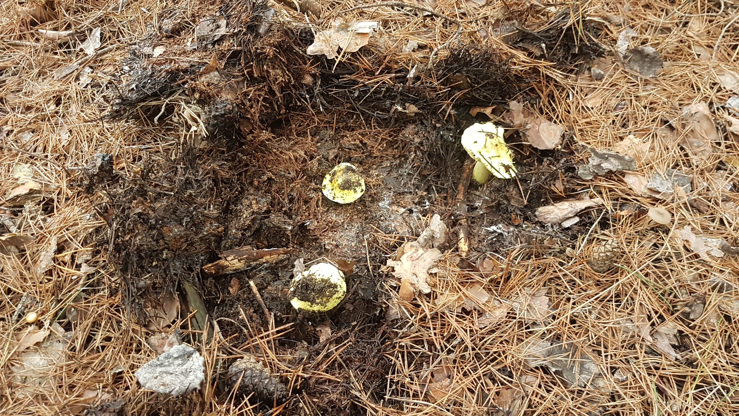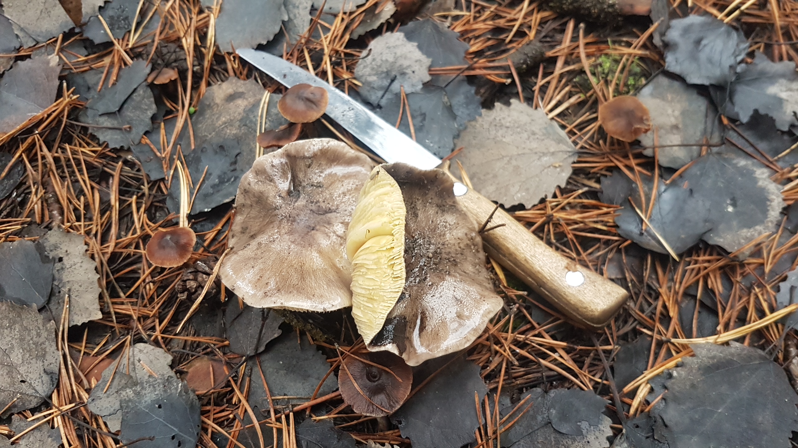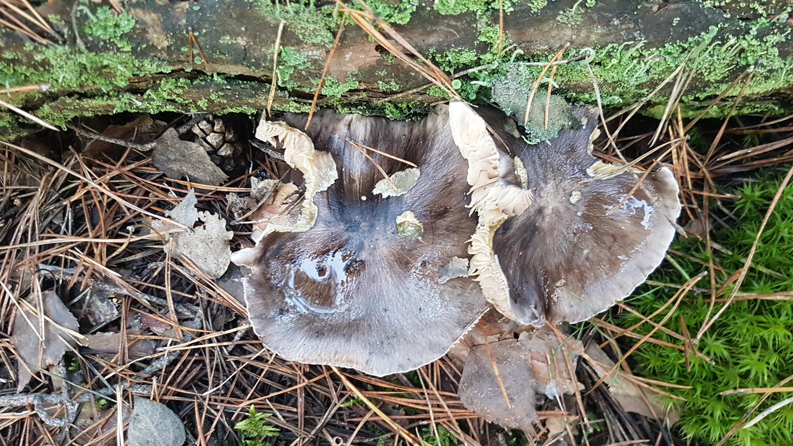 Зеленушки перестали рости в листве. Там стоят очень старые экземпляры с лопнувшими от воды шляпками и сильно покоричневевшем верхом. Стали появляться грибы в сосновых иголках. Но всё равно недалеко от границы с лиственными посадками, то есть чтобы света было больше.