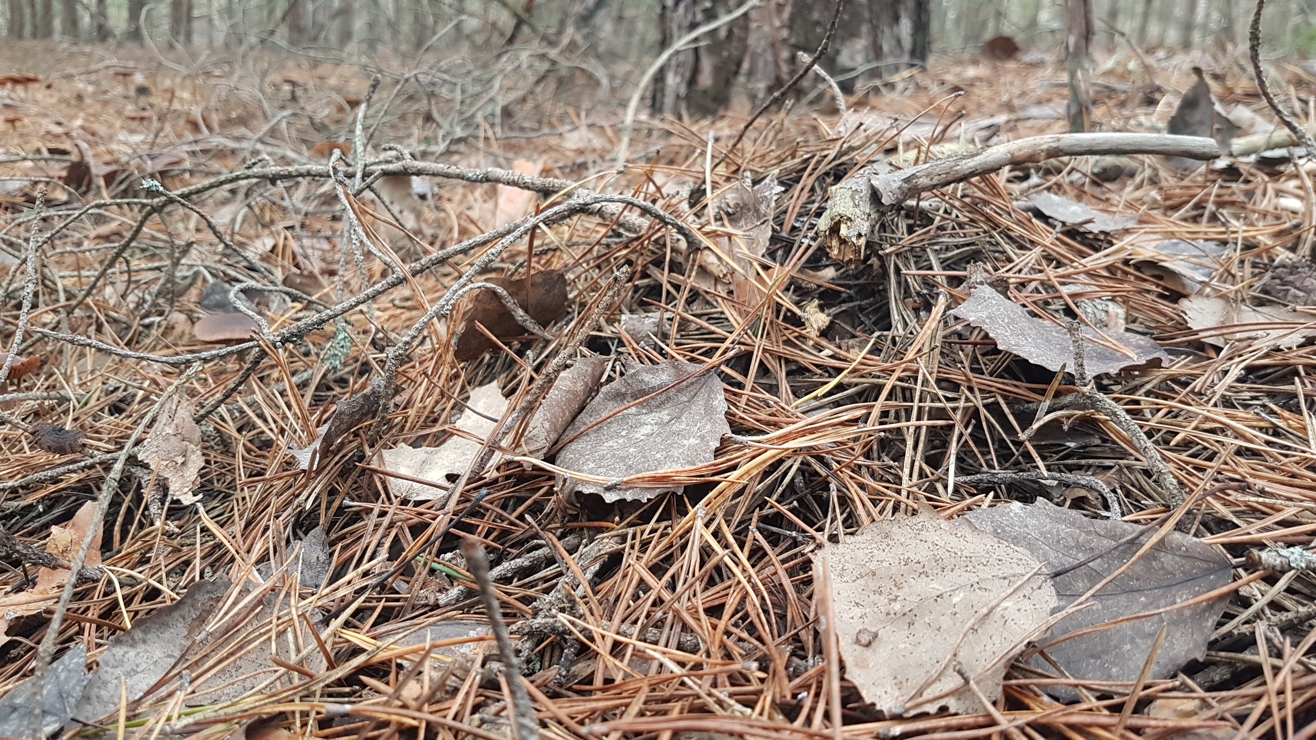 Ну как бы точнее сказать. Стоят сосны повыше, а рядом с южной стороны стоят более низкие берёзки и осинки. Получается и листва недалеко от игольчатой подстилки, и у солнышка получается осветить сбоку сосновый подлесок. А дальше в глубь соснового леса пока пусто.