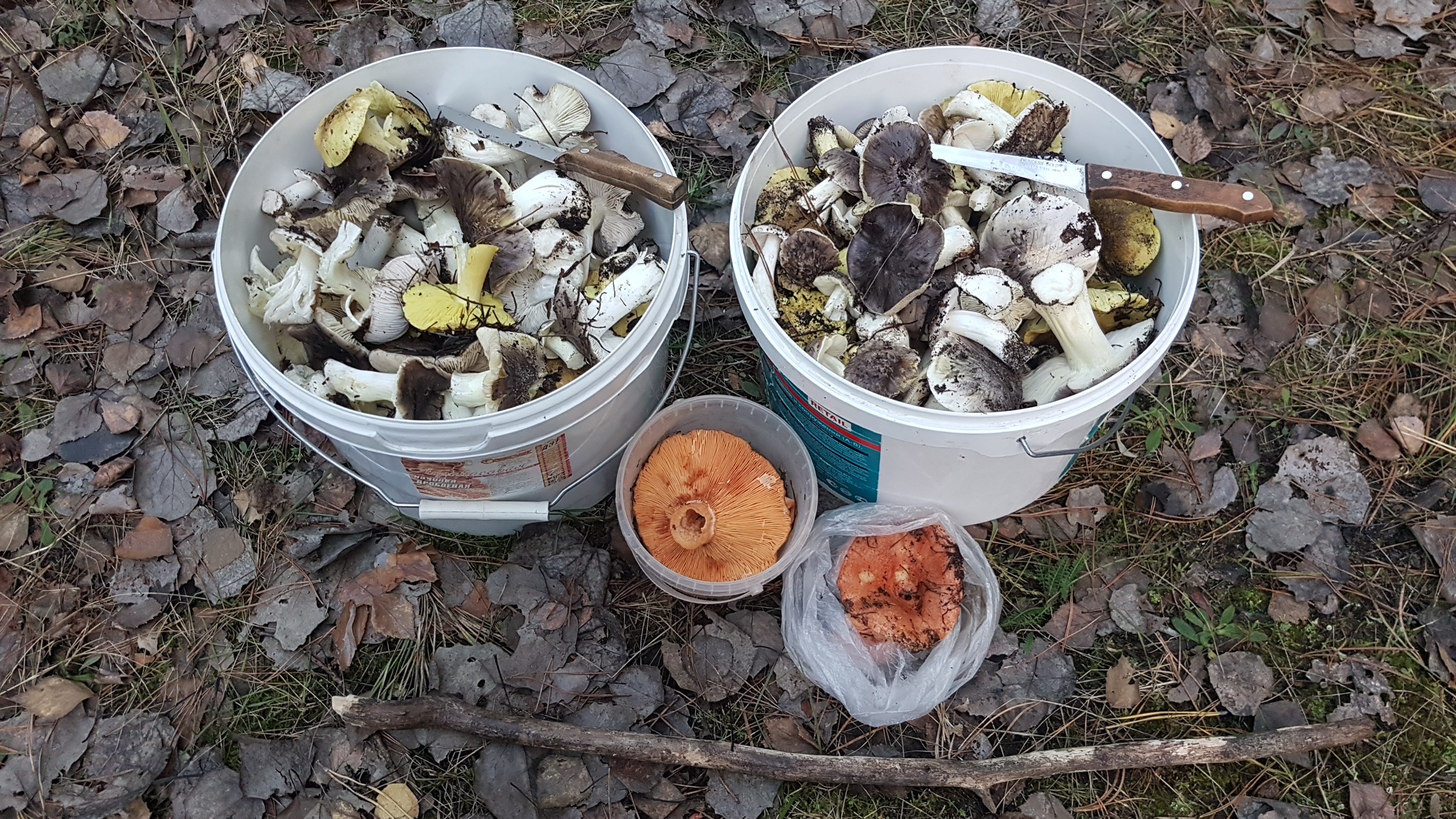 В сборе зеленушки, серая рядовка и немного рыжиков. Лес переувлажнён. Вода на корню рвёт грибы в клочья. Особенно к воде чувствительна серая рядовка. При срезании её ножом, она разваливается на множественные полоски. И взять с такого гриба практически не чего.