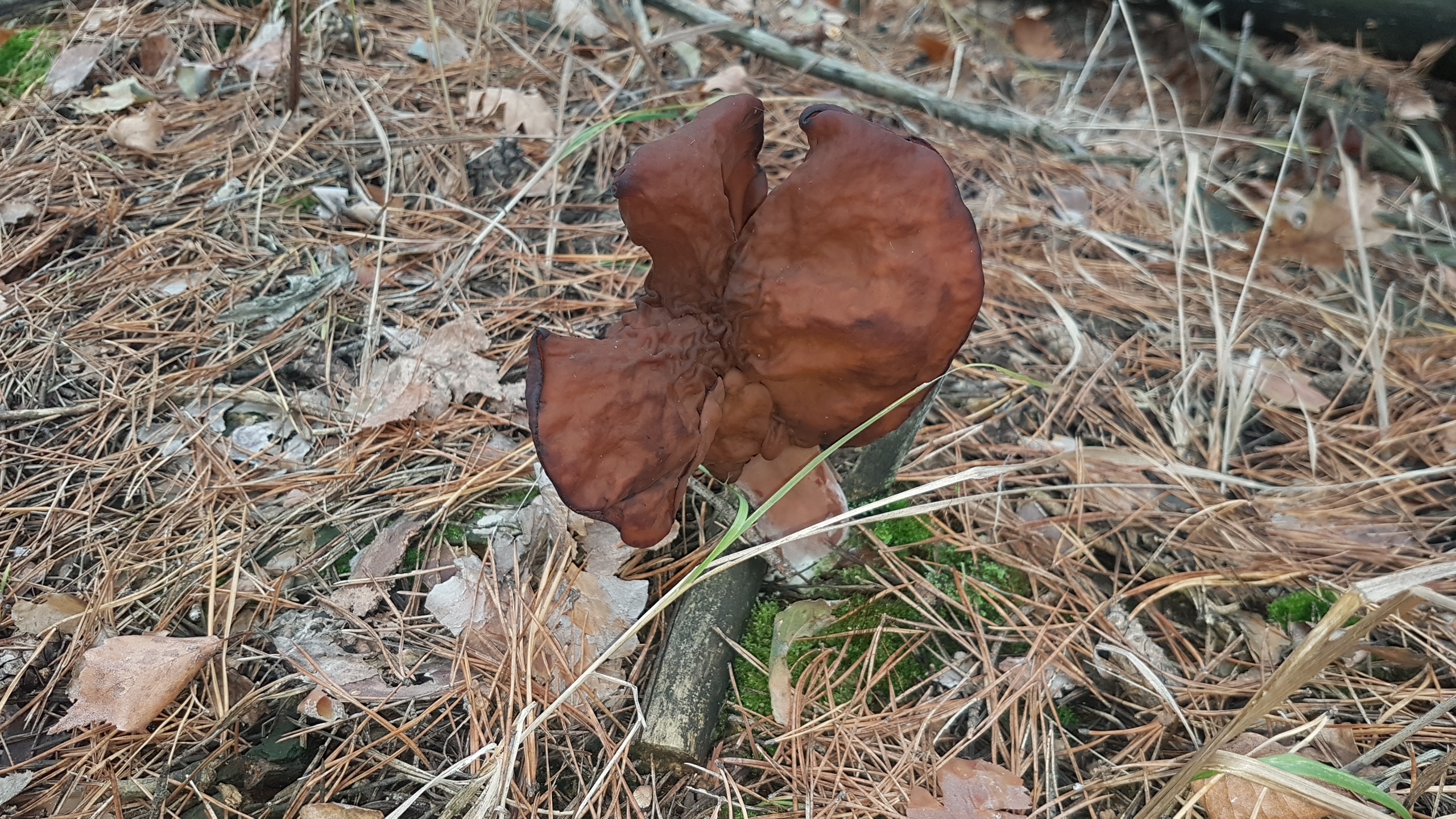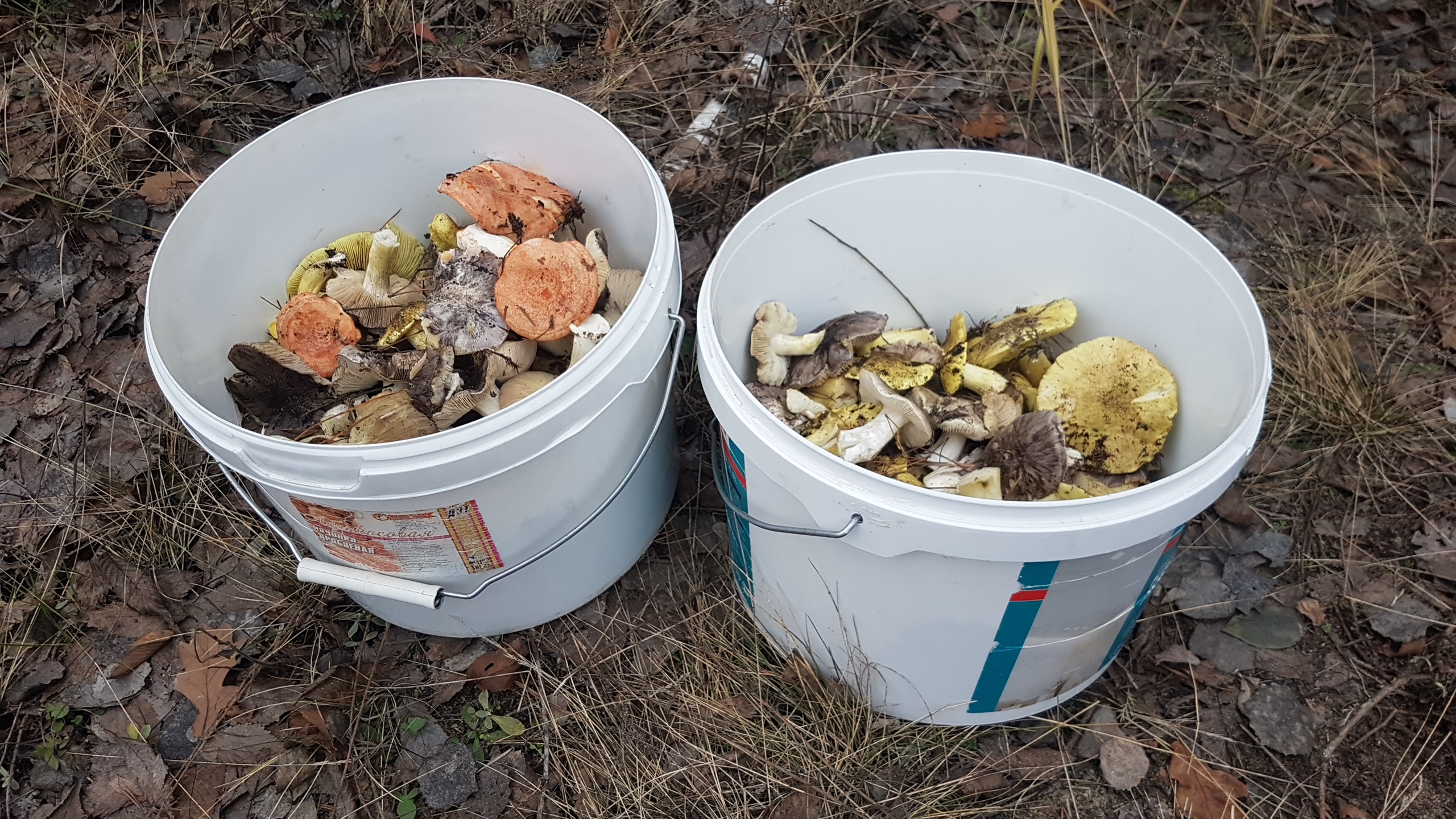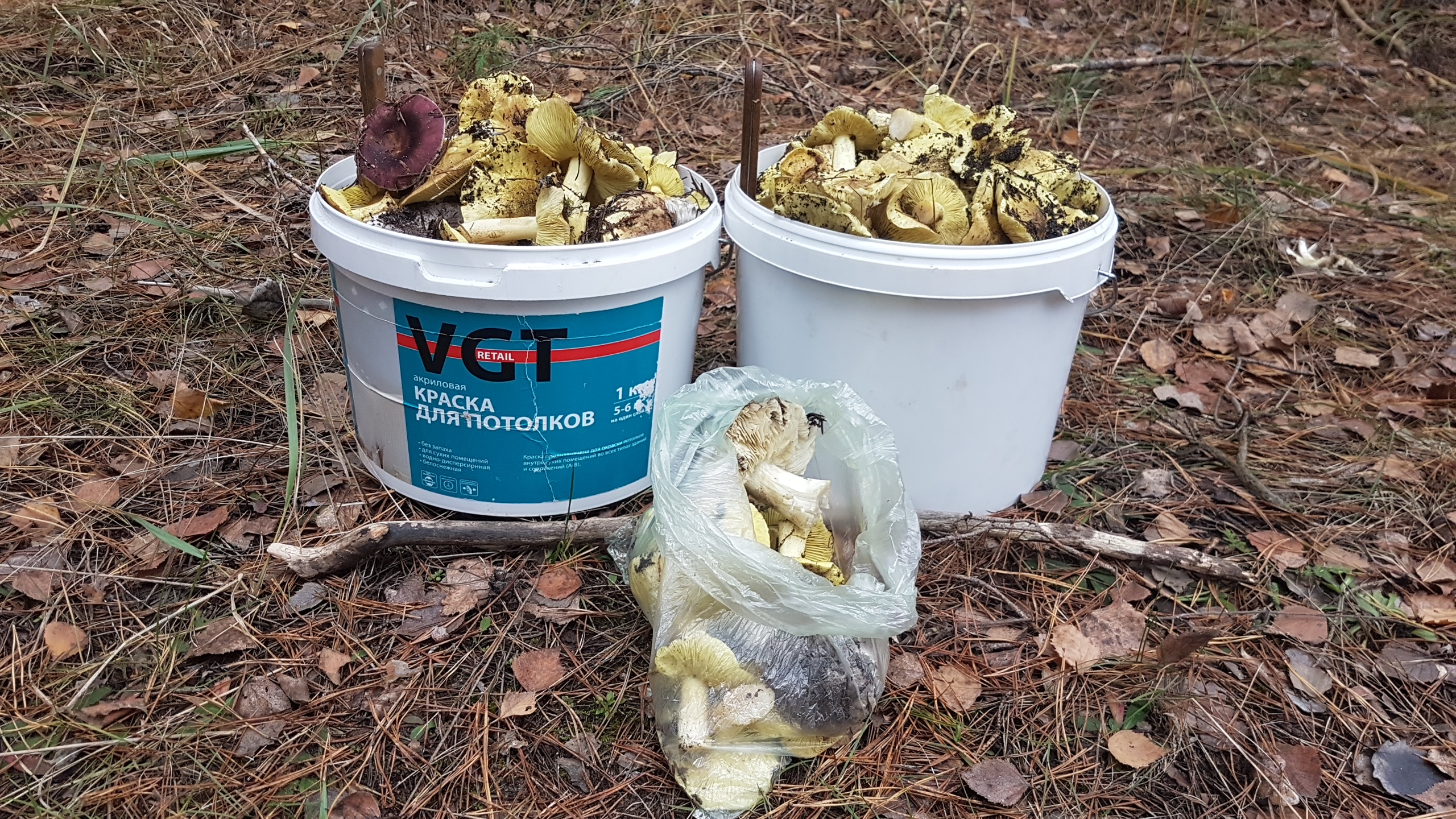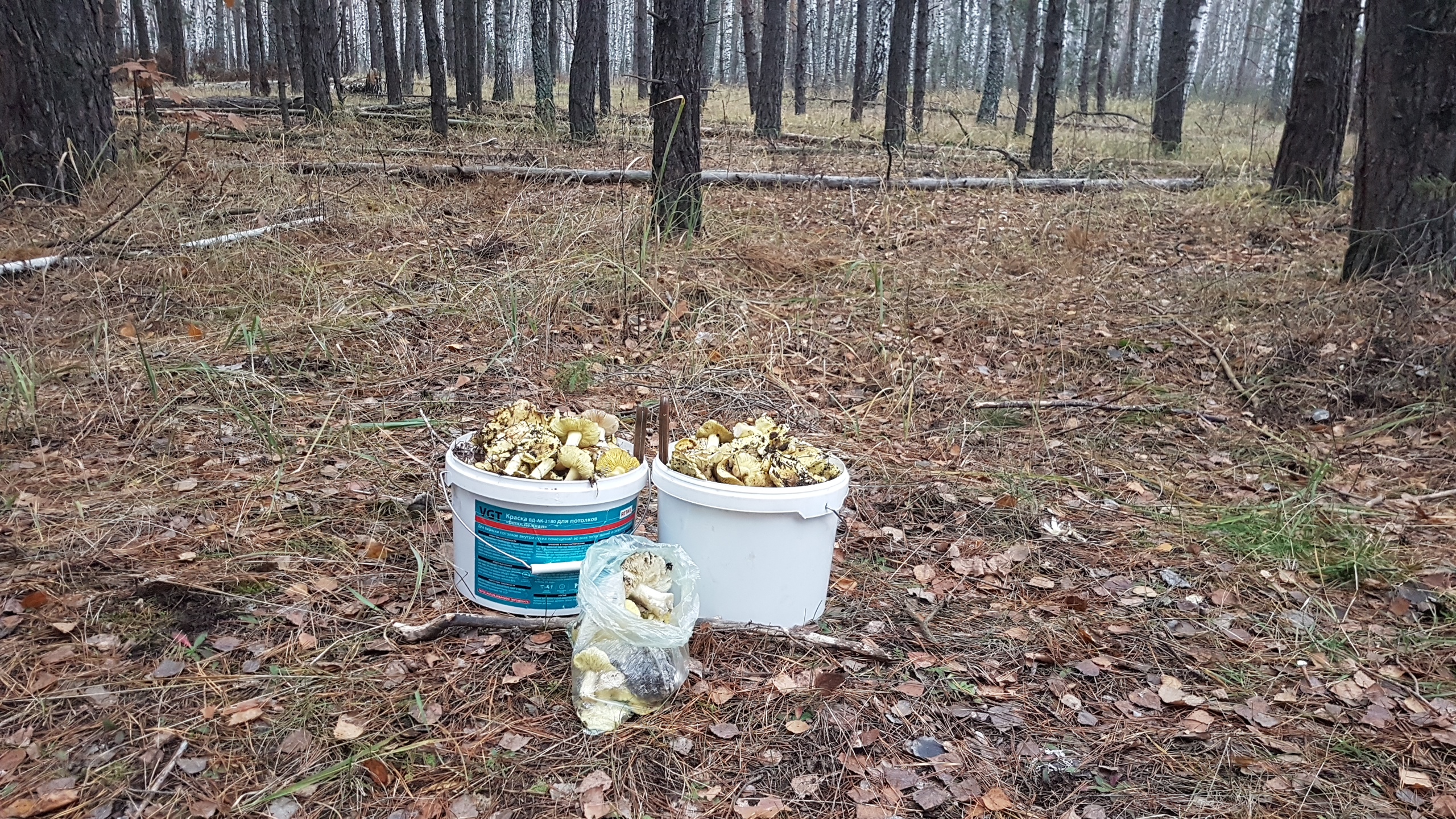 По приезду на эту локацию нас встретили бледные поганки в большом количестве, но все они были очень старыми, с коричнево-серыми шляпками. Первыми найденными грибами были замороженные зеленушка и серая рядовка. Далее следовали срезанные пеньки прежних грибов. Много было старых мерзлых бордовых сыроежек, которые крошились при их срезании. Затем пошли бугорки молодых бордовых сыроежек. Под иголками их мороз не достал. Мы срезали их с десяток. Далее прошли вглубь локации. Я увидел под ногами череду бугорков из хвойной подстилки. Тут же меня позвала жена. Предложила идти к ней помогать резать грибы. У неё их много. Я отказался. Нужно было свои бугорки осмотреть. И всё! Дальше как опустились на землю на четыре точки, так встали когда вёдра были полными с верхом. Хотел было сбегать ещё за вёдрами, но жена остановила. Она планировала набрать всего не более одного ведра.