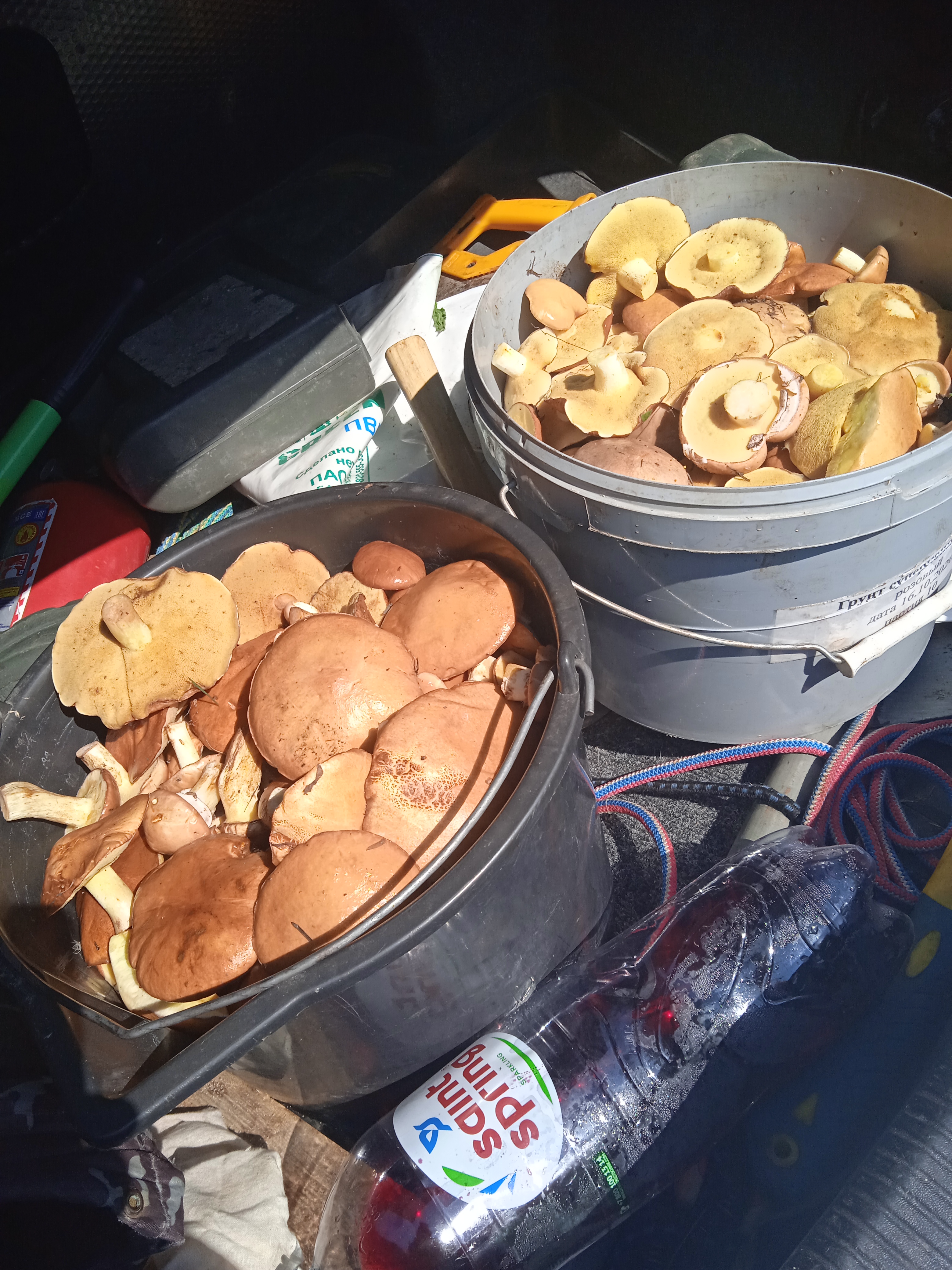 Всем привет.Сегодня был на даче и грех было после таких дождей не заехать посмотреть грибы,маслят хоть косой коси , в соснах ещё малюсенькие, пока пол ведра набрал думал скончаюсь,но на на обратном пути по травке уже попадались покрупнее,завтра после завтра думаю можно будет ложиться и резать вёдрами и ещё овода сожрали, по тупости ни чего не одел в майке пошёл ,как то так.