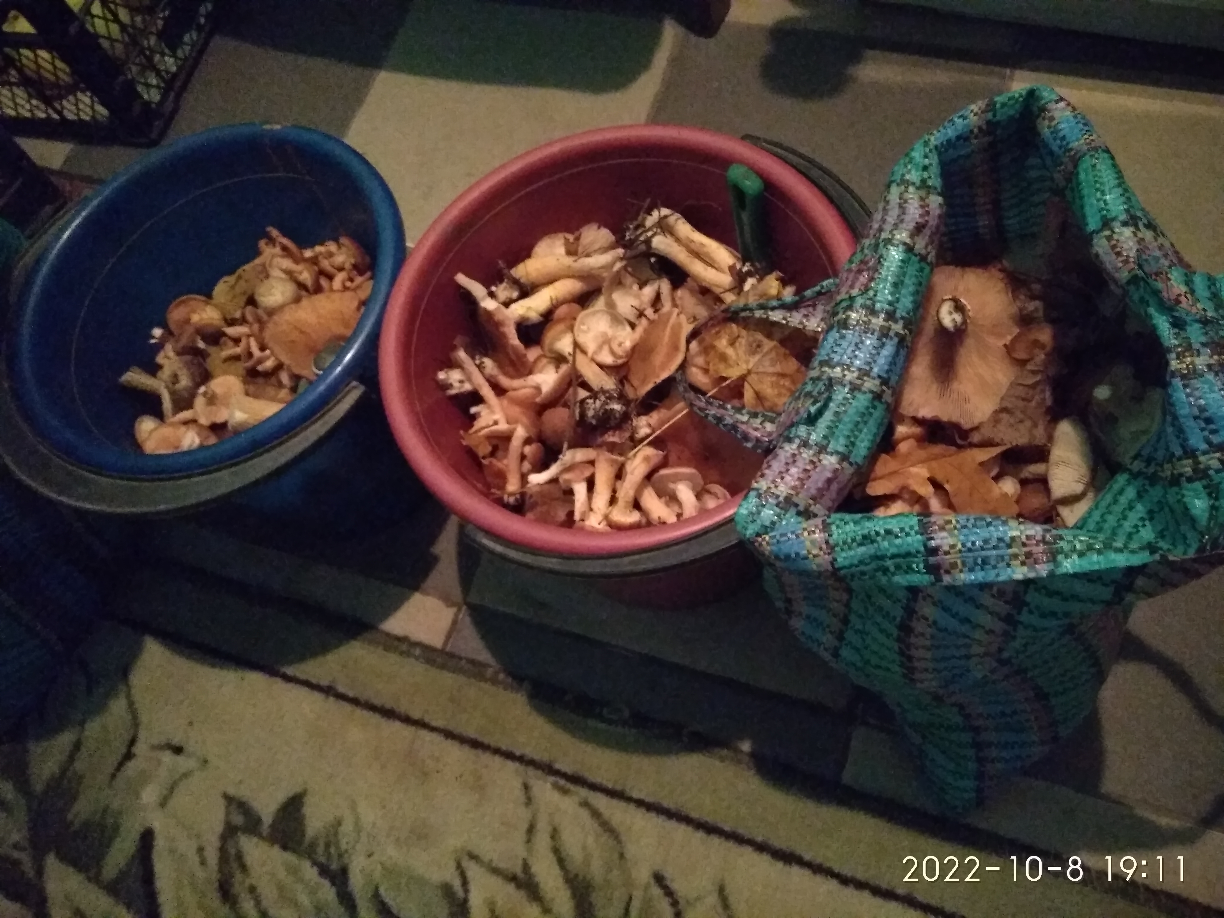 Ранее ведро 12 литров другу набрали. Это второй сбор. В 20 метрах от собственного забора. Вечером будет жареная картошка с грибами.