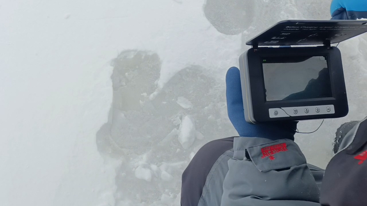 Львиная доля поиска рыбы выпала на видеокамеру, её хоть как то можно было спрятать своим телом от снегопада.