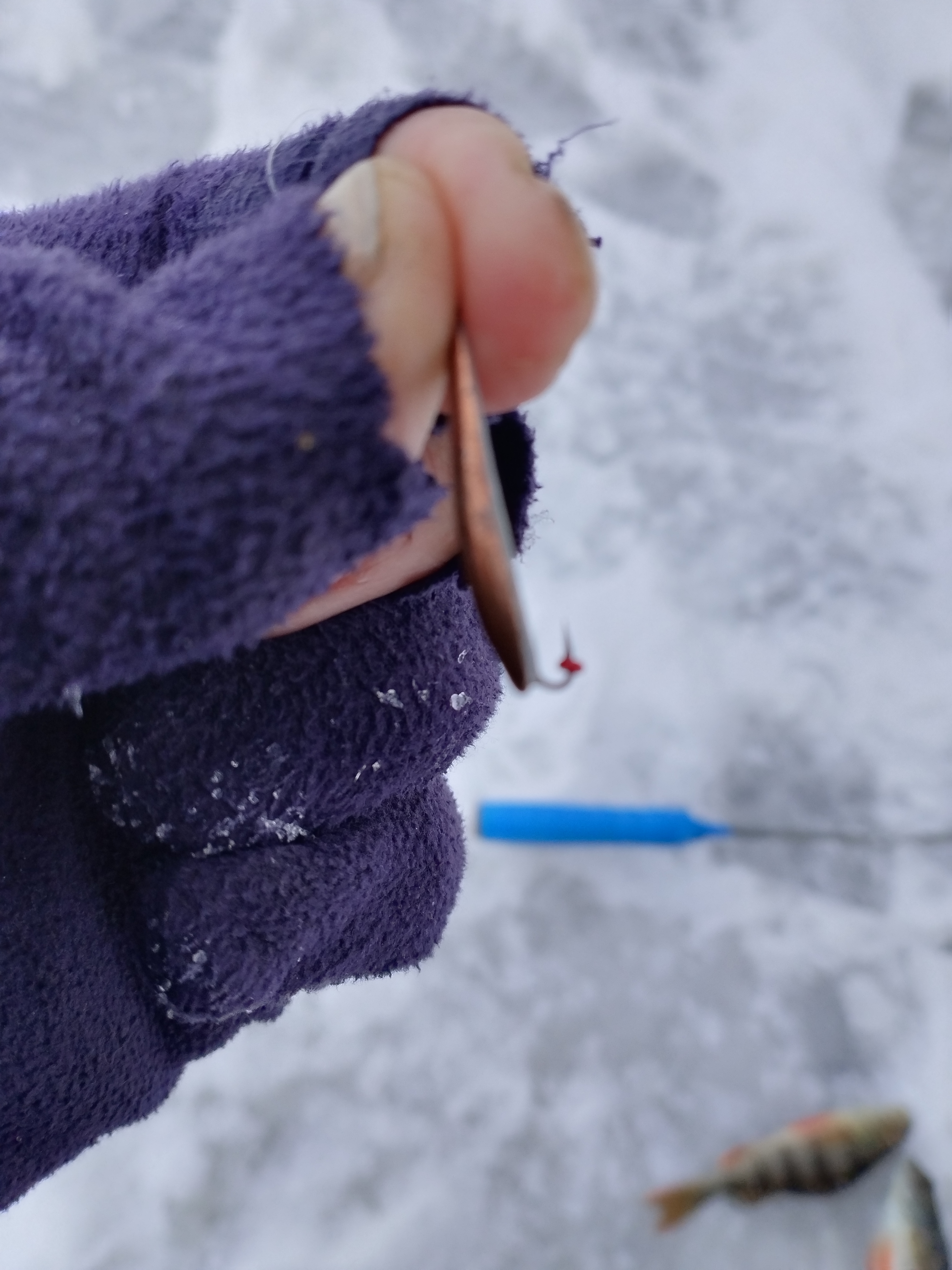 По поводу рыбалок прошлых в январе - был на трех прудах в разных краях от города. И на всех была ситуация что погода менялась, клева не ожидалось. Но суть в том, что не находил даже в камеру мелкого окуня, т.е. ни к чему не был привязан он на дне. И на двух прудах сработал только поиск ногами буром и крупными приманками - блесны листиком по 45-52 мм, думаю что пошумнее и привлекали окуня получше. Сильно в количестве не получалось, но размер был уже получше. И даже мелкий окунек с палец вешался на трех метрах на большие приманки. А на третьем пруду на эти блесны кидались щурята. Пришлось на этой неделе восстановить потери по ночам. Никогда раньше особо не верил в большой размер по нашему окуню (45мм и больше), но ими понравилось пробивать места с глубиной за 3-4 метра.