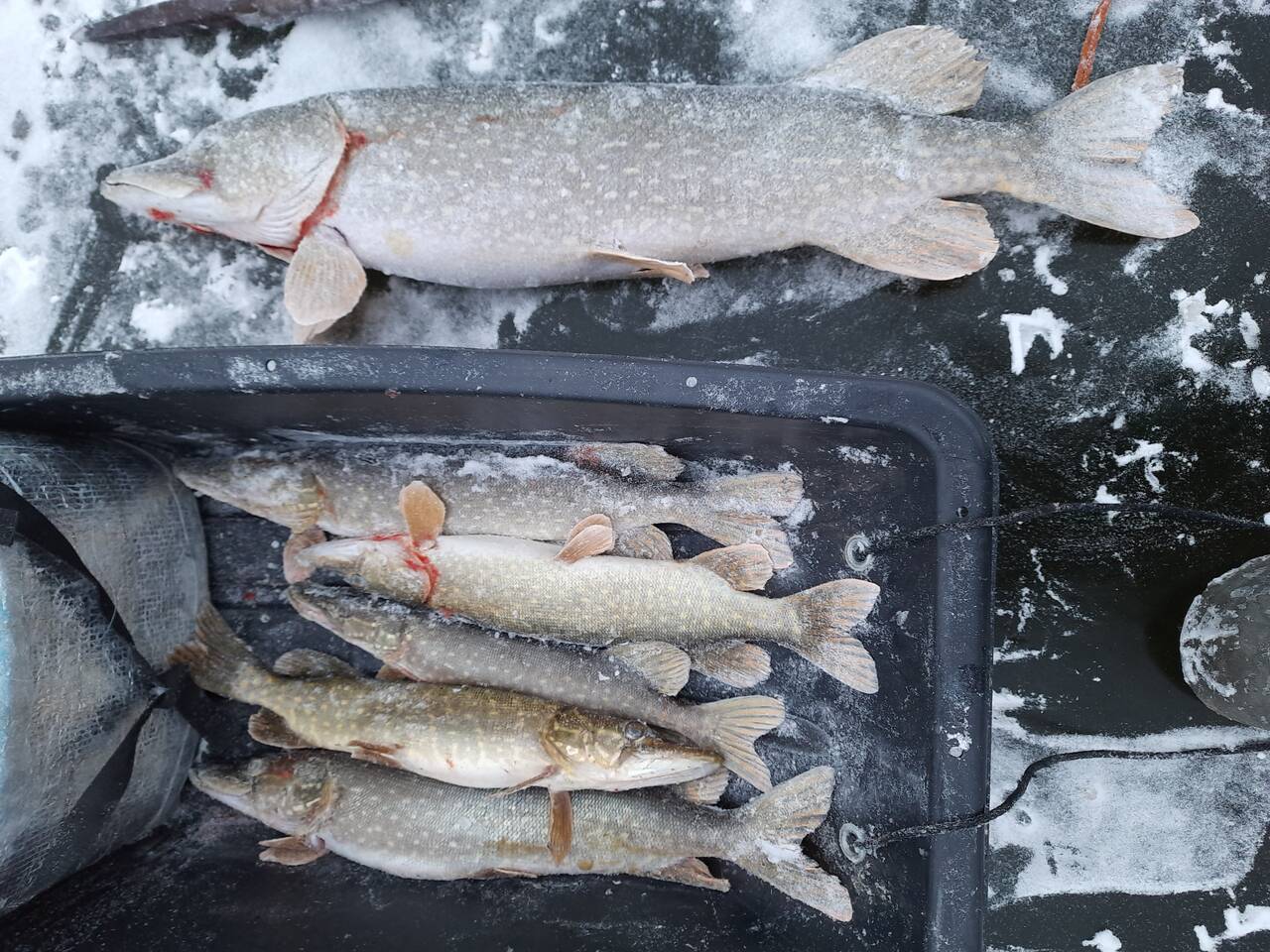 Ставлю 2ю жерлицу, а на первой уже поклевка. В общем пока вдвоем расставили 16 жерлиц поймали 10 щук. Одну амнистировали, а остальныей от кило до двух в санки. Итог 10-10.