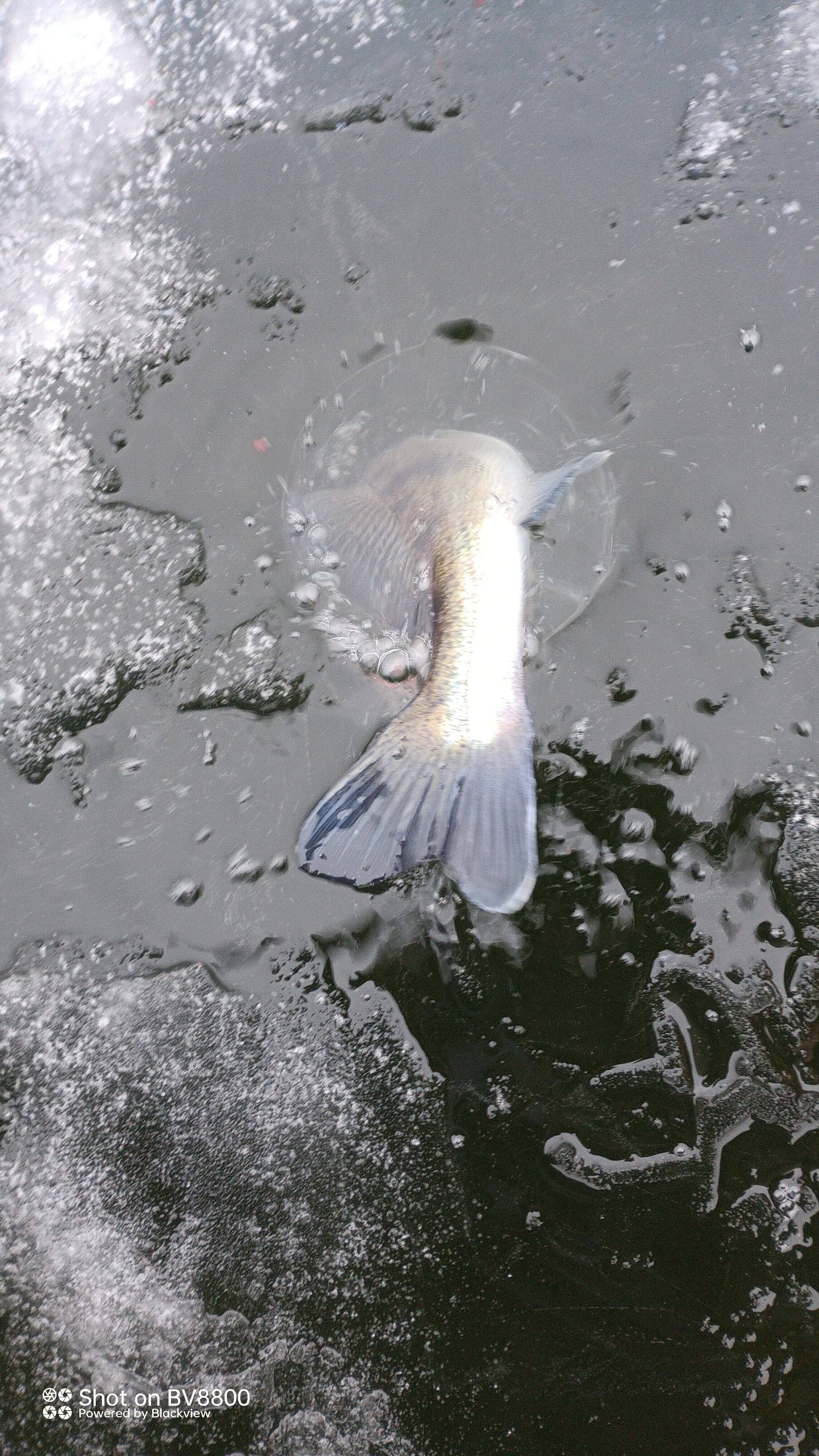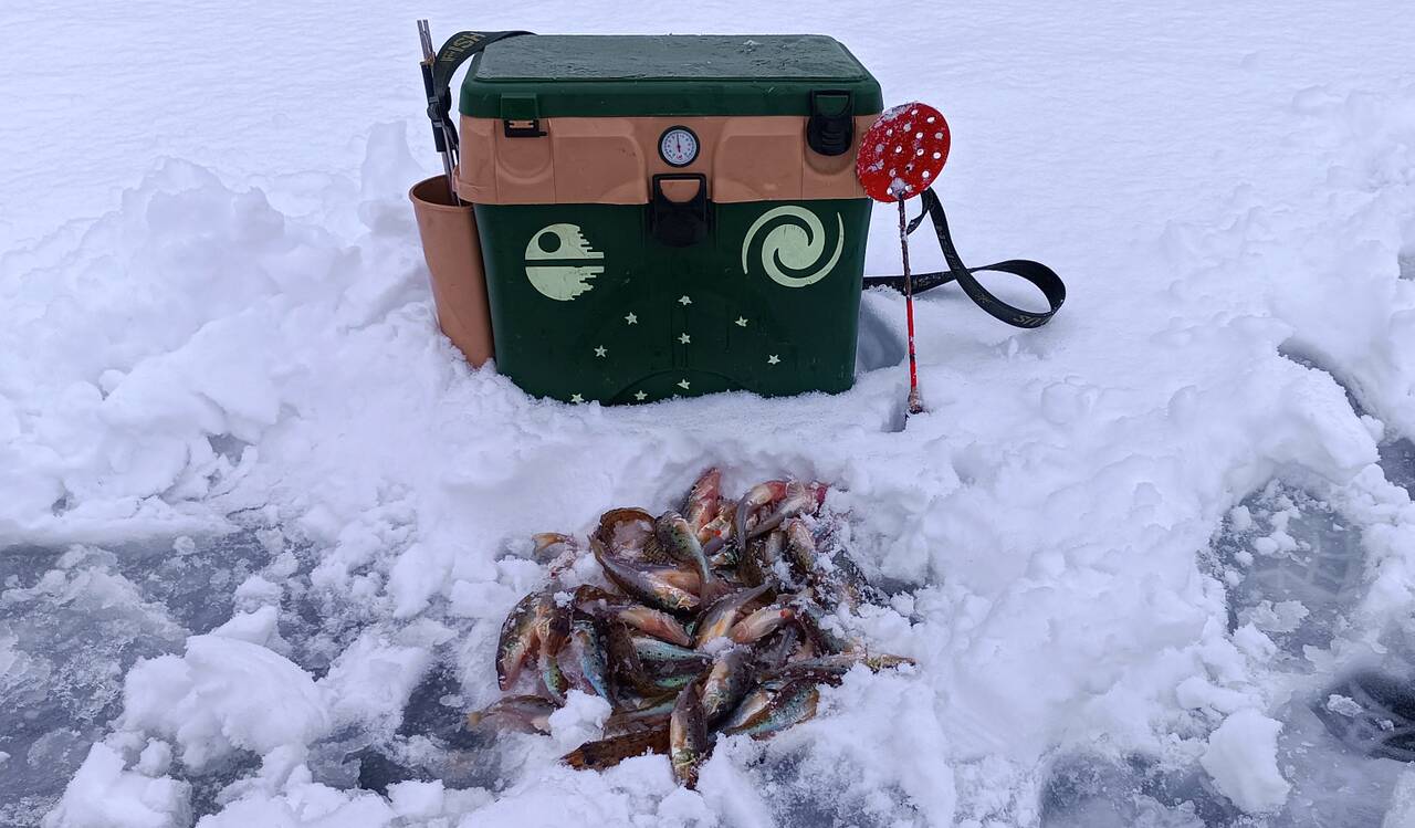 Правда выехали поздновато, так как я был с ночной смены и у напарника какие-то дела были. В общем приехали и начали место искать, народу много, в толпу переться ни стали. Первым разловился напарник, у меня же первые несколько поклёвок увенчались откусаными мормышками, просто я ни ожидал что роташка прям такой весёлый. Я однажды ловил его, но он был мельче. А леночка то у меня тонкая, решил привязать тонкую струнку, ну и вроде наладилось. После обеда погодка поменялась, подул ветер и рыба стала менее активна, приходилось искать. Одна две с лунки и снова бурить, но на Сковородочку наковырял.