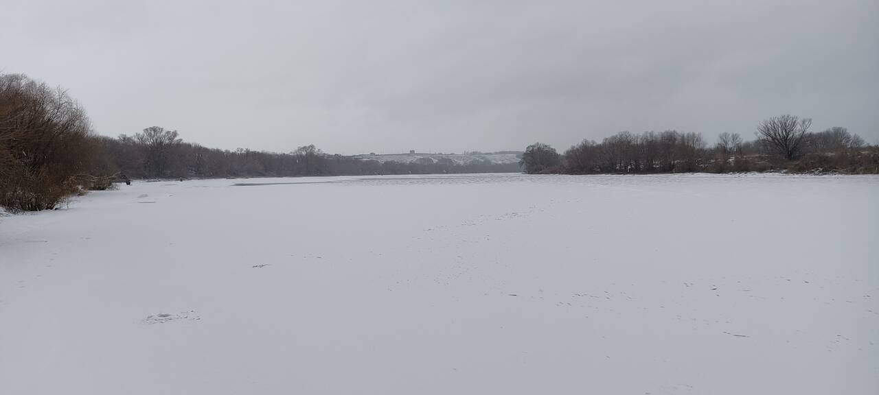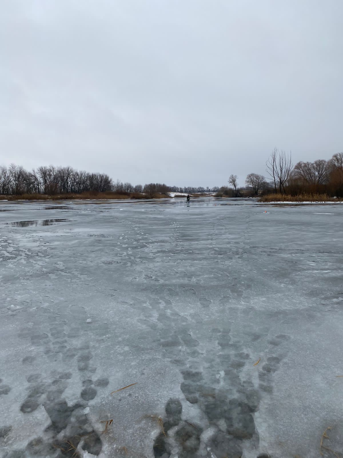 День второй: решил попробовать найти мирную рыбу. Сначала отправился в Гремячье на яму. Прибыв на место, обнаруживаю полное отсутствие следов человека. Ни по дороге никто не ездил, ни по льду - не ходил. Пробую бурить – 12-15 оборотов. Выдержит! Сделав порядка 15 лунок приступаю к ловле. Не клюёт. Даже касаний нет. Откуда-то прибежали две здоровенные лохматые собаки, которые весело носились вокруг и чуть не стащили у меня удочку. Выхожу ближе к течению. Подо льдом - шуга, которую «прокачать» не удаётся. Пробую уйти чуть ниже по течению, но там лёд совсем тонкий, рисковать уже не стоит. Собрал вещи и поехал к понтону, попробовать половить бирюка.