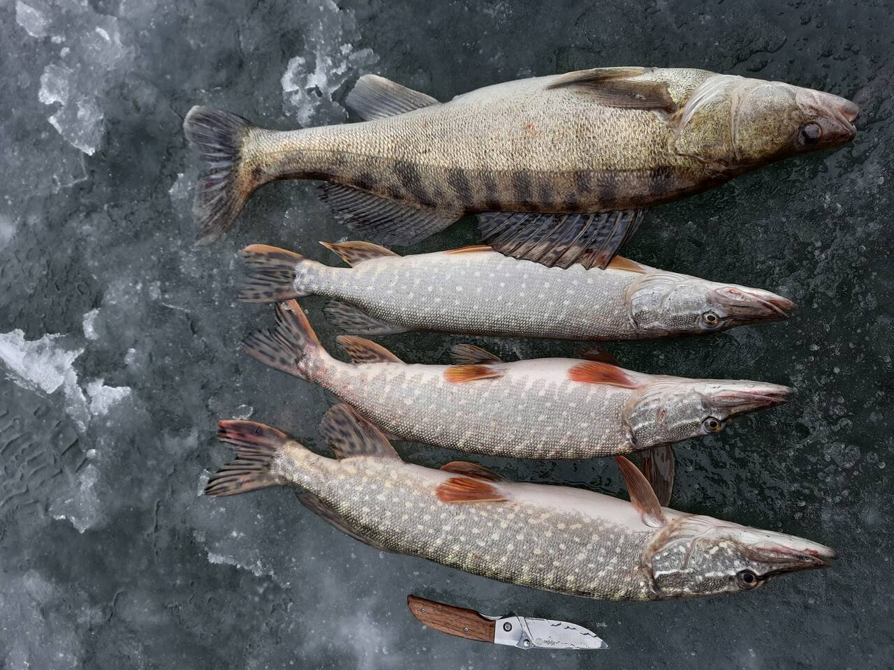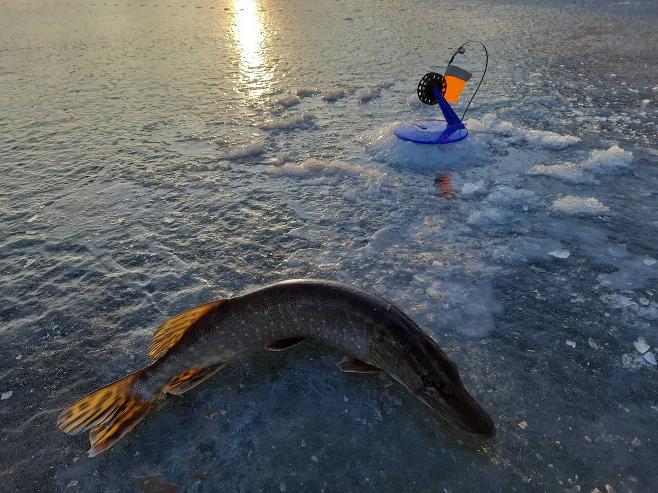Пока город видит последние сны перед рабочей неделей, я уже бурю лёд. Сегодня поленился и взял шурик. Еще в темноте клюнул небольшой клыкастый на 1,6. На глубине 3,5м почти под берегом. Вот не ждал его там! Затем на рассвете из этой же лунки достаю закилошную щучку. Через час здесь же ещё поклевка, но теперь мимо. Не всё коту творог. После 10-00, когда солне начало слепить, хыщник проснулся. Ох, и набегался я! 6 подряд поклевок и все мимо. Лишь напоследок удалось зацепить полторашку.