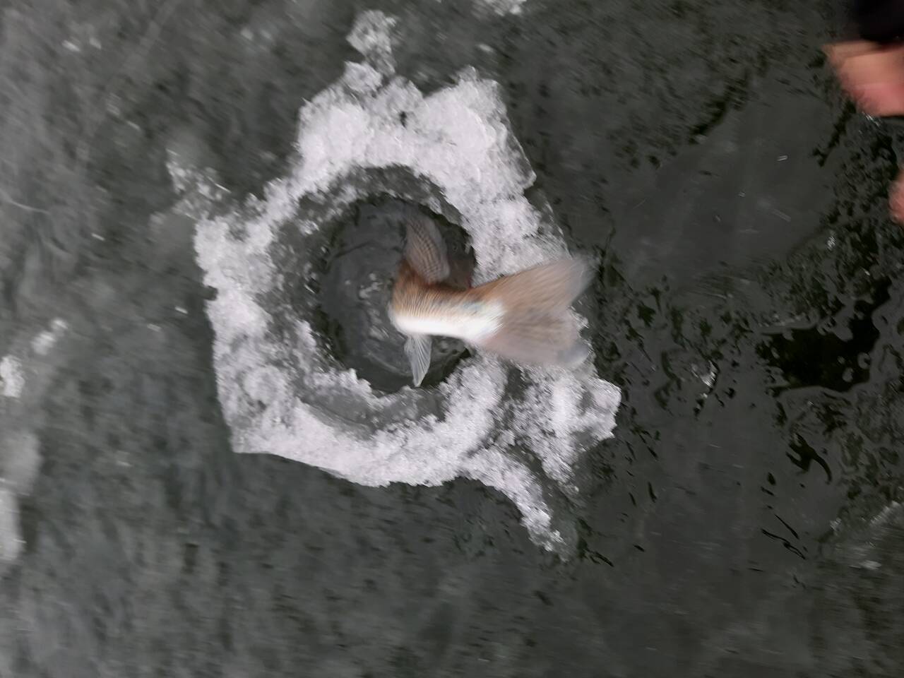 В 2 смотались,на двоих десяток съедобных,да плюс я одну подтрешку слил. Голову высунула из лунки и срезала леску,рефлекторно руку в лунку по локоть,но лишь погладил. Хорошо в Делике рукавицы запасные лежат.