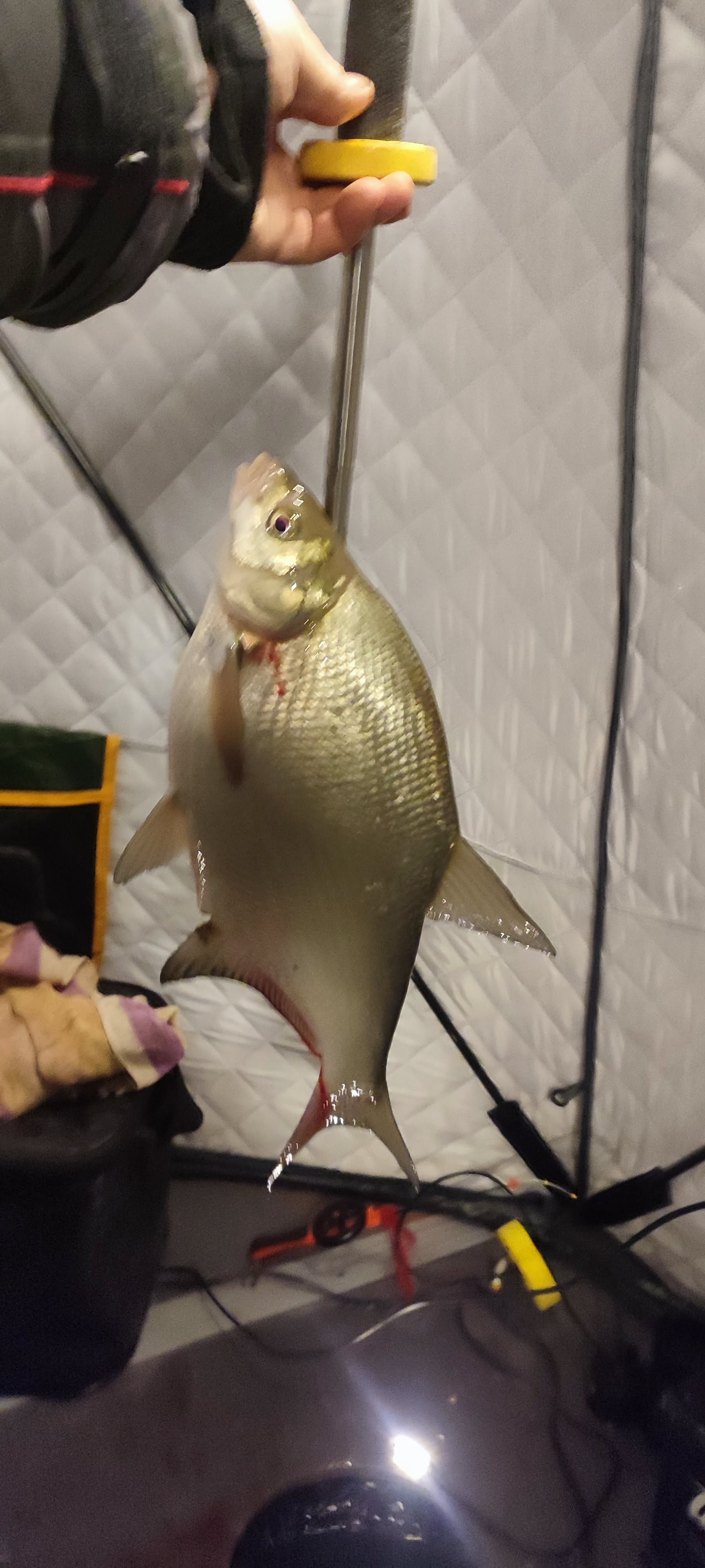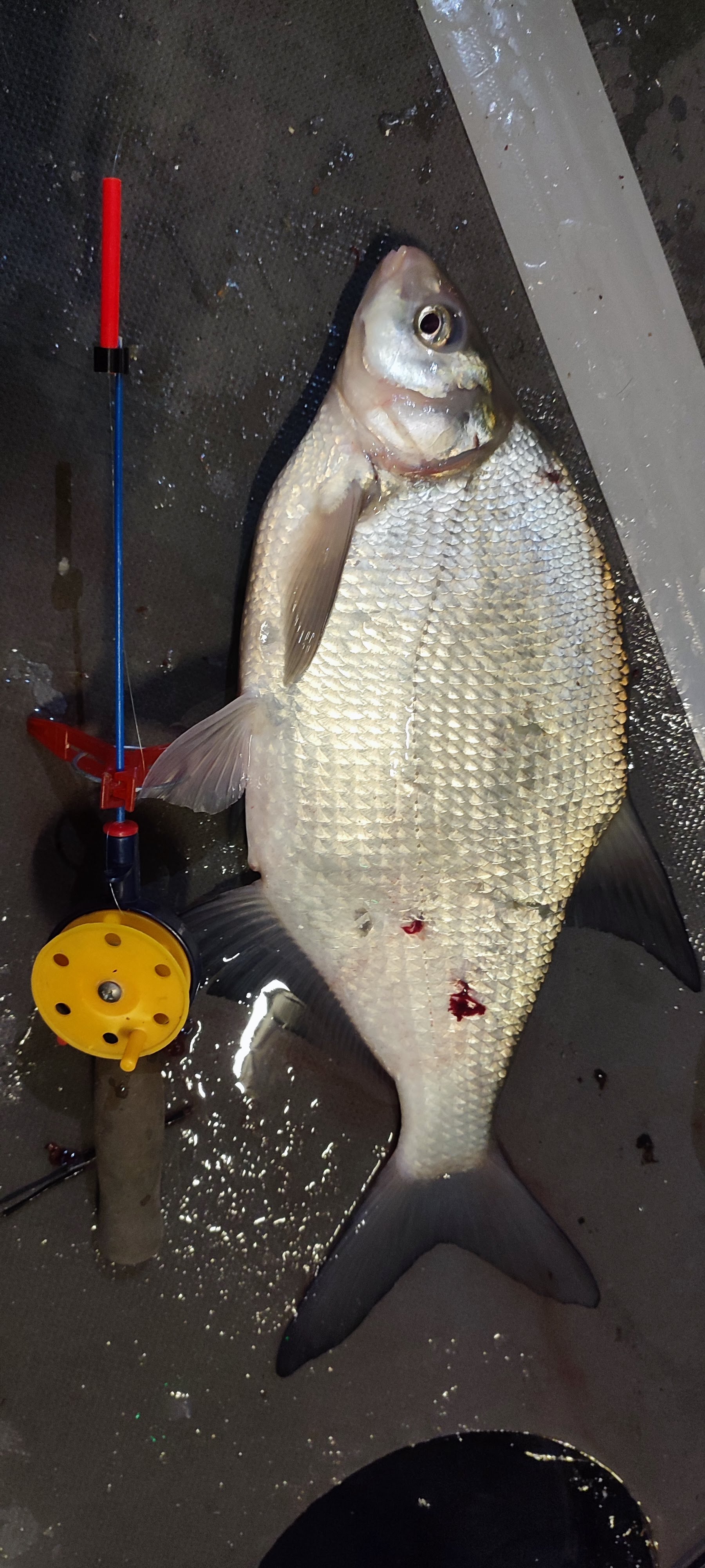 Ожидание поклевок затянулось, кивки шевелились только свежим ветерком. У Юры уже есть результат - оклокилошный " подлец" на игру, на подвесной крючок. Наконец выпрямляется кивок и у меня, при вываживании рыба почти не сопротивляется и только у лунки по тяжести становится понятно, что это неплохой подлещик. Начало есть! Затем на игру спортивной мормышкой попадается ещё три плоских граммов по 600-700, на стоячую очень редкие шевеления с пустыми подсечками. Ветерок мешает ловить и пробует забраться под куртку. Лунка постоянно замерзает, превращаясь из 130 в 100. Вновь поклёвка на игру, рып свободно даёт поднять себя почти до льда и перед самой лункой начинает нехило бодаться, 0,08 лесочка звенит, раза три пришлось стравливать! Не без труда, всё-таки подвожу Лёшу к поверхности, а он в померзшую лунку не проходит! Пришлось лезть в ящик за багориком и пропихивать рыбу "через чужую". На взгляд плоский около кило двести! Мой рекорд этого ледового сезона.
