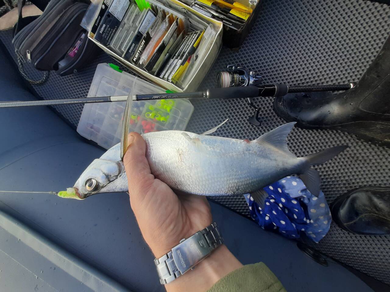, да хрен поймешь, приехал в обед начал ловить- клюет и не плохо! Потом гроза мелкодождь и все, я резину не пробовал сегодня, один раз рачка с 4 гр одел, но коробков спичечных не было.