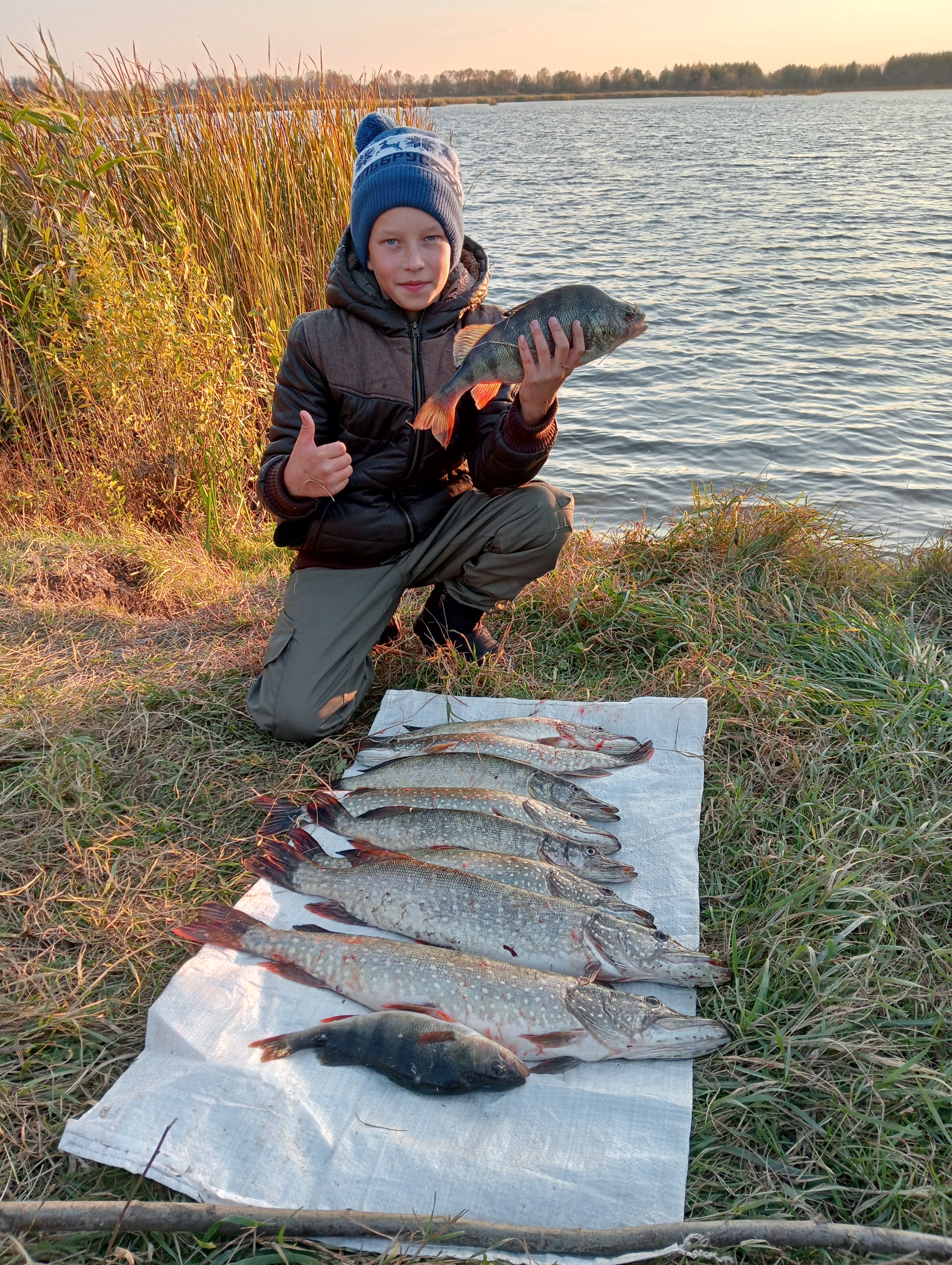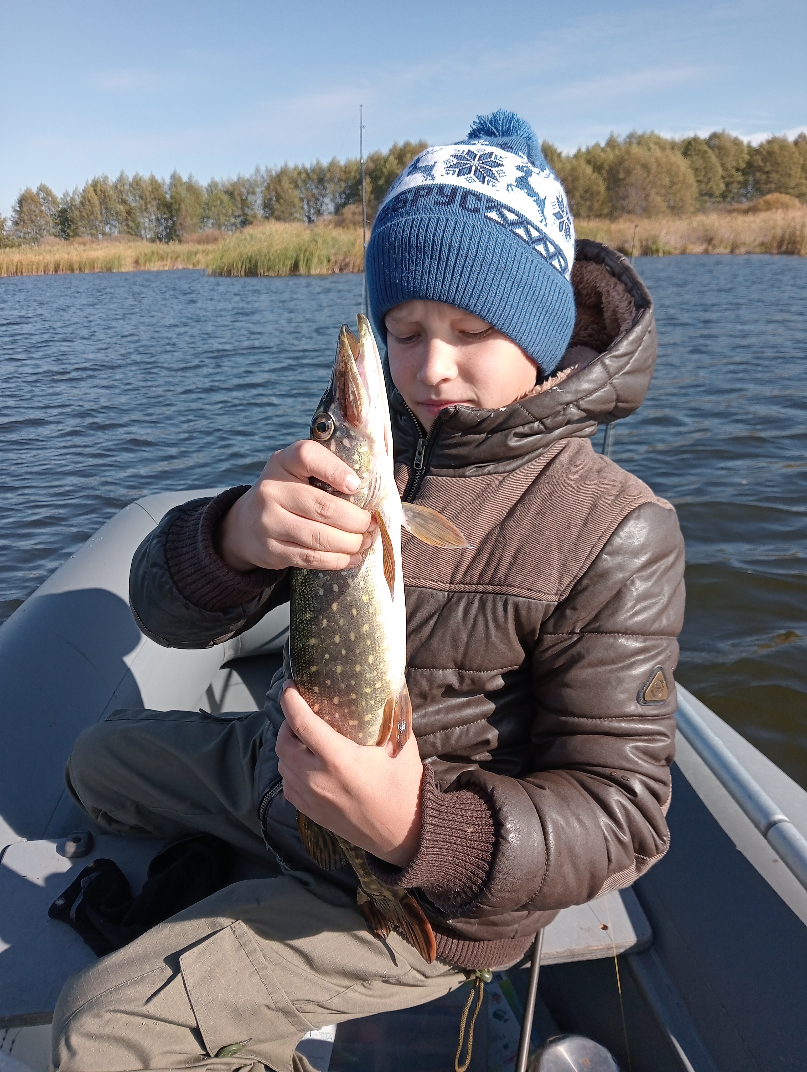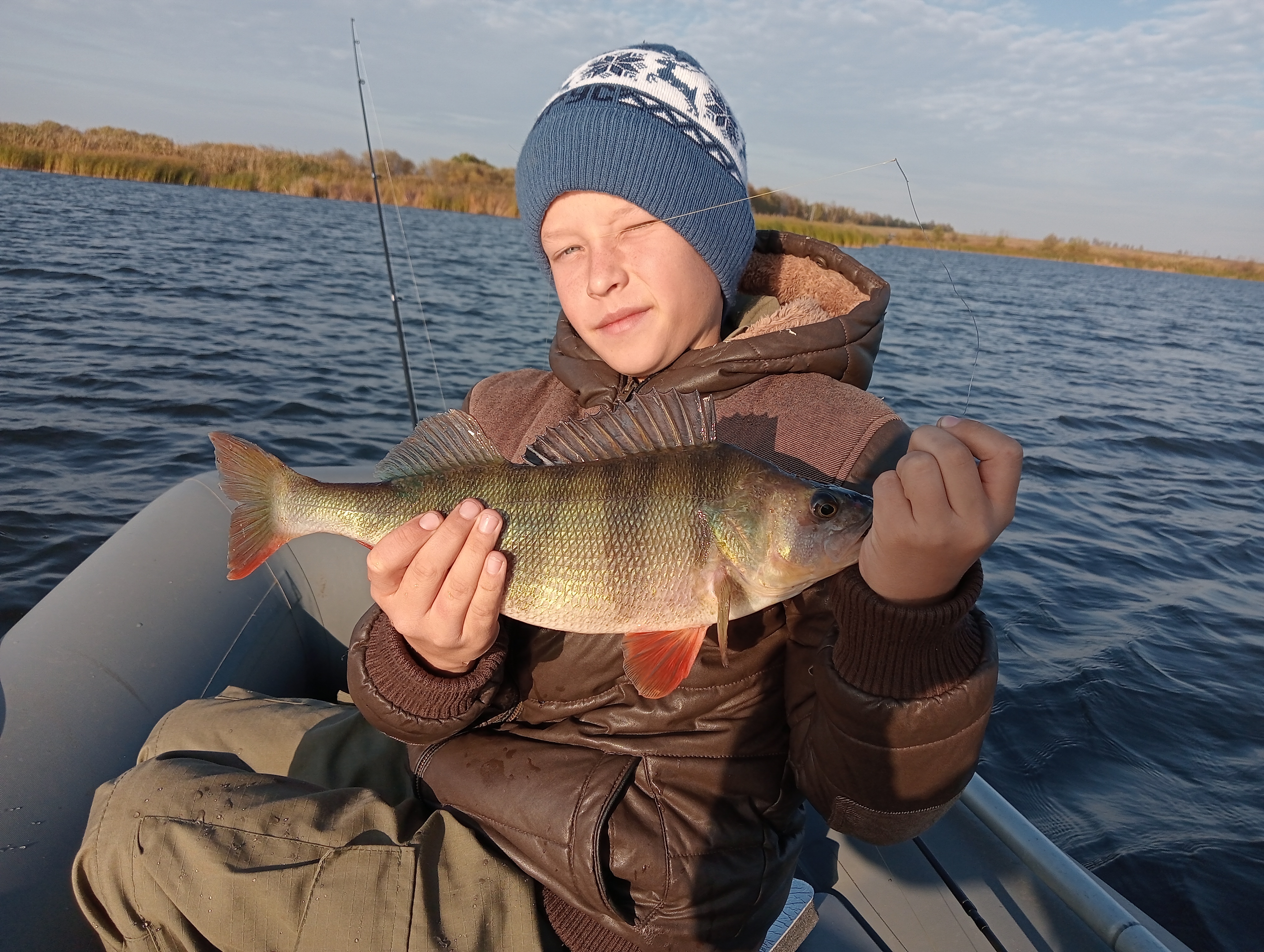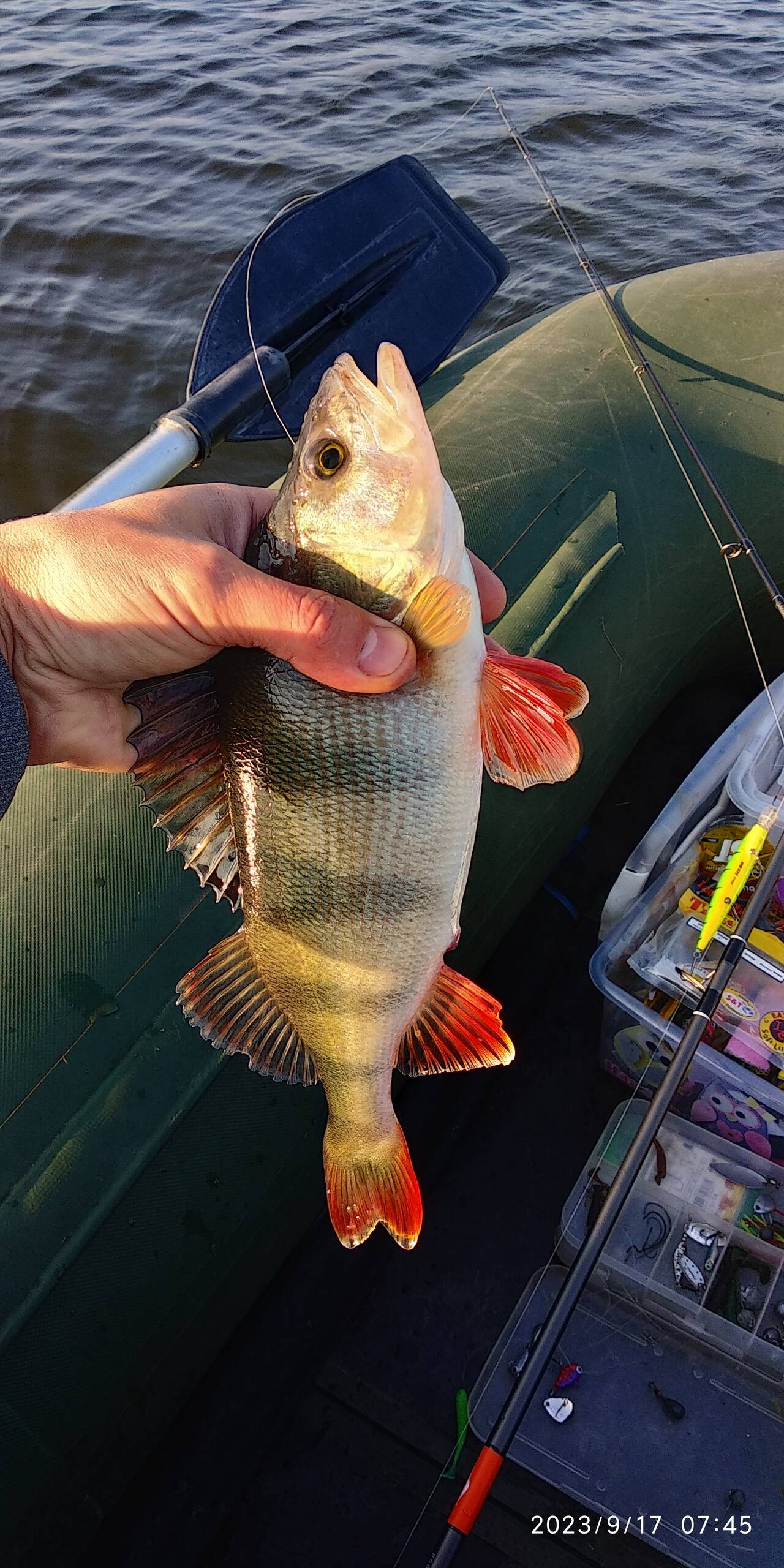 Привет всем коллегам по увлечению. Вчера наконец то сошлись все звёзды и я смог уделить выходной рыбалке. Немного помучавшись с выбором места, решил всё же испытать новый для себя пруд ,где по открытой воде ловить не приходилось. Зори уже холодные, поэтому решил особо рано не начинать. Выплыл в седьмом часу, когда солнце уже немного грело. Пообщавшись с одиноким коллегой на воде, узнал что вчера неплохо, по его словам, тут кто-то отловился по окуню . Решаю щучьи дела отложить на потом, в приоритете полосатый. Собираю спиннинг, джиги, отводной, тейлы , цикады и на поиски . Но как говорится вчера ,не сегодня. Поиски идут, эксперименты тоже, а аппетит у окуня не просыпается, не считая трёх полуладошечных ,которых за борт. Снова смена места, попадаются пару едовых и наконец то он, кого приятно повываживать.