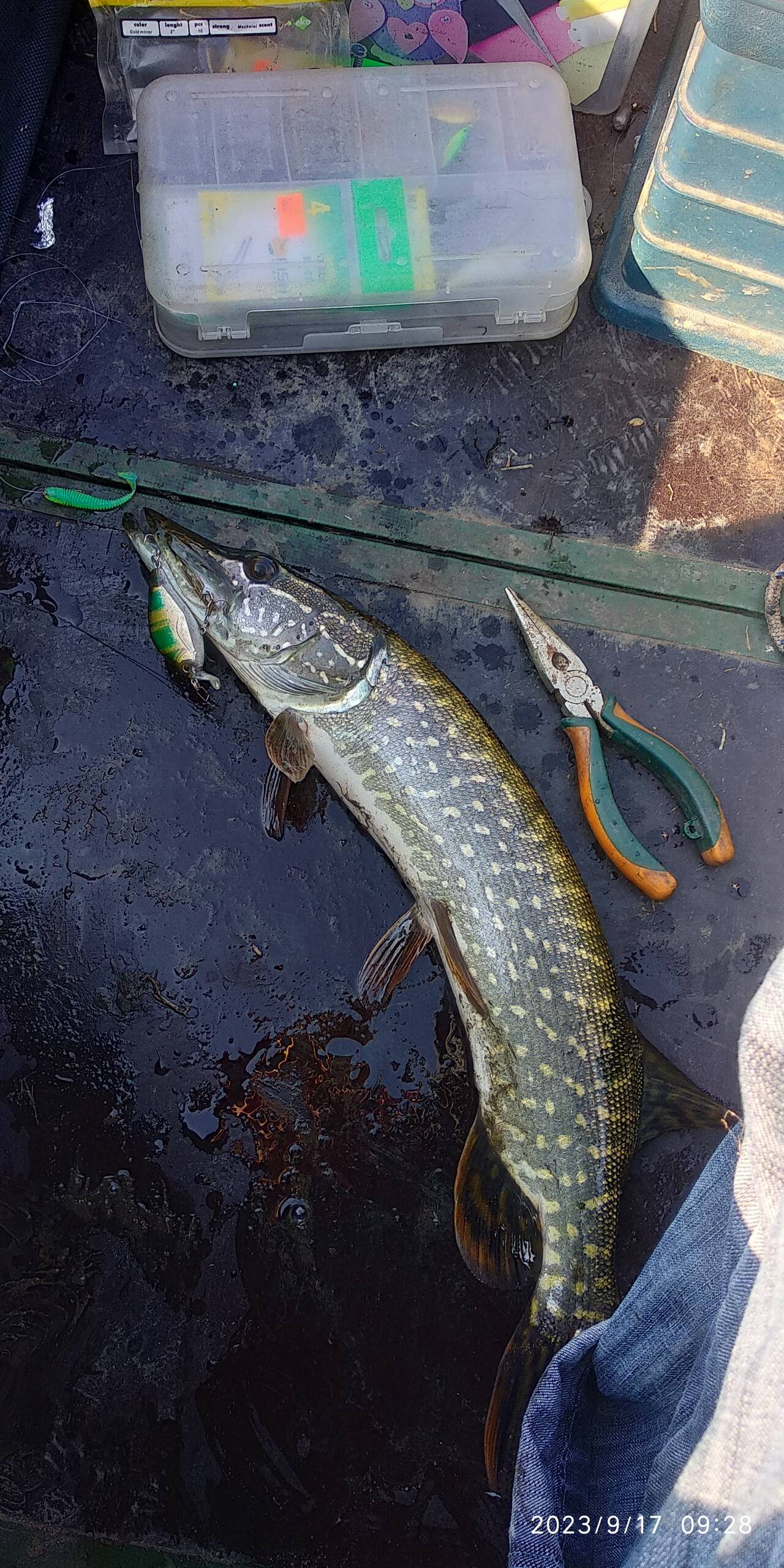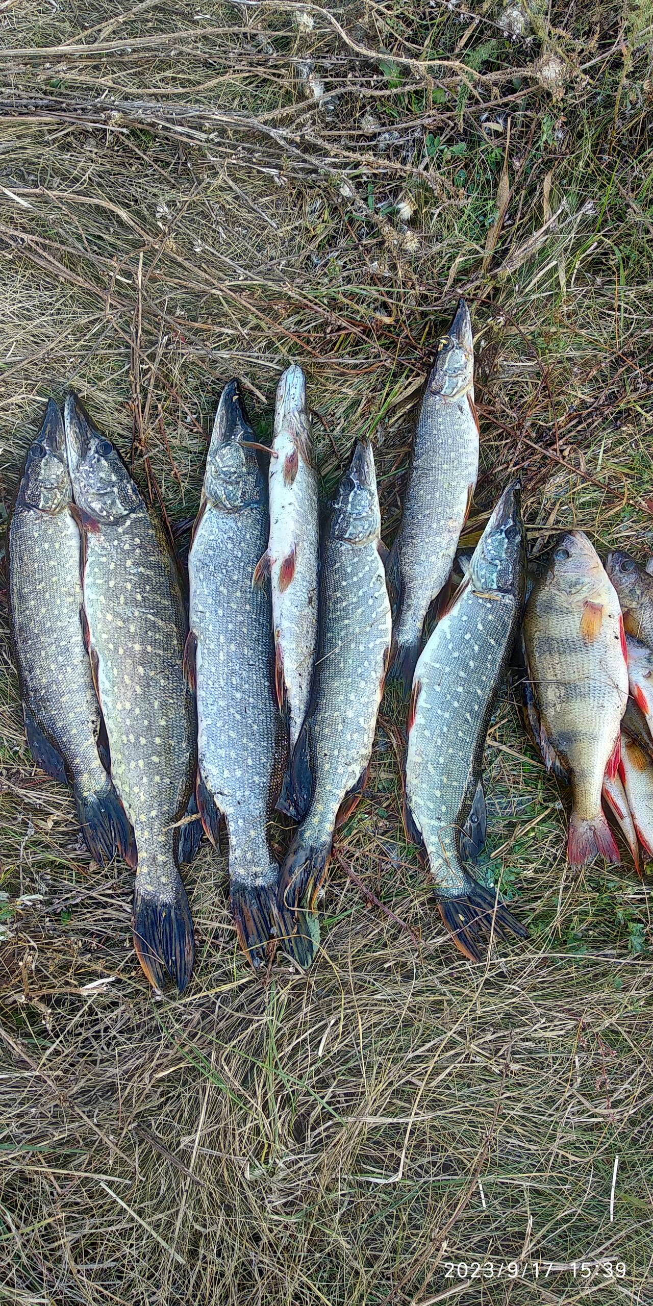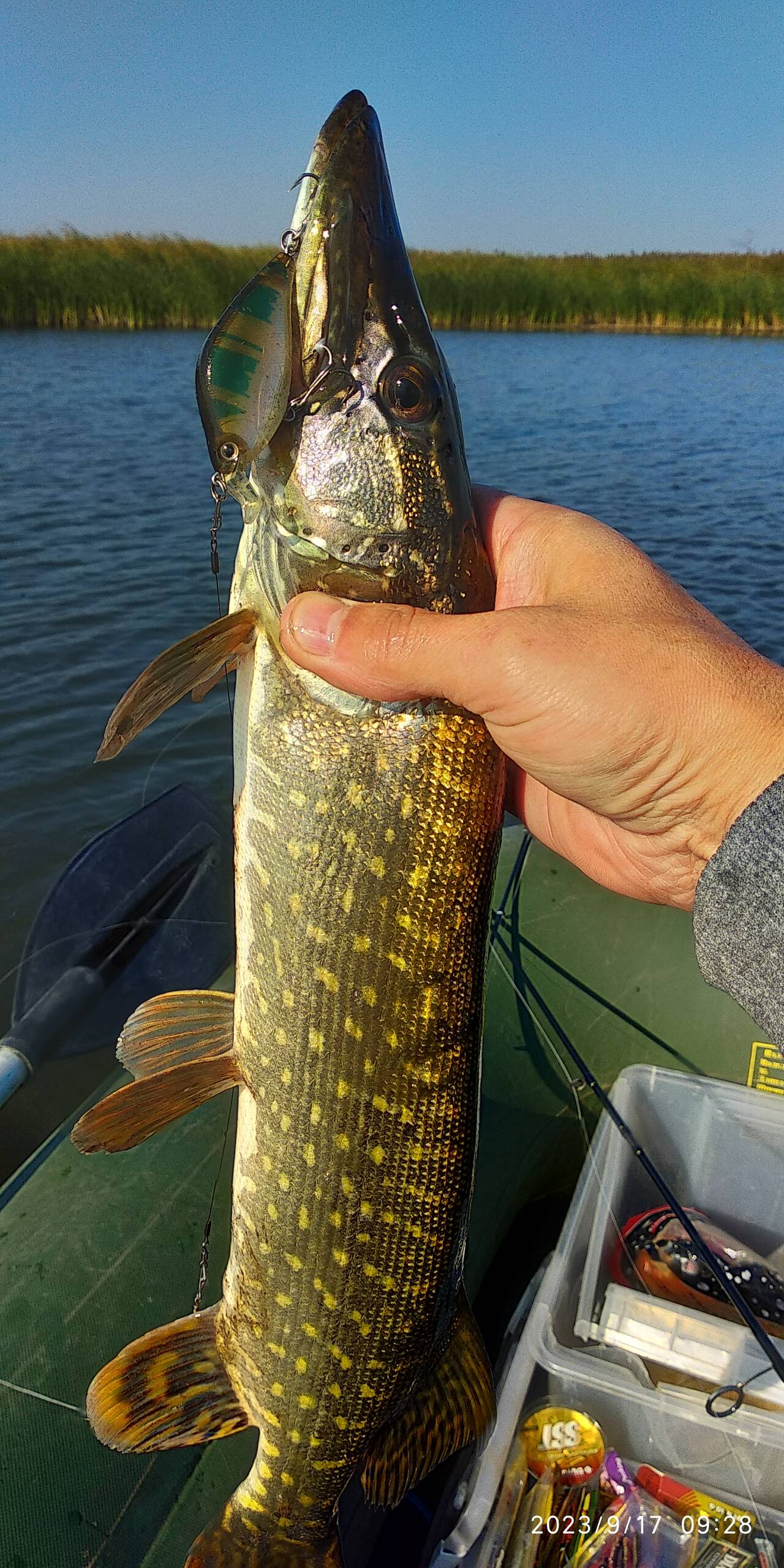 Появилась надежда что нащупал место и подобрал приманку, но к сожалению не случилось. Минут пятнадцать на точке с перебором приманок ничего путного не дало. Все в основном обратно в воду, с изредка проскакивающими условно съедобными. Время начало десятого, окунь все реже и реже отзывался, даже мелочевка. Оптимизм поубавился и возникла мысль подразнить зубастую. Условия конечно не идеальные для комфортной ловли где она трется. Прибрежный камыш , мелководье, с подводной растительностью и травой на поверхности. Есть опыт успешной ловли на другом пруду с похожими условиями и поэтому муки с перебором приманок не было. Упор решил сделать на Ю-Зури 55 флет кренк, с которым у меня давно получилось "подружиться". Ну и как говориться:"-Ваша ставка сыграла." С первого же заброса поклевка, но не засеклась. А дальше началась азартная охота с выманиванием зубастой из укрытий. На первой же точке из пяти забросов, четыре результативные. Рыбалка конечно получилась в основном спортивная, основная масса обратно в стихию, хотя об этом ни капли не жалею, просто коллекционировал поклевки. Так до самого отъезда патрулировал вдоль берегов пруда, щука присутствовала везде, на каждой постановке для поимки хватало максимум 2-3 заброса. Чередовал с отводным под окуня, но в этот день видимо не судьба. Одолели вот такие бандиты размером с воблер, к второму десятку сбился со счета.