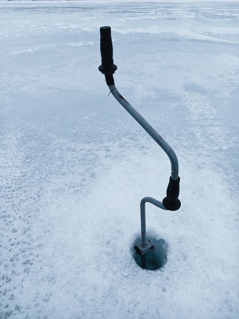 Осторожно пробираюсь поближе к кромке льда. Ледобур уверенно вгрызается в лёд и на 6 обороте проваливается вниз. Не так всё и плохо – лёд выдержит.