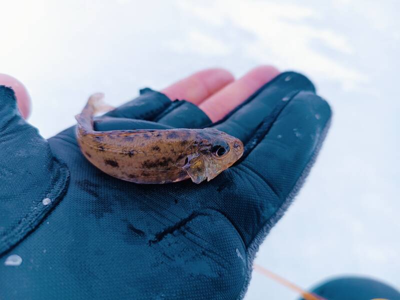 Помыкавшись недолго с мормышкой и не получив ни одной поклёвки, решил перейти на мелкие блёсны, с подвесным тройником. И на первом же взмахе получаю уверенный удар! С лёгким волнением тащу леску из лунки и вот на поверхности показалась первая Палия. Пятнистая, с мелкими зубами, ярким оранжево-жёлтым брюшком и крайне недобрым взором, несмотря на скромный размер. Настоящий хищник! Красивый и смертоносный.