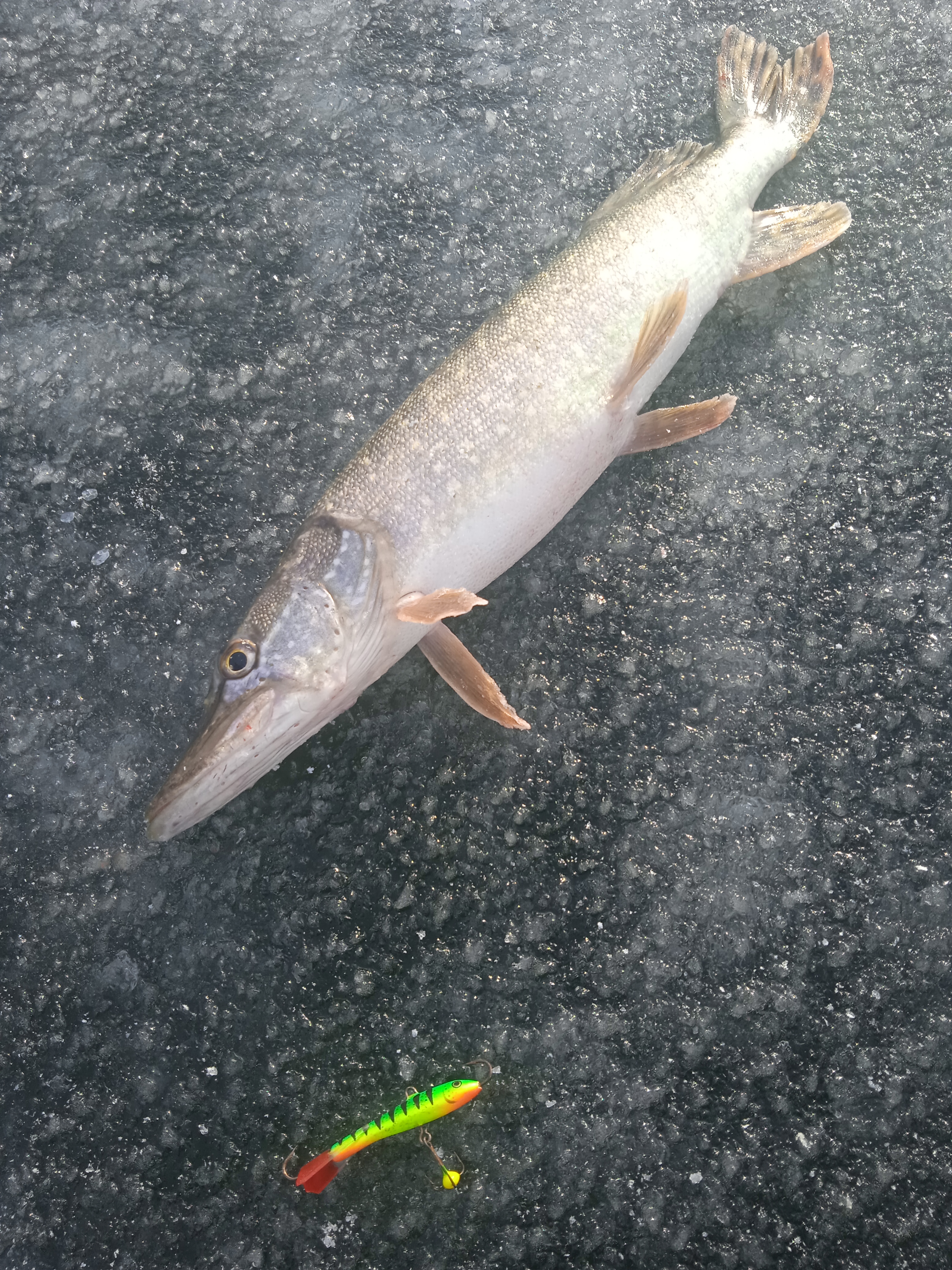 Пока я откапывал и разворачивал Делику ,жарил мясо, сын поймал ещё трёх щук и одного окуня на балансир. И по его глазами понял ,что ему теперь придётся покупать такую же удочку.