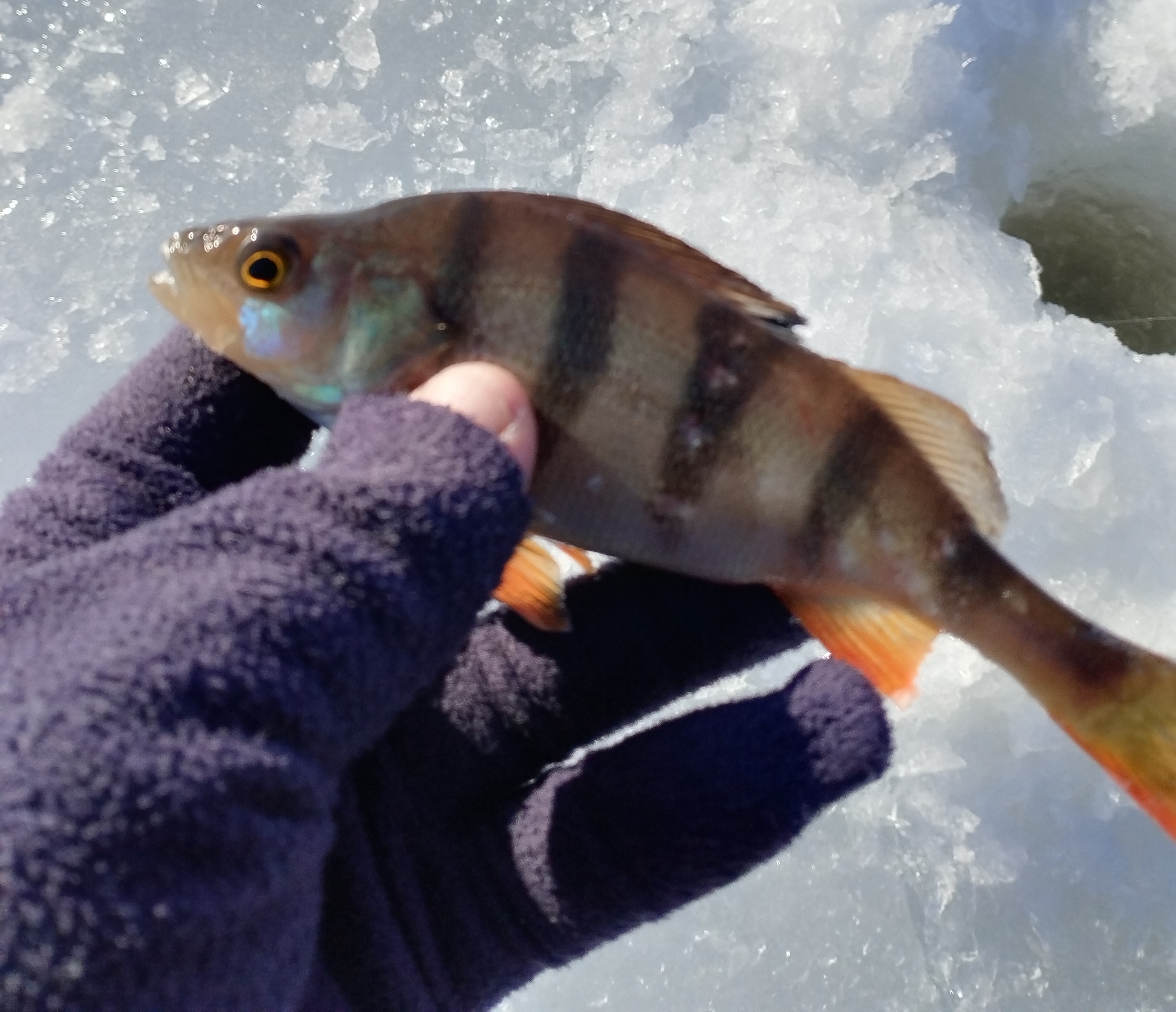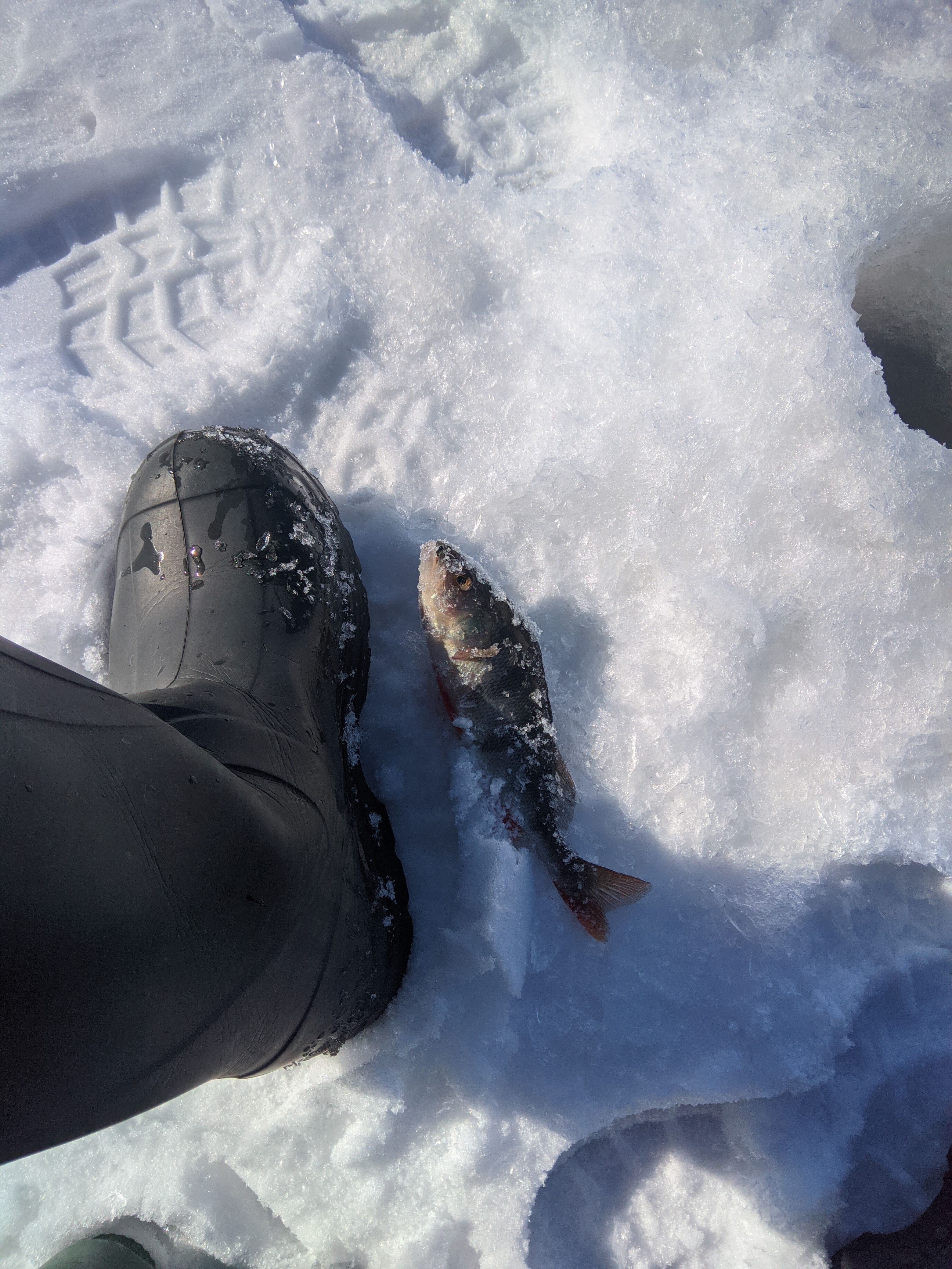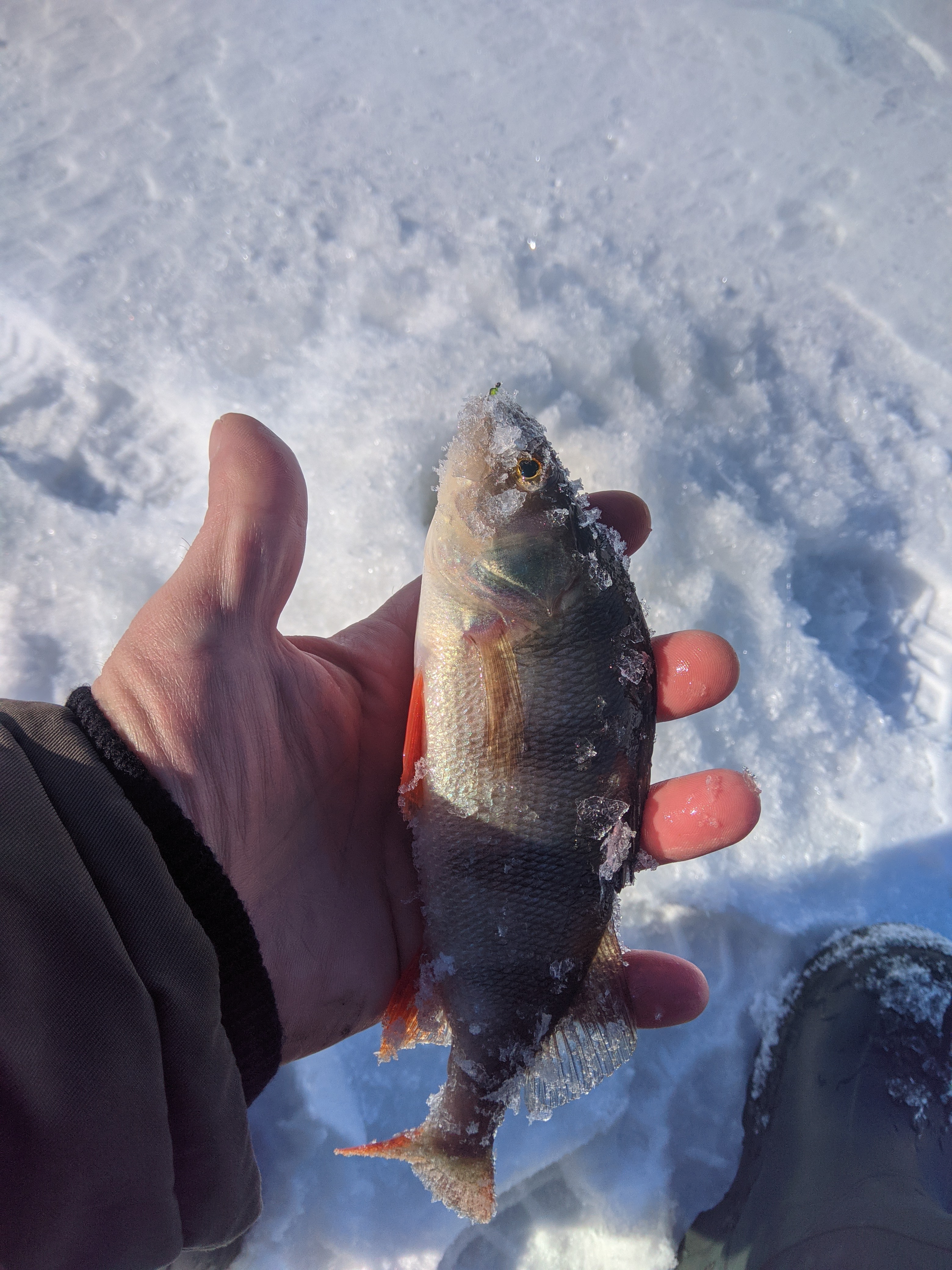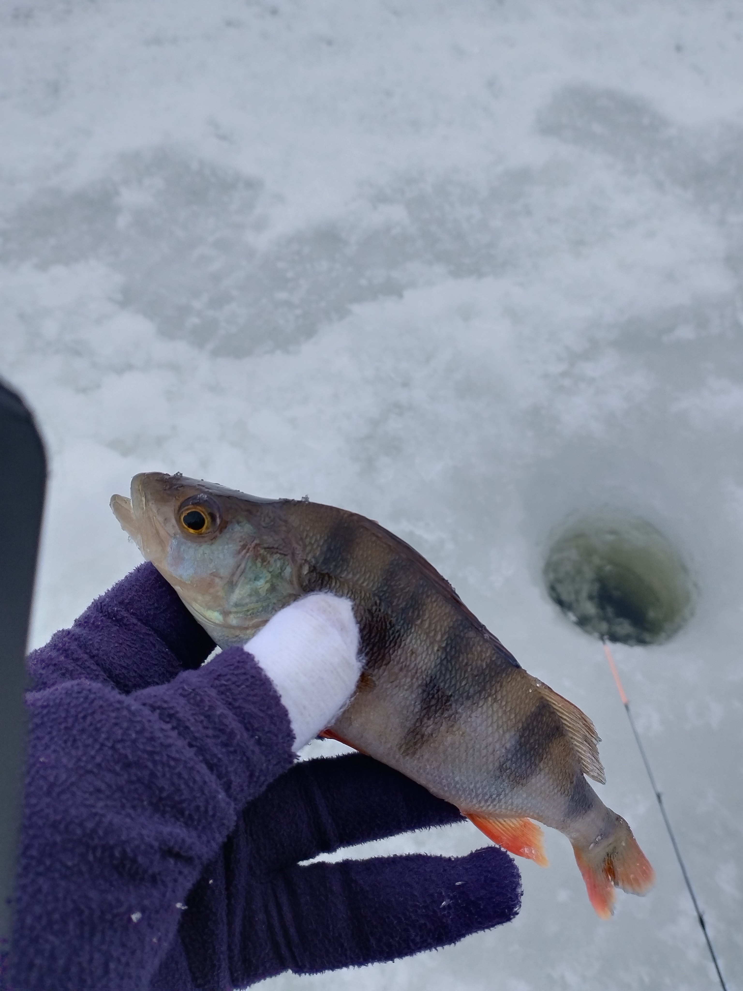 Перешел на другую сторону чуть дальше, и в первой-же лунки окушок. Достал потом безмотылку, так до конца на неё и ловил. (гвоздешарик).