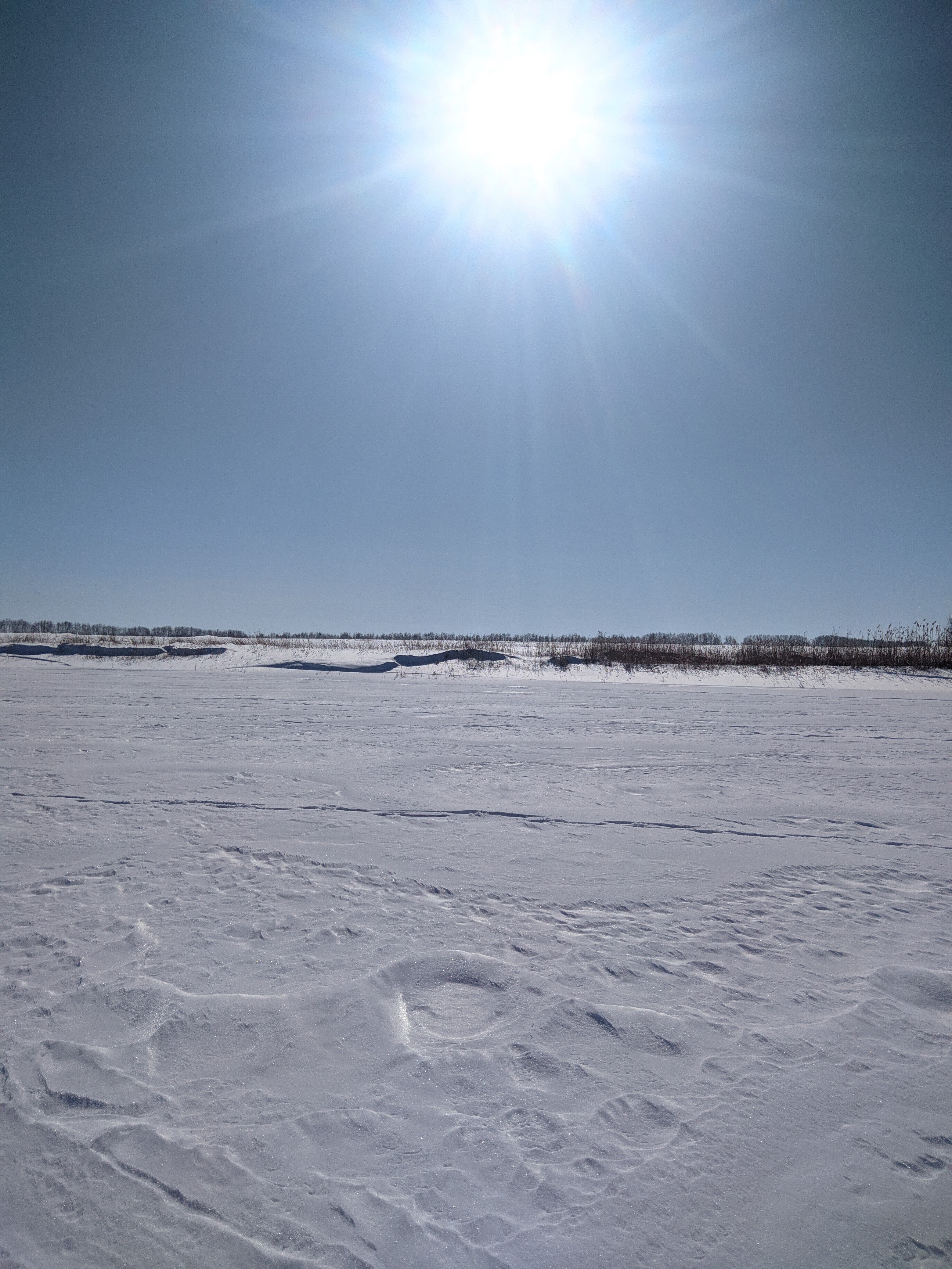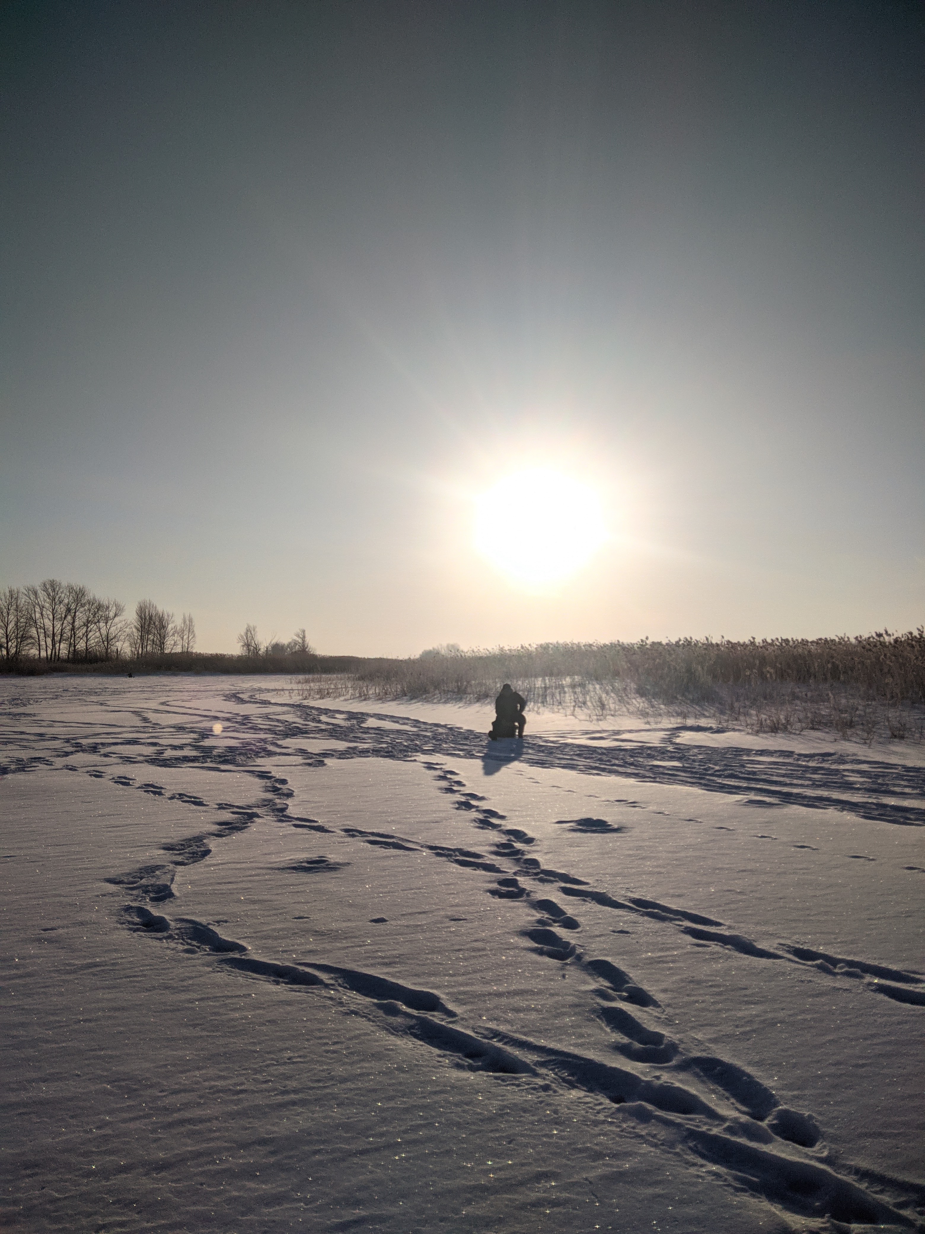 Итак. Раннее утро, где-то за горизонтом медленно разгорается заря, постепенно «прогоняя» одинокую звезду на небосклоне, небольшая позёмка лениво тянется через поле. Пруд ещё укрыт отрешённой темнотой и поразительно умиротворён. Снега на льду совсем не много, ноги не проваливаются и передвигаться очень удобно.