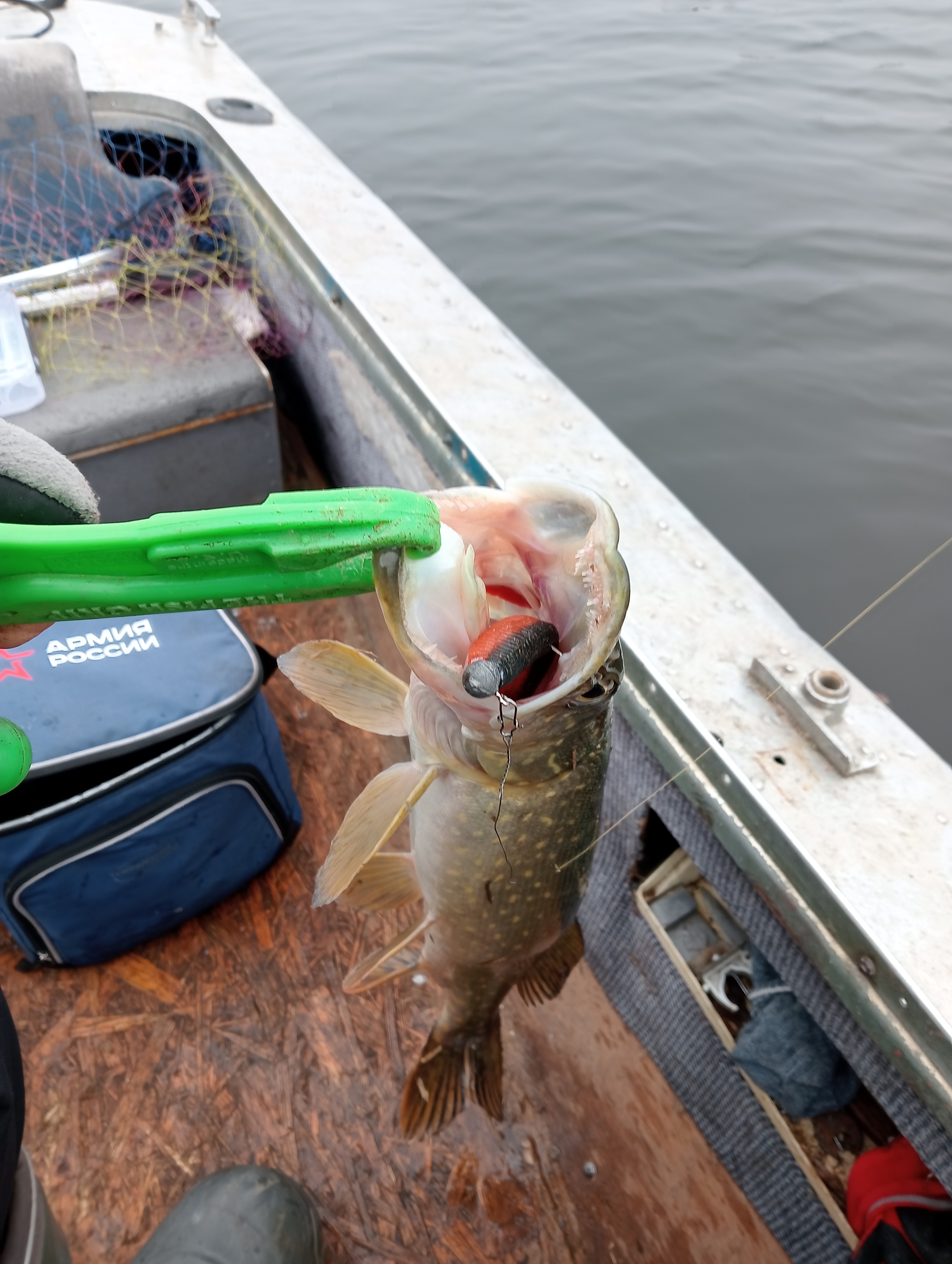Приветствую коллеги! Сегодня и мы с напарником бороздили водную гладь и даже разошлись с ним миром со счëтом 8-8, плюс по одной мелкой отпустили. Утро началось позитивно - первая поклëвка на колебалку, но мимо, ставлю вертушку мепс в пятом номере и сразу добираю проказницу на 2+. Далее через небольшой промежуток времени на лимонную варуну достаю ещё одну съедобную на 1+ и дальше тишина(не считая одного отпущенного шнурка и двух подряд холостых выходов съедобной щучки возле лодки) . Решаю сместится в начало водоëма, тем более там потише от ледяного ветра и это оказалось правильной мыслью, логово щук было найдено и в дуэте с подплывшим напарником мы начали запасаться на неделю адреналином