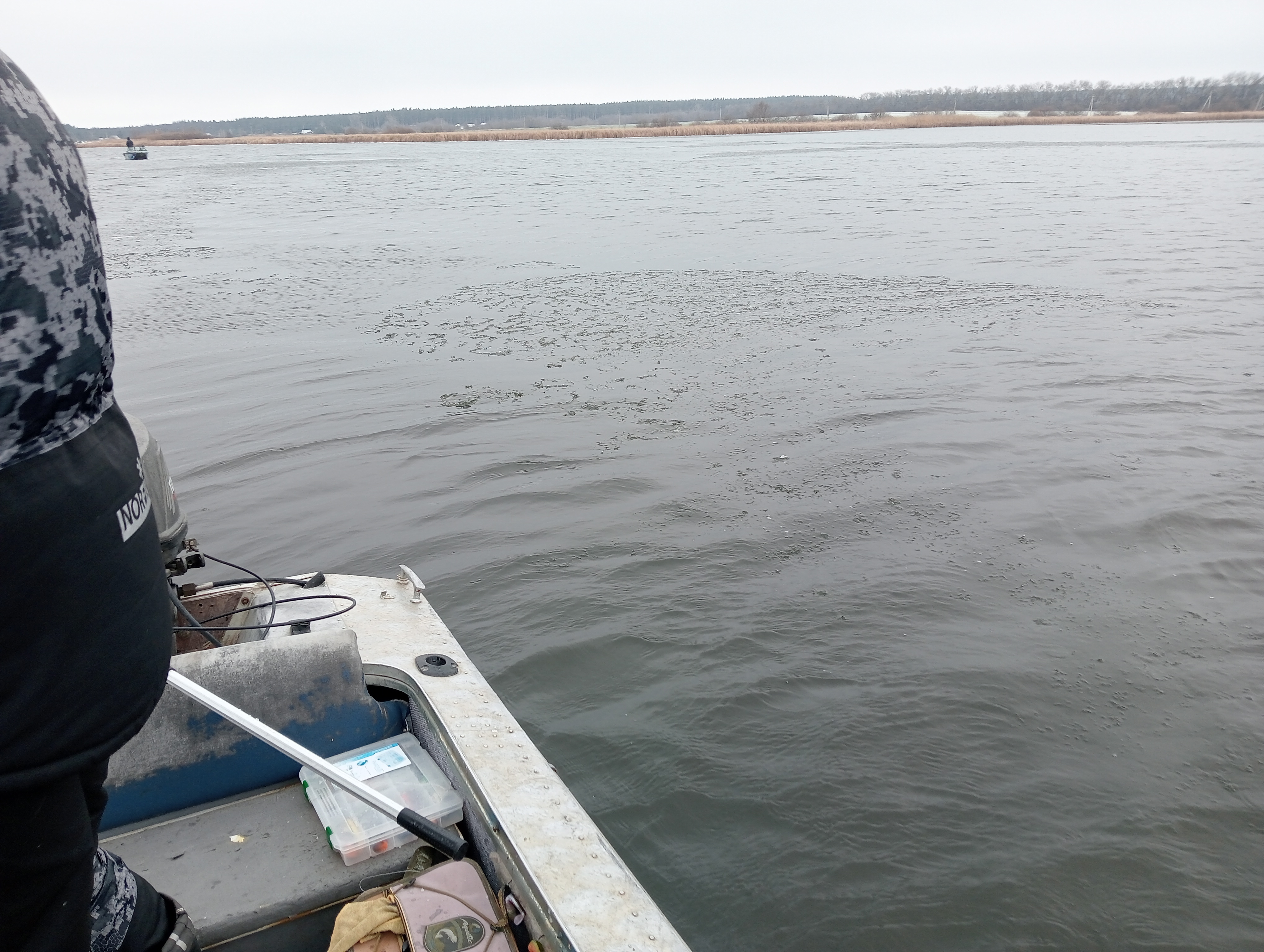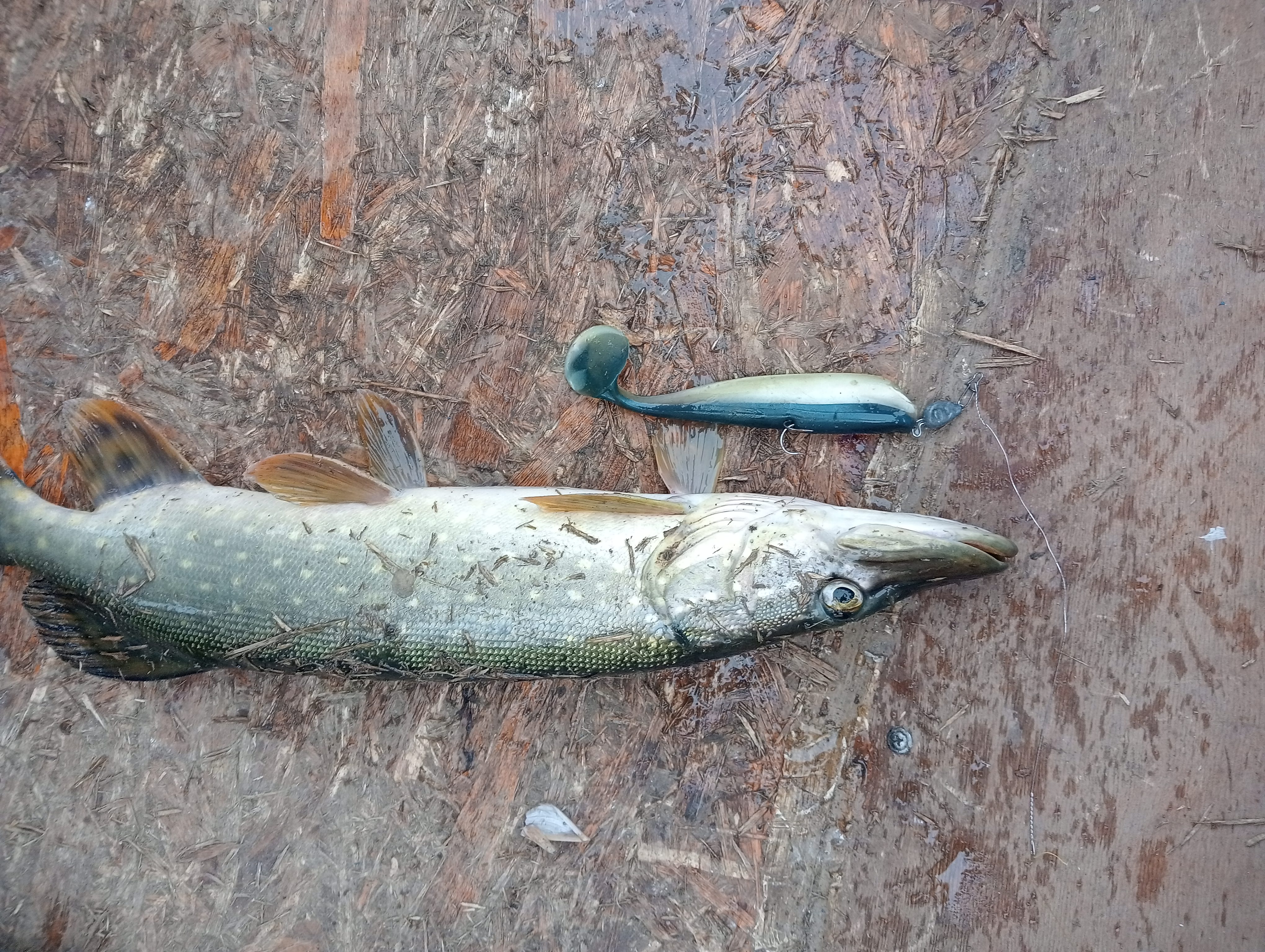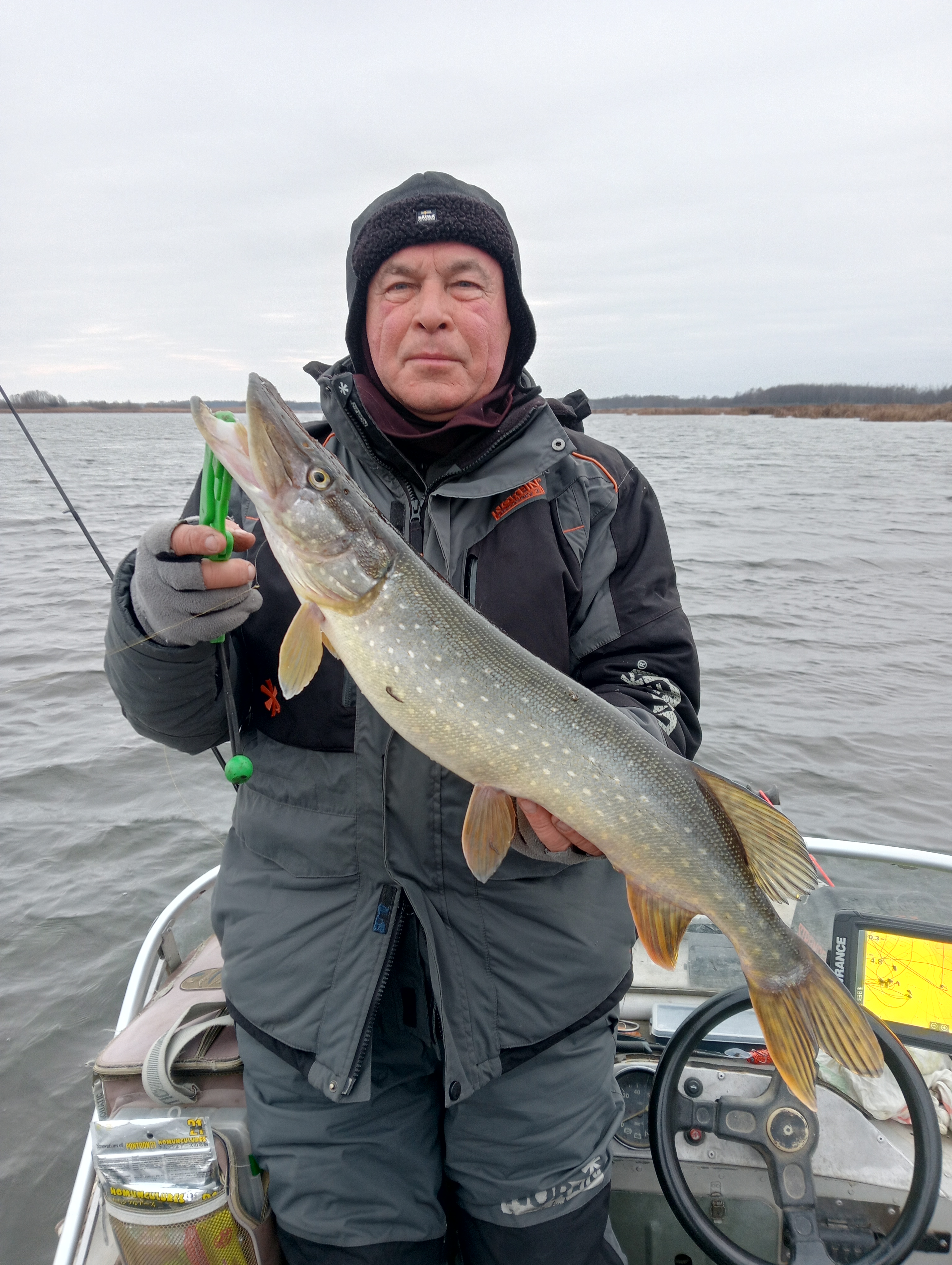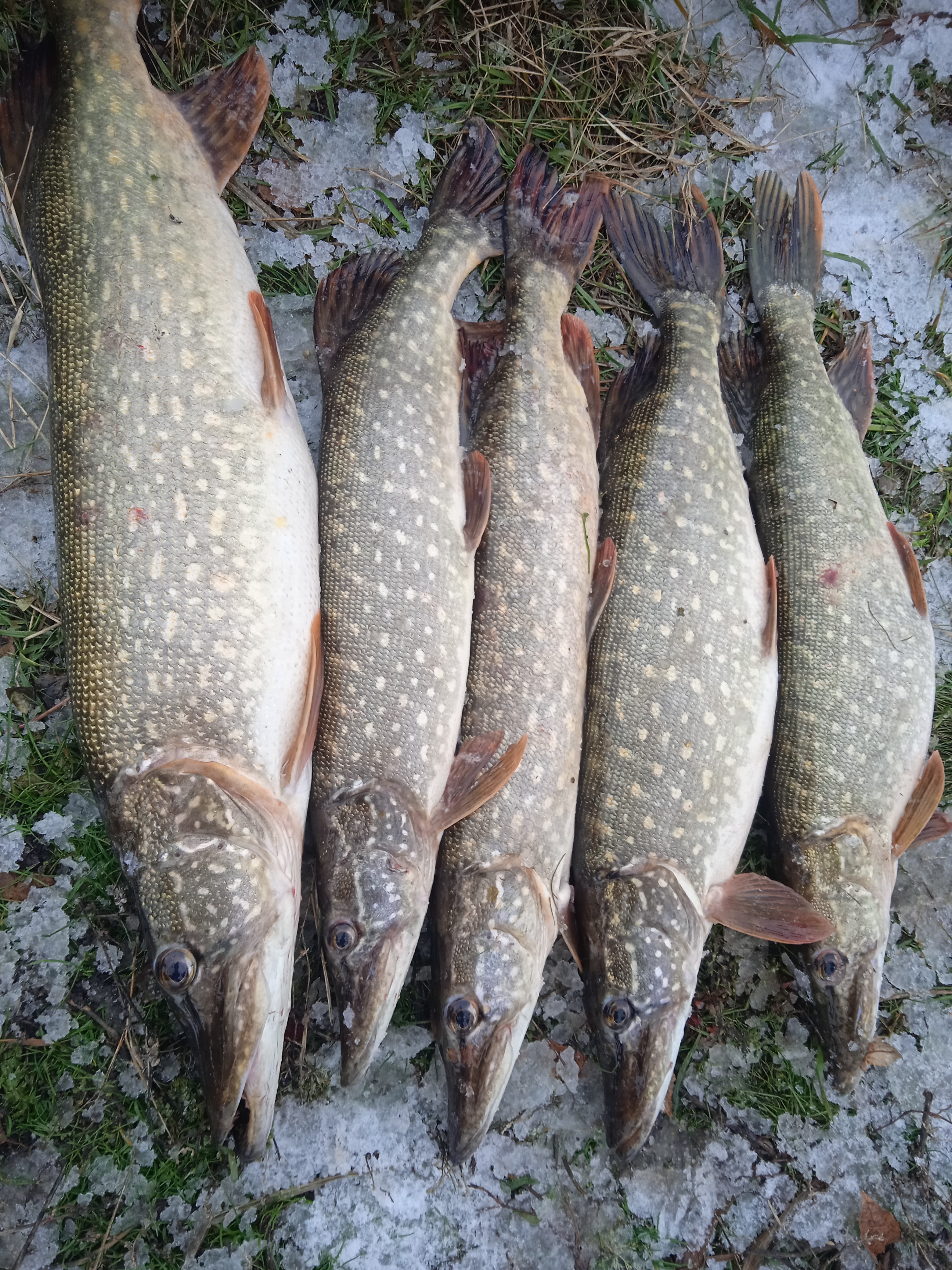 Вроде бы и закрыл уже сезон ,но от предложения сгонять со спином еще разок(пока все не замерзло) не смог отказаться. Торопиться не стали, на воду вышли только в 9. Вода уже, всего +1,6С. Начали с ям. Первый час показал что жора у хищника сегодня не запланировано. Только чешую снял джигом с сазана или большого карася))). Около 10 наконец-то первая щучка проснулась, следом еще и еще. Цвет приманки видимо роли не играл, просто надо было попасть ей под нос. После 11 заморосил дождик и мы решили не испытывать судьбу и делать ноги к дому, т.к. предстояло обратно месить грязь около 10км и не хотелось бы искать трактор, если чо.