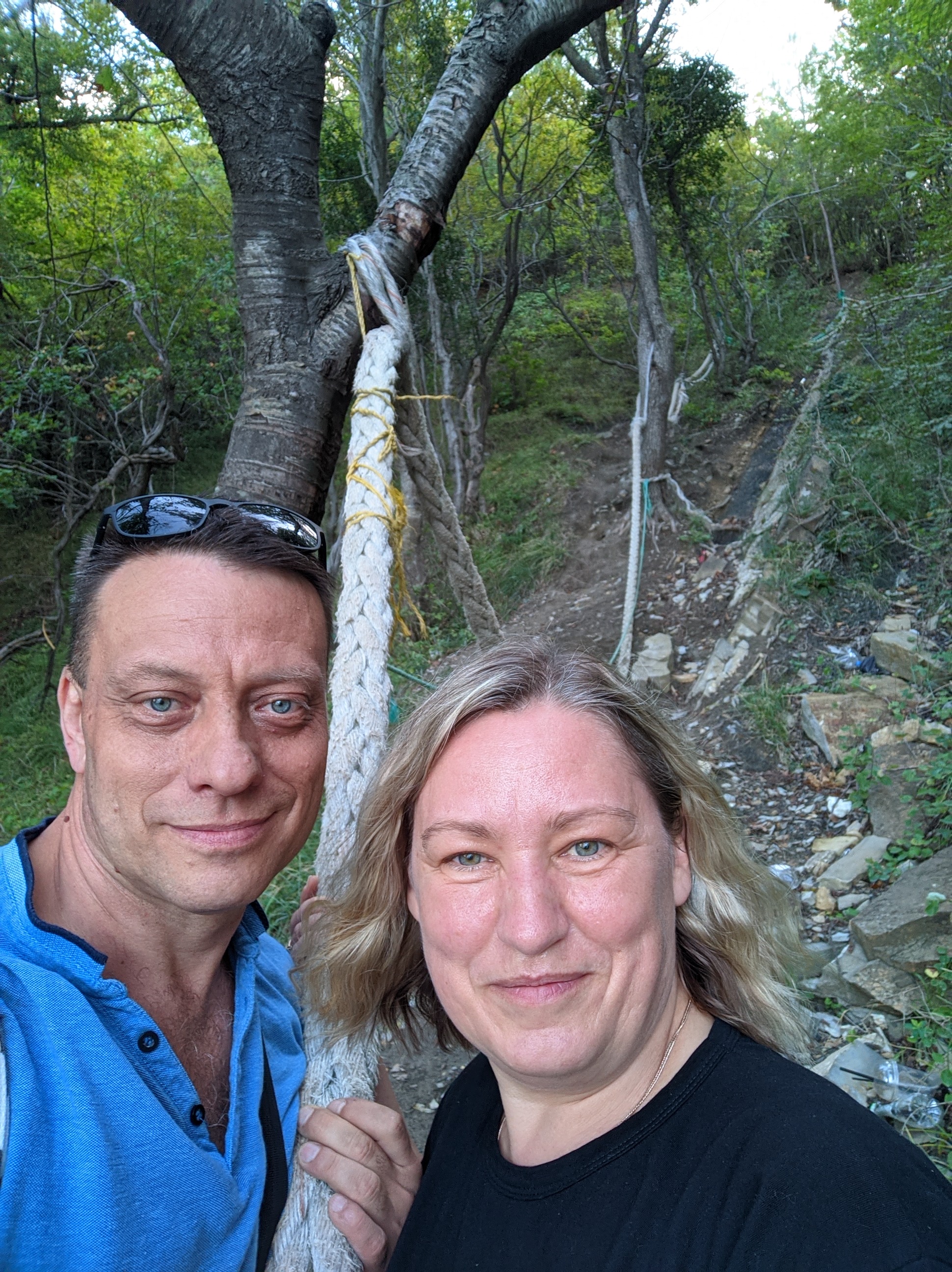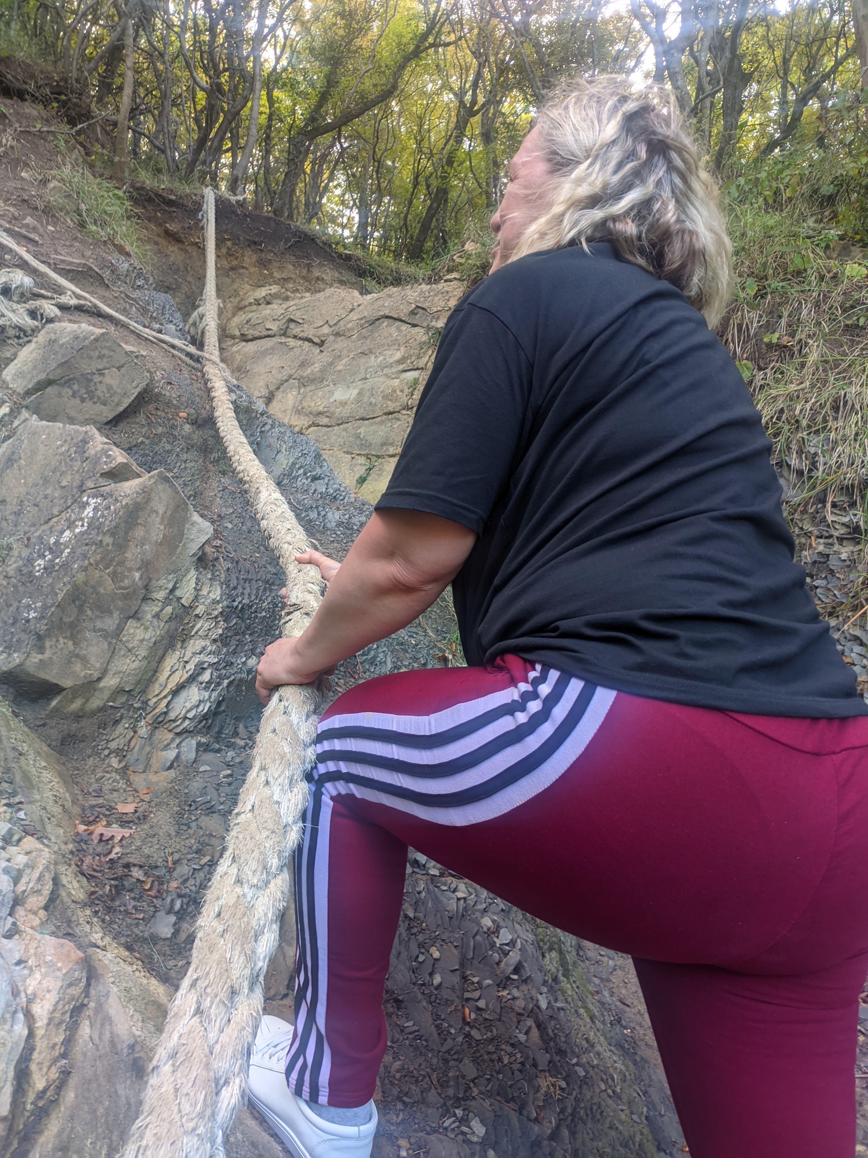 Обратно спускались по канатной дороге какой то, потом ноги скользили по скалам, ну интересно конечно