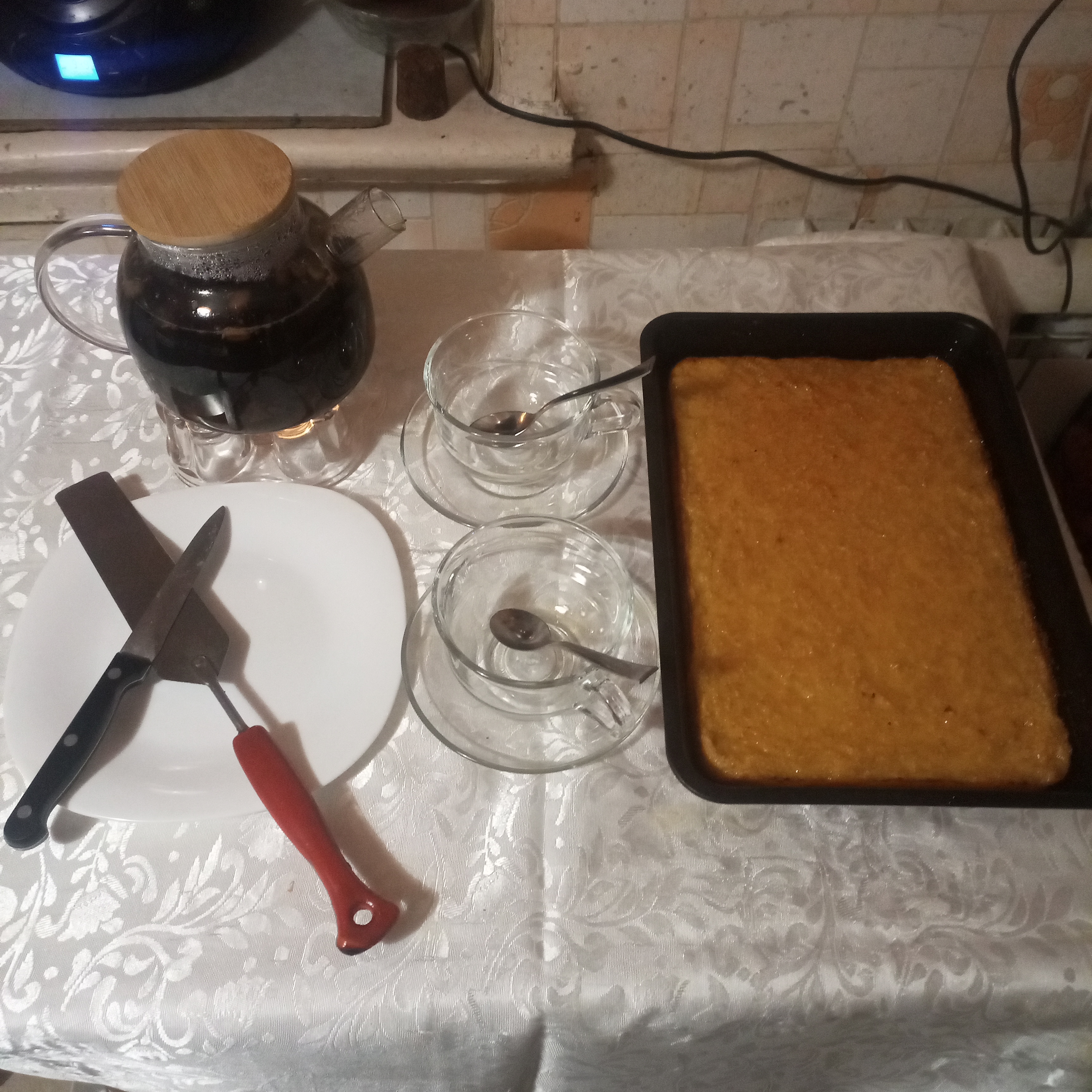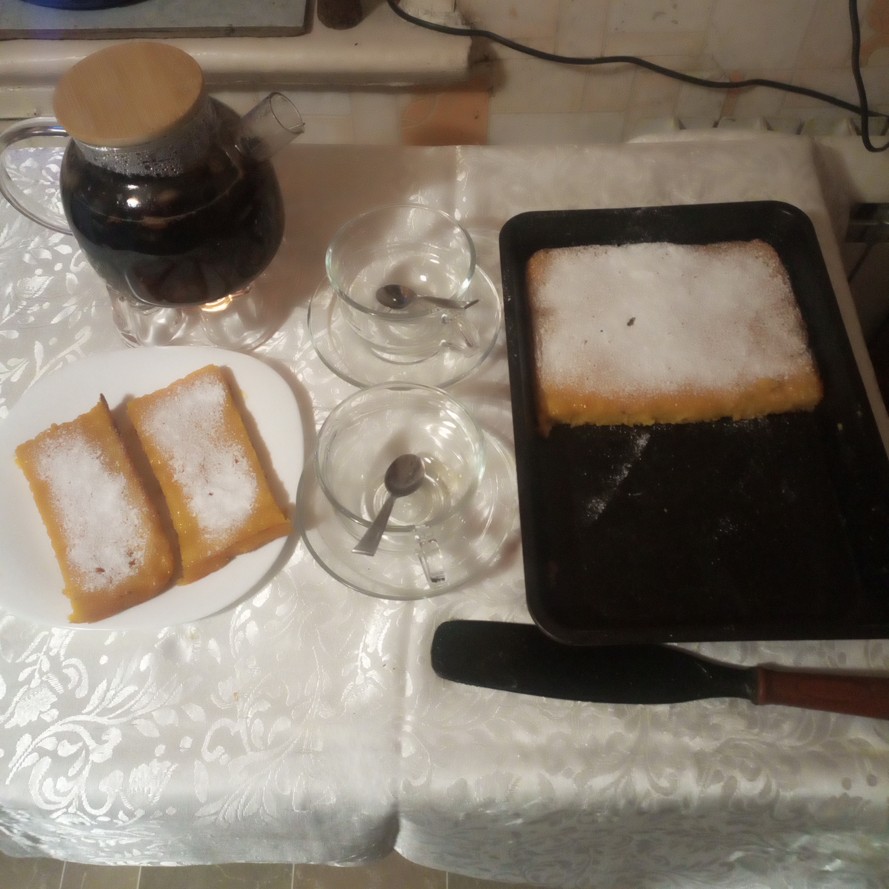 Готовим сироп. В 150гр кипяченой воды,высыпаем 150гр.сахара и выдавливаем сок 1 лимона,кипятим 2-3 мин. Достаем из духовки наш манник,заливаем сверху сиропом,даем пропитаться(10-15 мин.) наливаем чашечку хорошего чая и наслаждаемся обалденным манником!!!! ПРиятного всем аппетита!!!!!!!!!!