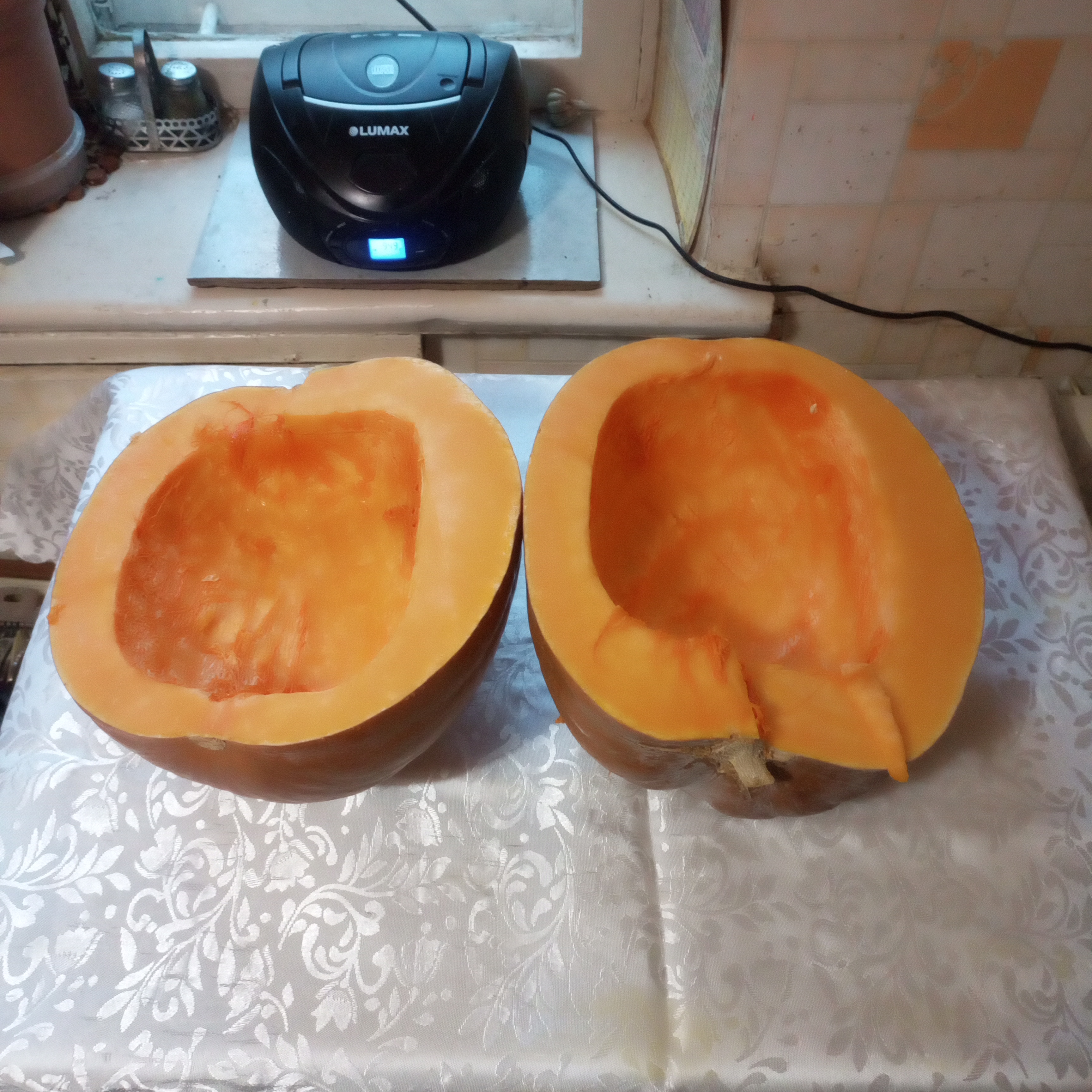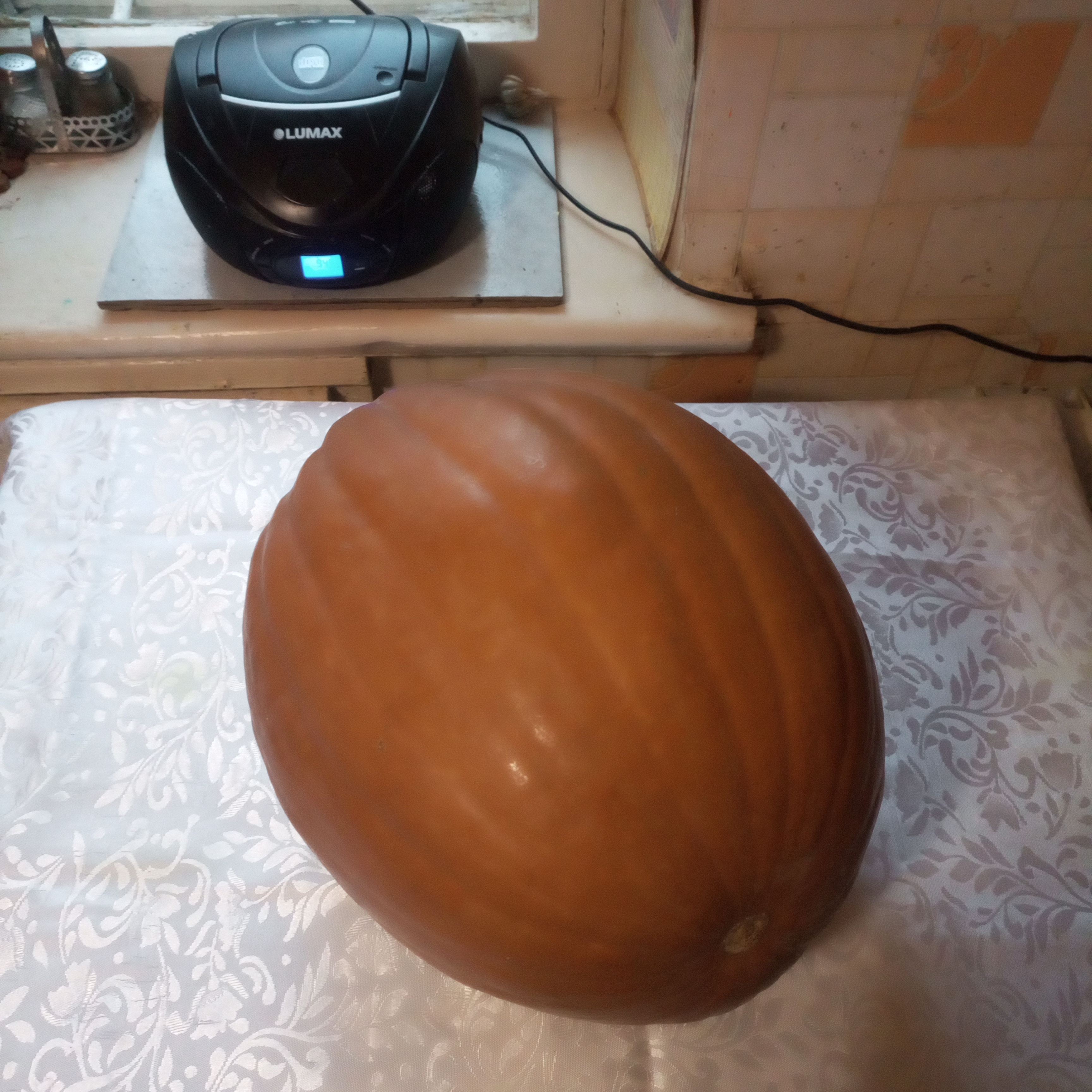 За окном осень, при чем в самой её неприятной стадии, погода никудышняя, холодно и сыро. Поэтому решаю занять себя дома чем нибудь интересным, полезным и (как оказалось))вкусным! А именно приготовить что нибудь не совсем обычное, что никогда и не готовил! А из чего приготовить, чтобы было бюджетно, вкусно и главное красиво? Выбор пал на огромную тыкву давно лежащую на балконе. Тем более приятно что красавица была "откормлена" на личном огороде и давно дожидалась того дня , когда сможет порадовать нас на кухне. Я назвал этот день ДЕНЬ Т