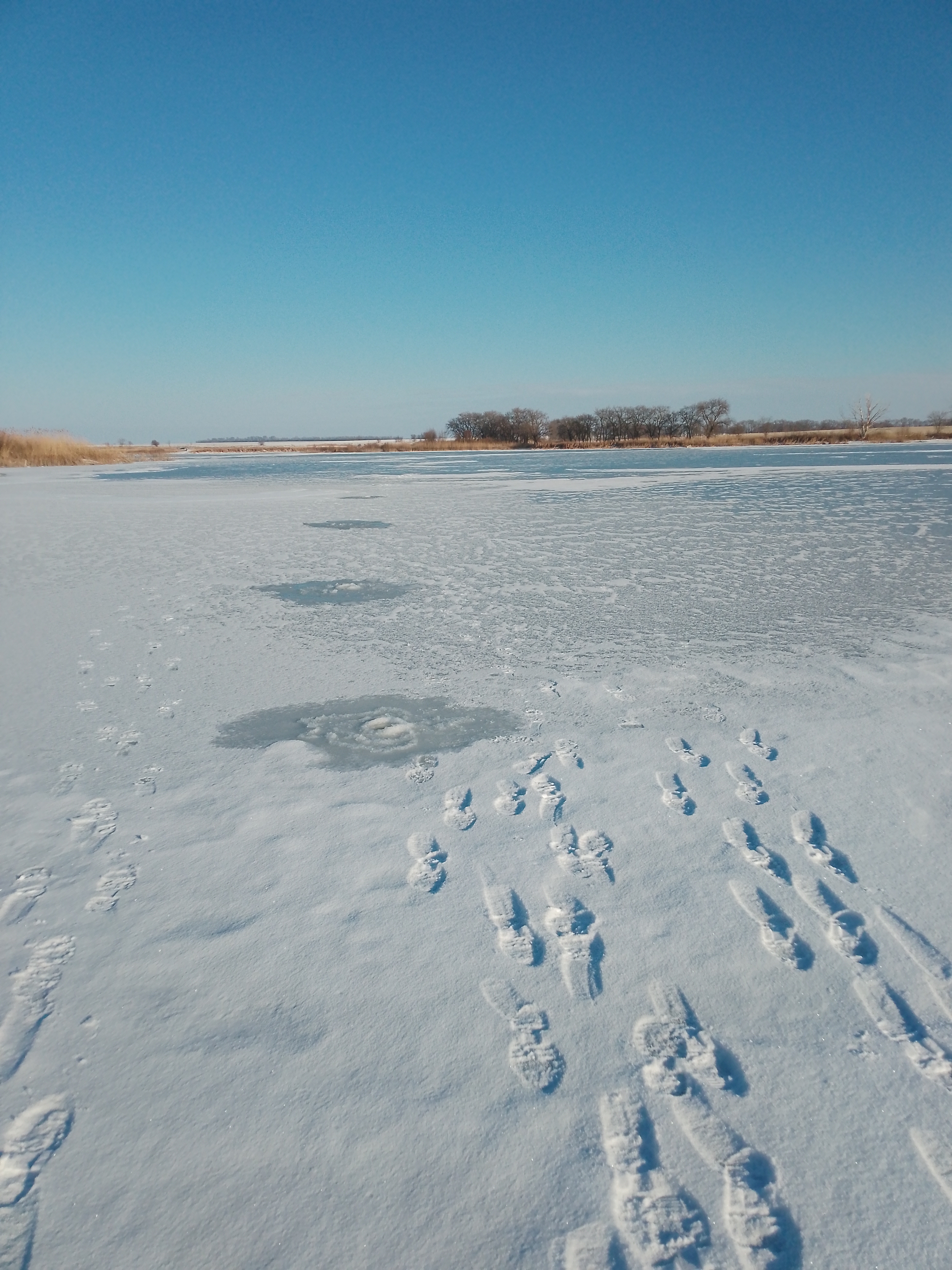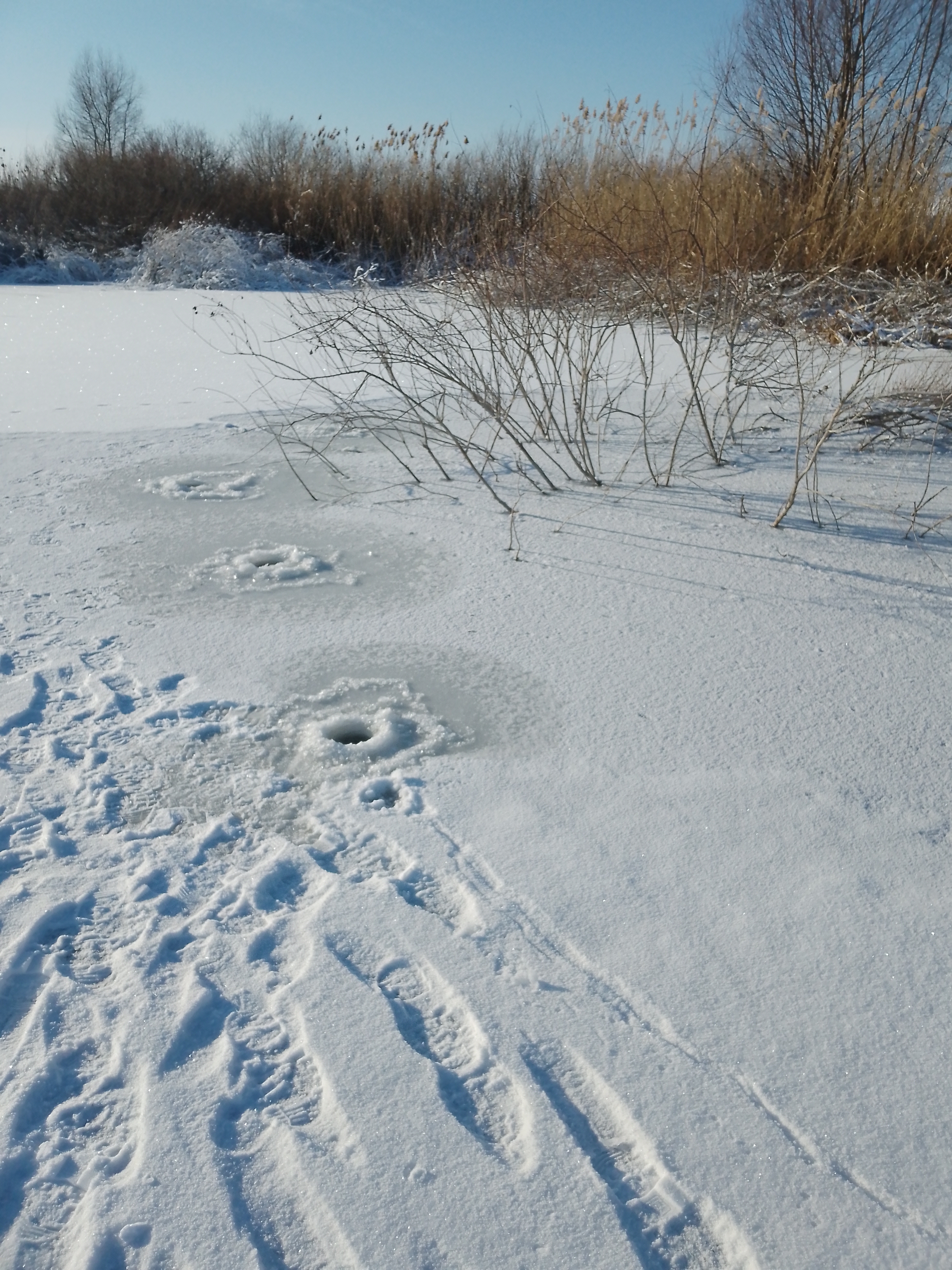 Ну вот, нежданно негаданно, как снег на голову 6 января наступила зима. На краю области сегодня с утра -15. На лед попал только ближе к вечеру. Пока расставил жерлицы, 4 килошных щучек достал и 4 мимо. На русле по льду ещё опасно. Одни только норки смело бегают.