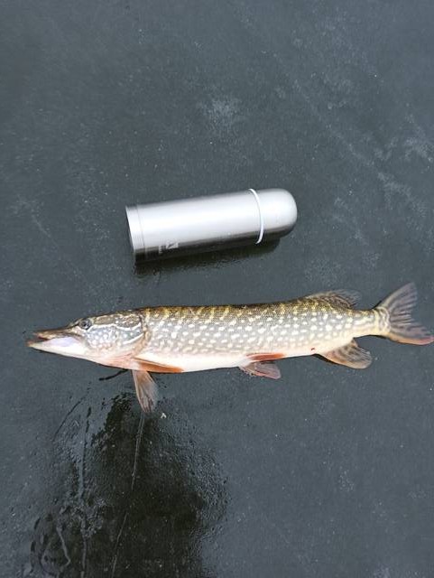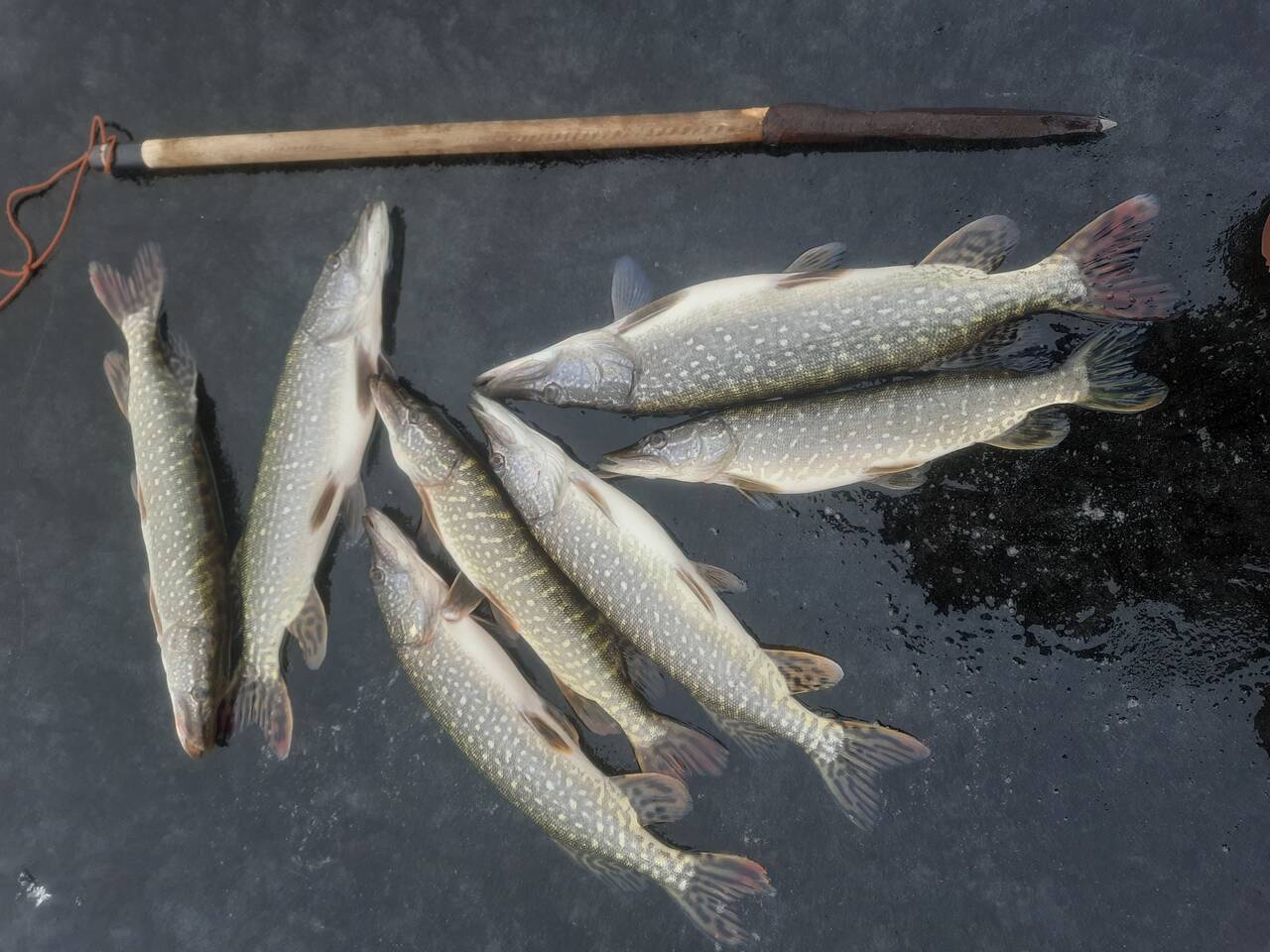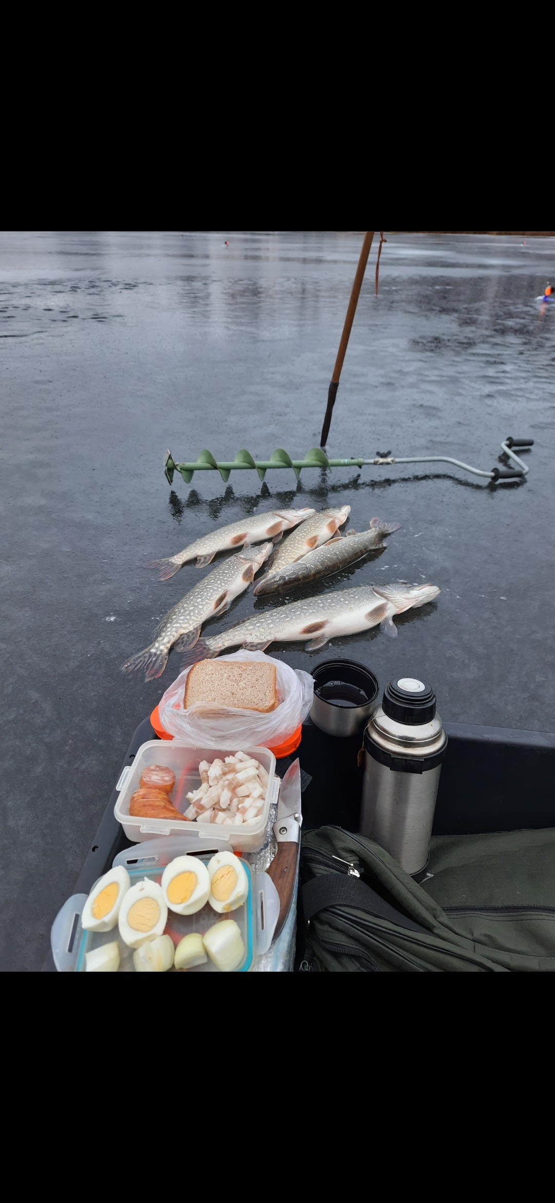 Сеголня рискнул на лёд. Дикий стоячий водоём. По пути кабаны, косули дорогу перебегают. На месте был ещё ночью. Дождь и ветер утихать и не собирались. Ну, неотступать же назад! Одел спасжилет, штаны плотно застегнул поверх сапог, спасалки на шею, пешню в руки, фонарь на лоб и на изучение льда. Лёд оказался спортивный, кое где хрустел, 5-7см. Дождь его до обеда съедал прямо на глазах. Проверил поле для жерлиц, расставил, а тут и рассвет и ливень. Но щуки скучать не давали. Как говорится, дождь идет, а я скирдую. К 10 утра распогодилось, ну и клев затих. И наконец-то можно было спокойно передохнуть, присесть и перекусить.