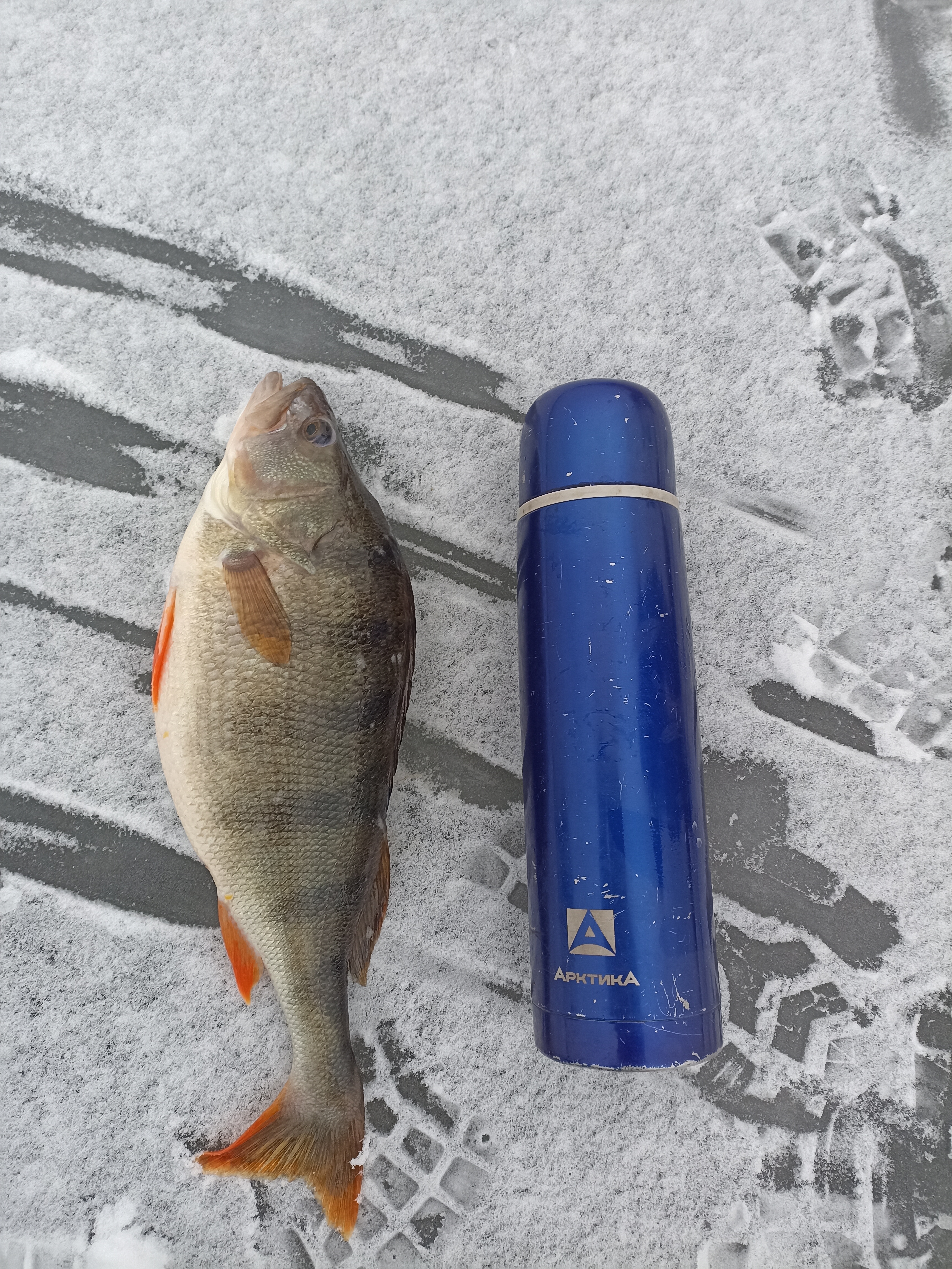 Вход в главный усынок перегораживала полынья, поэтому пошел налево. Добурился до первого домика - пусто. Продвинулся чуть вперед и словил щучку грамм на 500. Уже смирился с тем, что это, наверное, и будет "бигфишем" дня. Но на следующей же "дороге" поймал такого представителя "полосатого семейства", что захотелось еще раз посетить данный водоем, но уже на полный зимний световой день".