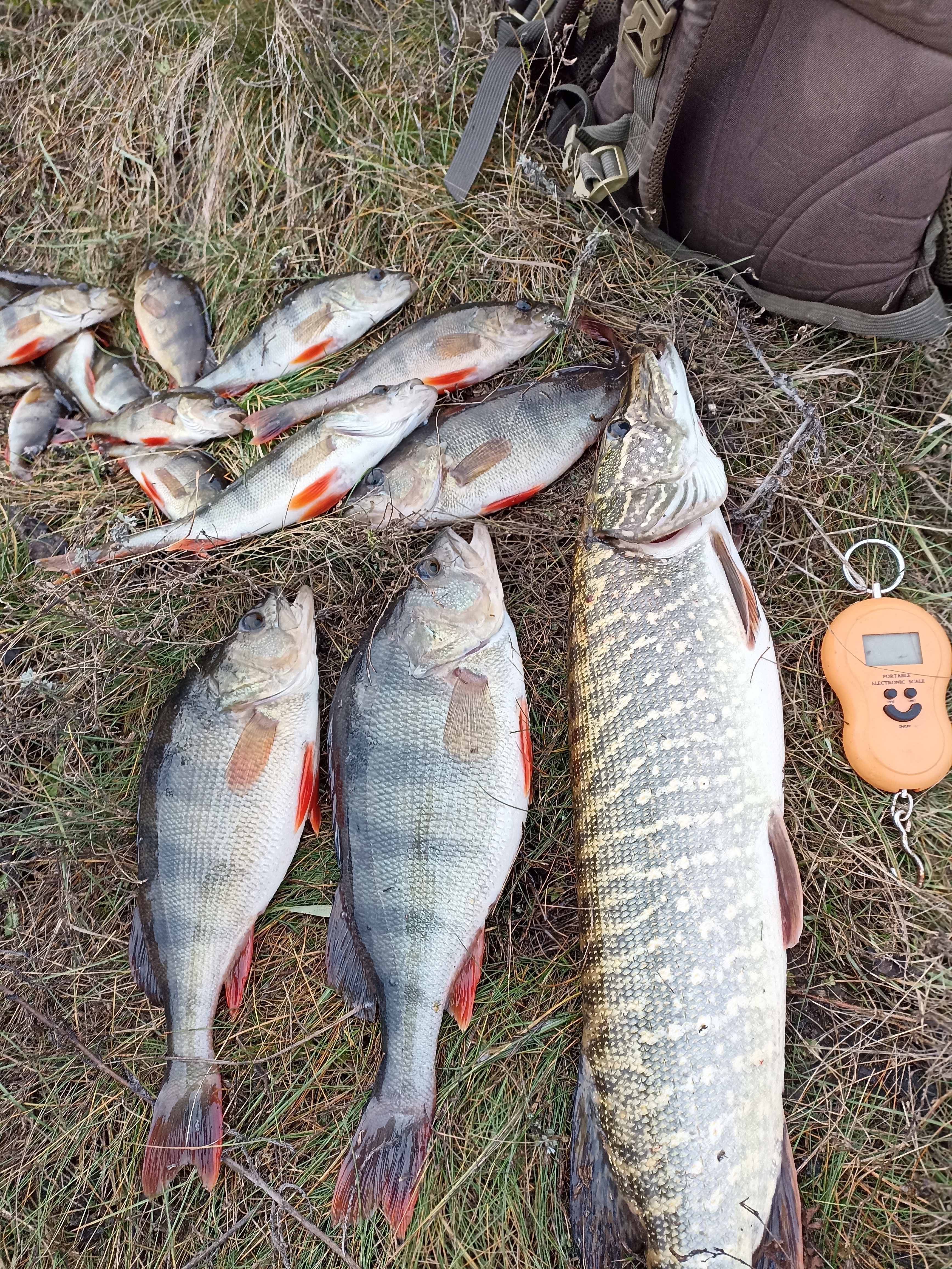 закрывали окунëвый сезон по жидкой воде. А раз окунь, то лëгкие спиннинги, мелкая резина, груза от трëх до четырëх грамм. Ловил сегодня только на джиг-риг, что позволило избежать налипанию донной тины на крючëк и свело на нет дискомфорт от постоянного её снимания. Что касается самой рыбалки, то окунëк поклëвывал но не так активно, как в прошлые выходные, да и размерами был помельче. Не смотря на это напарник умудрился всë же поймать пару кабанчиков, максимальный из которых немного не дотянул до килограмма (940гр). Мне же судьба сегодня уготовила другой биг-фиш