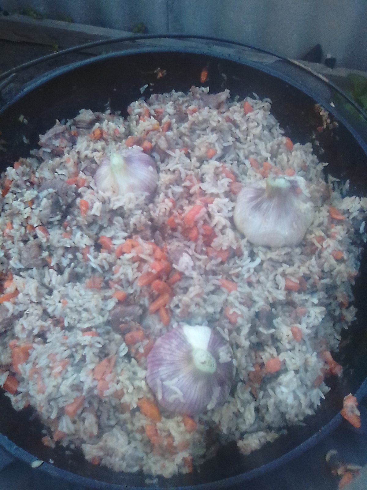 Уже много раз готовил плов, на улице на костре/печи тоже, основной рецепт - как рассказывал Андрей Андрфиш, ни разу осечки не было))) Свои коррективы конечно же внёс, делаю немножко по-своему, а вот по воде скажу как поступаю я. После подготовки зирвака наступает очередь засыпки риса. Рис обязательно перед началом приготовления плова промыть водой раз пять-шесть до чистоты воды, оставить его до своей очереди и заниматься готовкой блюда. После засыпки риса в казан, разравниваем зёрна ровным слоем и аккуратно заливаем его кипячёной горячей водой (чтобы не сбилась рабочая температура блюда) примерно на 5-7-8 мм, всё приблизительно и на глаз))) и накрываем крышкой. После даём кипнуть и снижаем температуру огня до минимума (если готовим на улице, то убираем лишние дровины), а через 7-10 минут снимаем крышку, сгребаем зёрна риса горкой, втыкаем в него перец чили и головки чеснока, и накрываем фарфоровой тарелкой, закрываем казан крышкой. Ждём ещё 10-15 минут и убираем казан с огня, крышку снимаем не сразу, а ещё через пять минут. Открываем крышку казана и... наслаждаемся запахами блюда))) , убираем чеснок и перец, перемешиваем все ингридиенты и выкладываем плов на большую тарелку с национальными орнаментами, угощаем присутствующих.