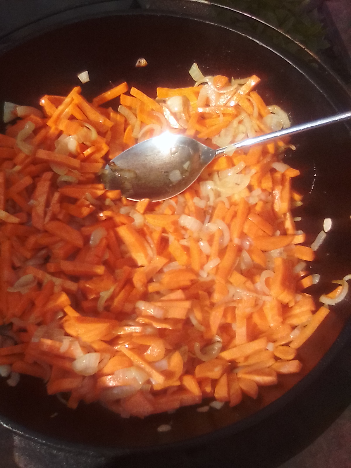 Лук морковь и мясо обжарил , сейчас зервак делается ...