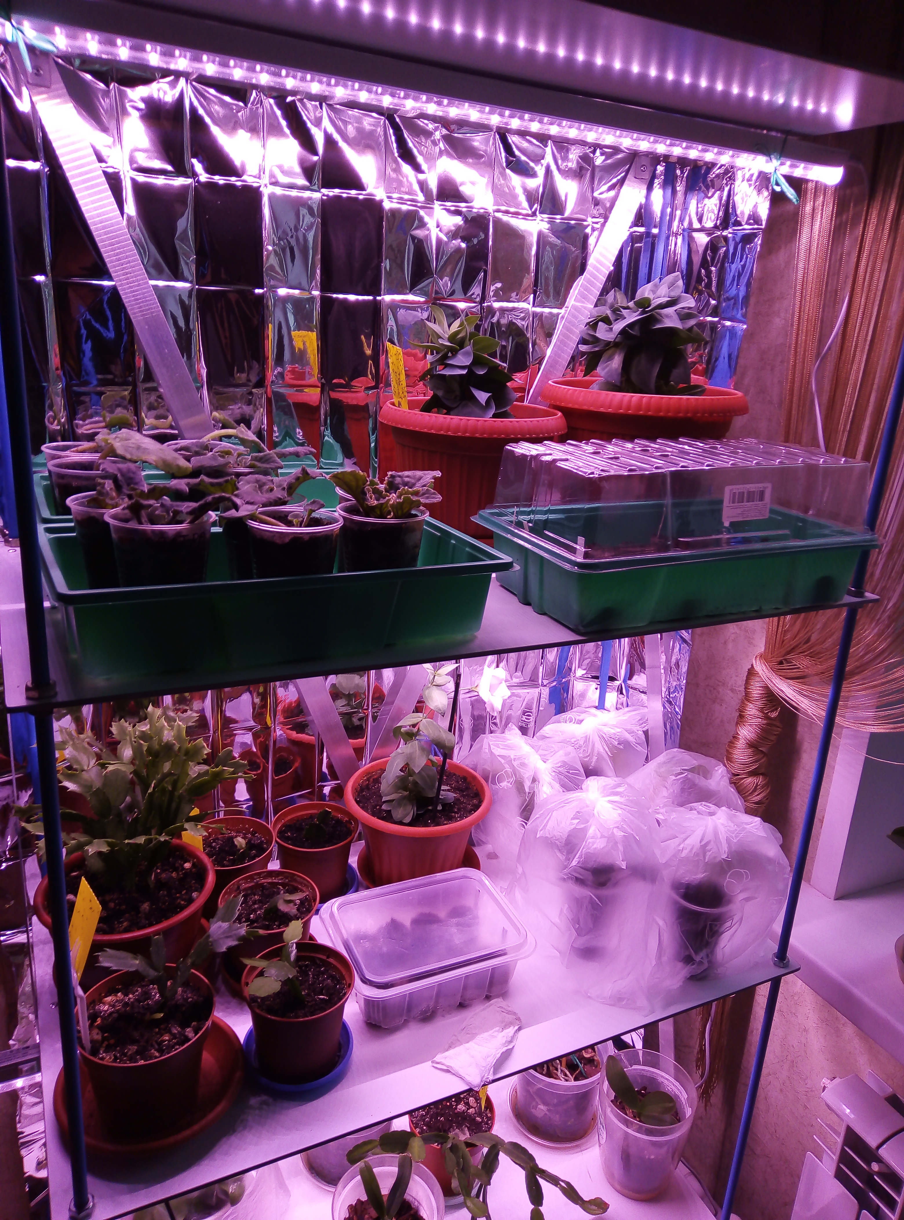 Там у меня полный порядок уже давно и никакого моего участия не требуется. Это территория жены и я только иногда заглядываю из любопытства. А для рассады есть этажерка со светодиодными светильниками полного спектра. На днях занесла её в дом для укоренения каких-то своих растений