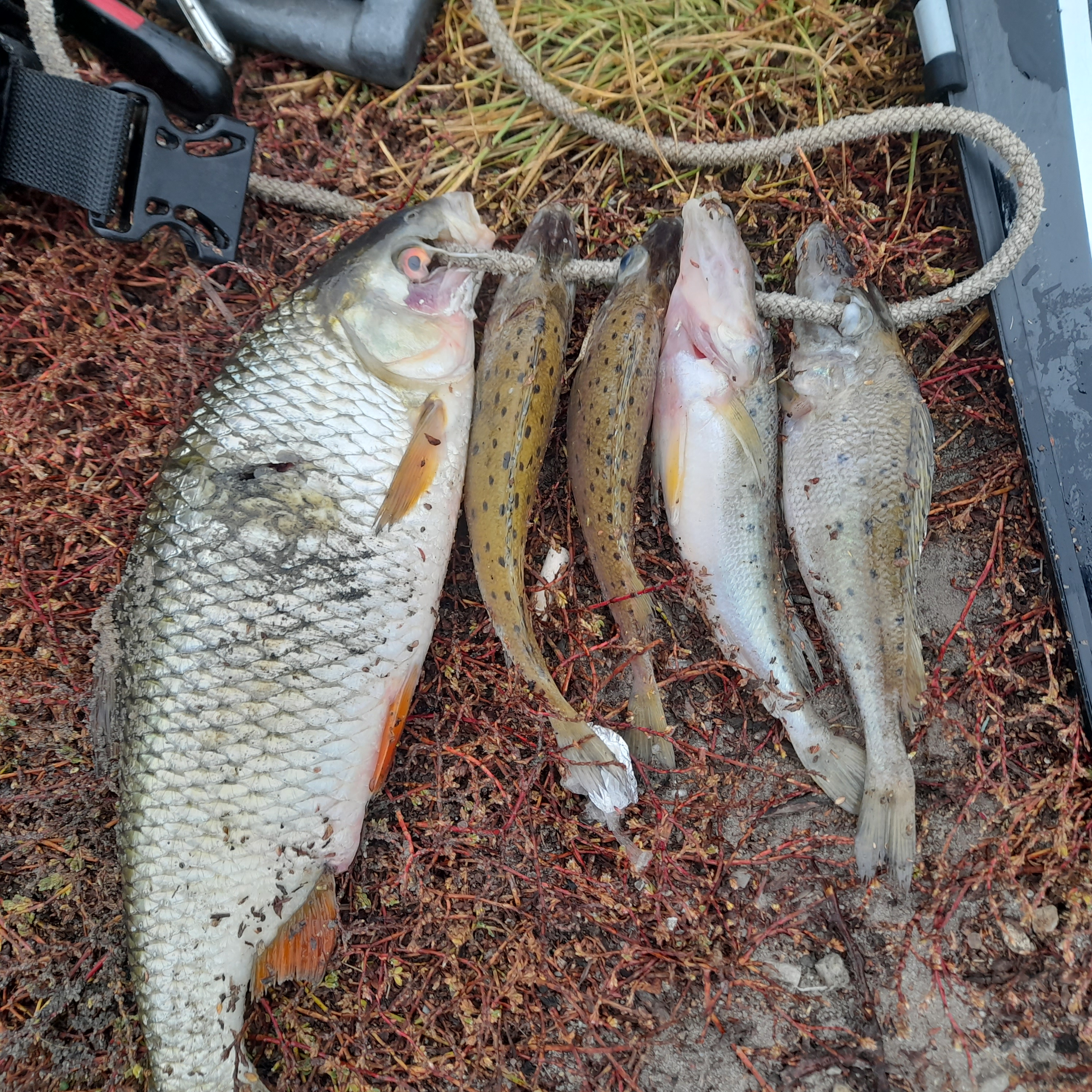 Сегодня продолжил исследовать реку в Животинном, благо, выходной, на работу спешить не надо. От понтона сплавлялся в общей сложности 2 часа. На карте ниже по течению должен быть остров, но я его так и не нашёл. Первая часть маршрута - каменистое дно с небольшими глубинами, ловля бирюков. Когда течением сносит, и видишь, что он спокойно стоит у дна, есть соблазн его сразу и схватить, но делать этого нельзя, уйдёт. Упустил не меньше десятка, пока понял, что оптимальная тактика - проплыти мимо, а потом подойти сзади против течения и накрыть его рукой. К сожалению, остальная стайка на месте не стоит, поиски надо начинать сначала. Крупняка никакого не было, а бель только отвлеаает. Подцепил одну плотву, в ней оказалось 590 грамм, а весь улов на 1030