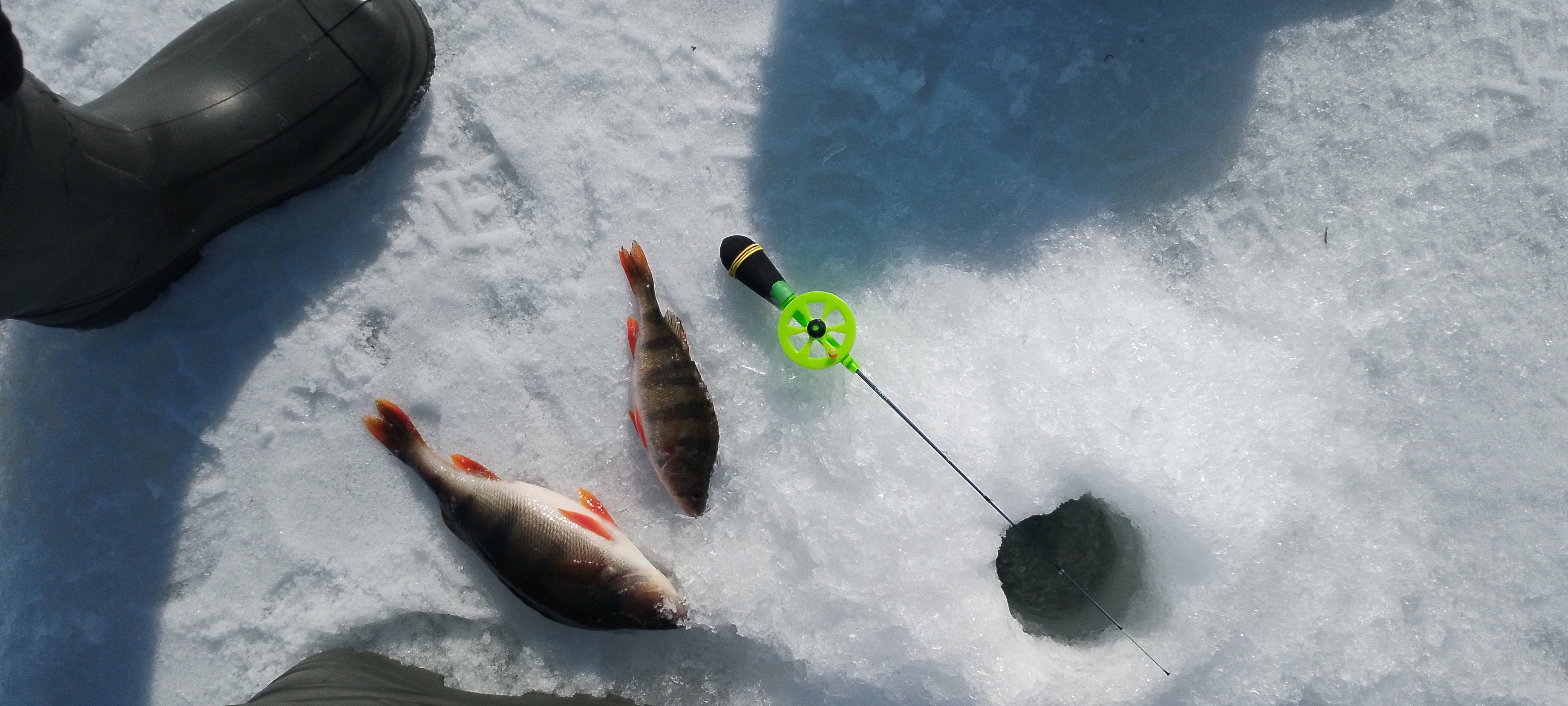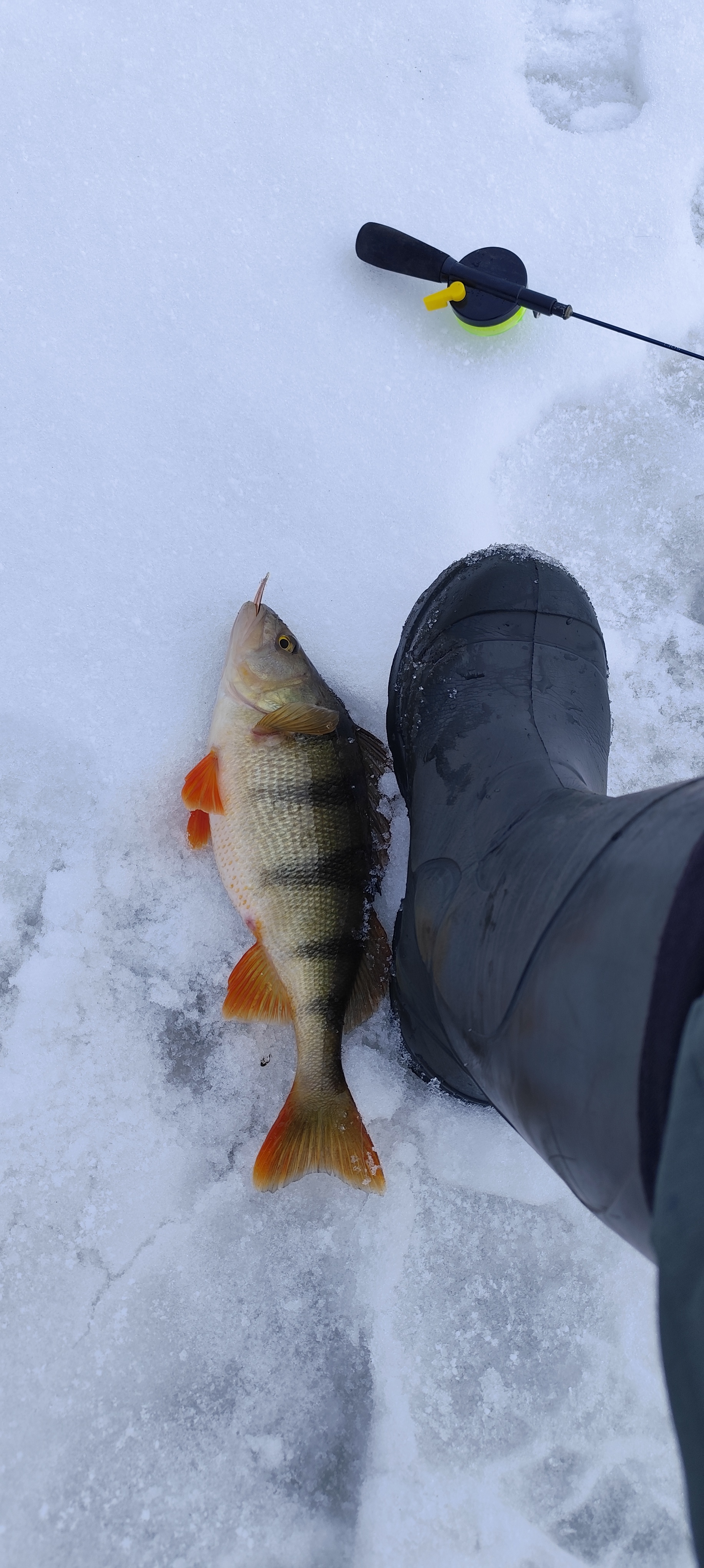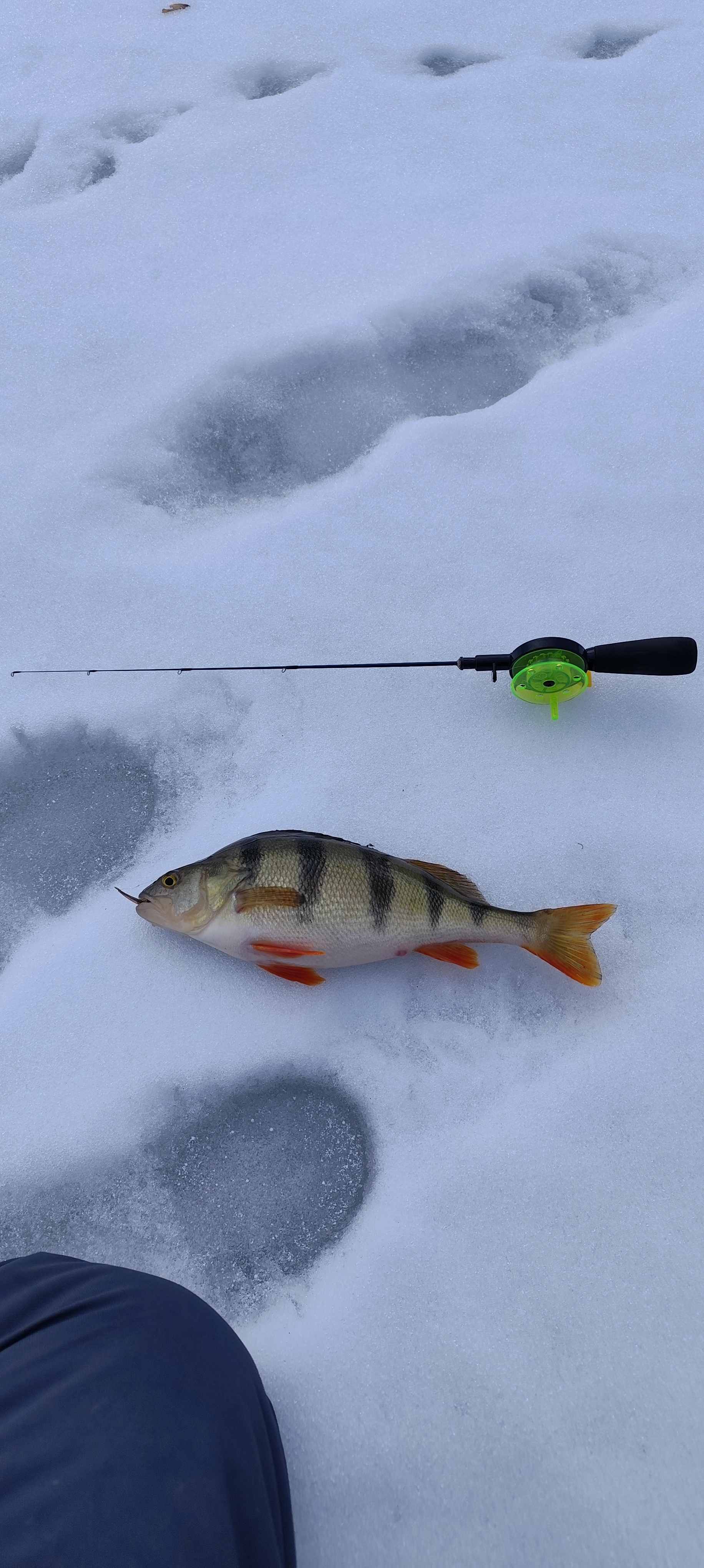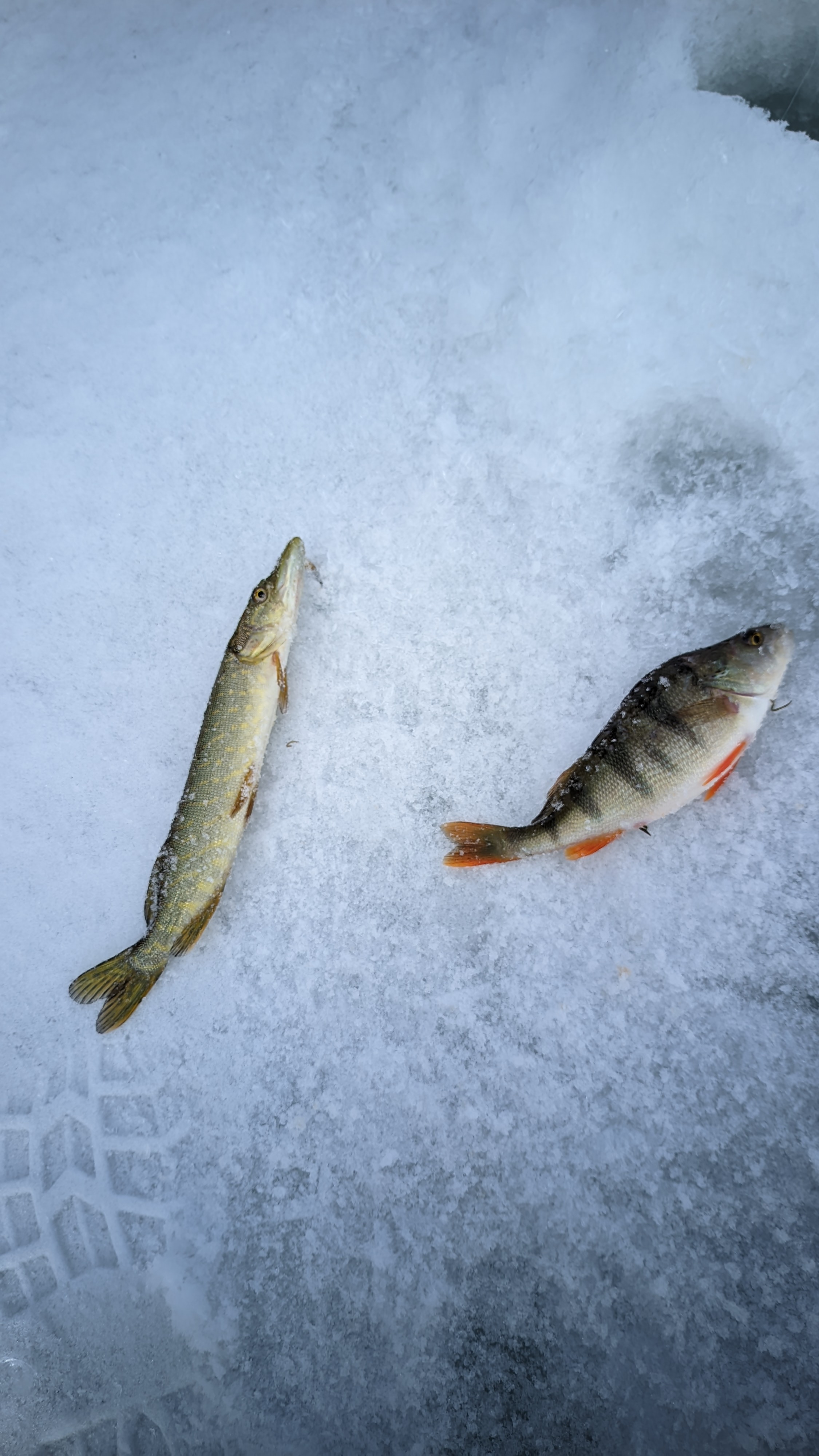 Уже днём с одной лунки не большой окунь и следом щучка совсем мелкая, не одна рыба в итоге не пострадала