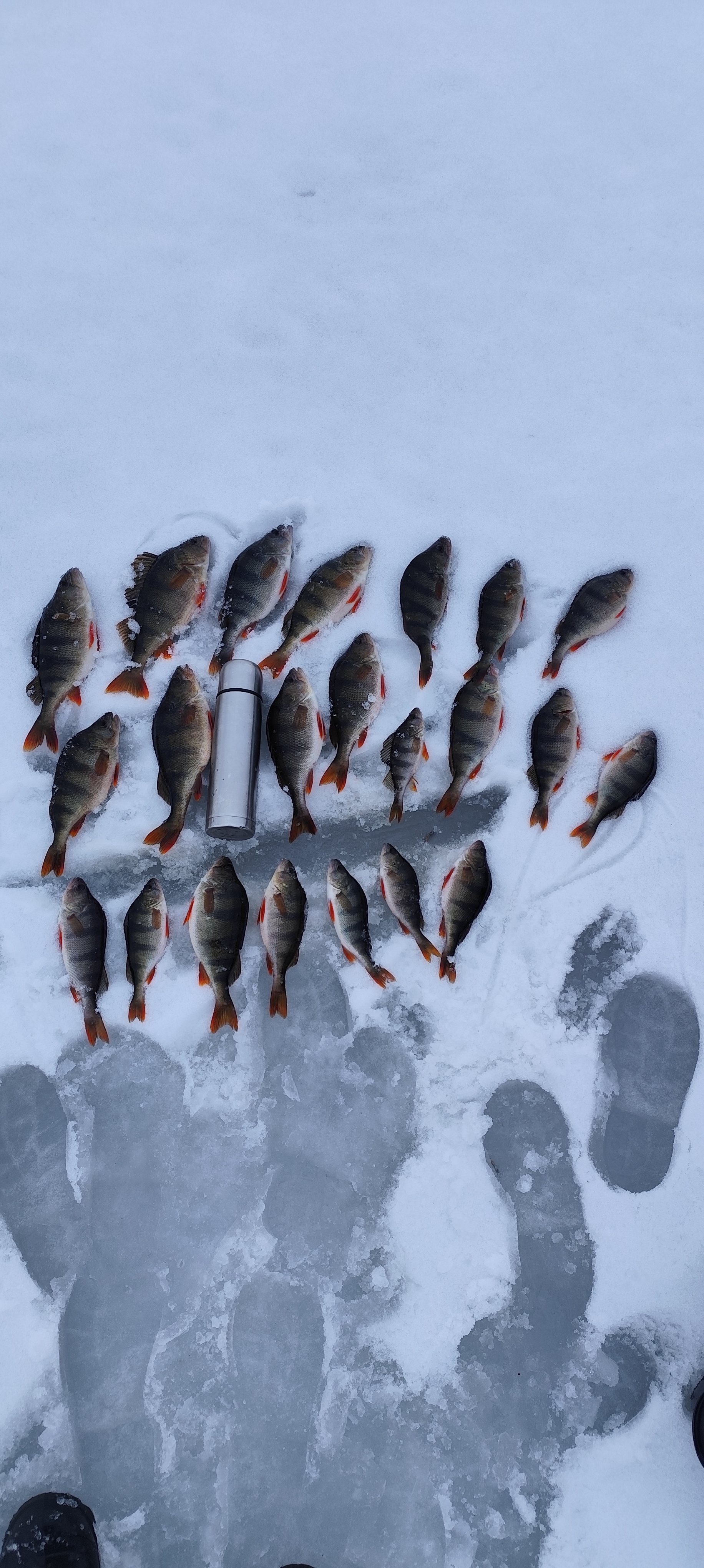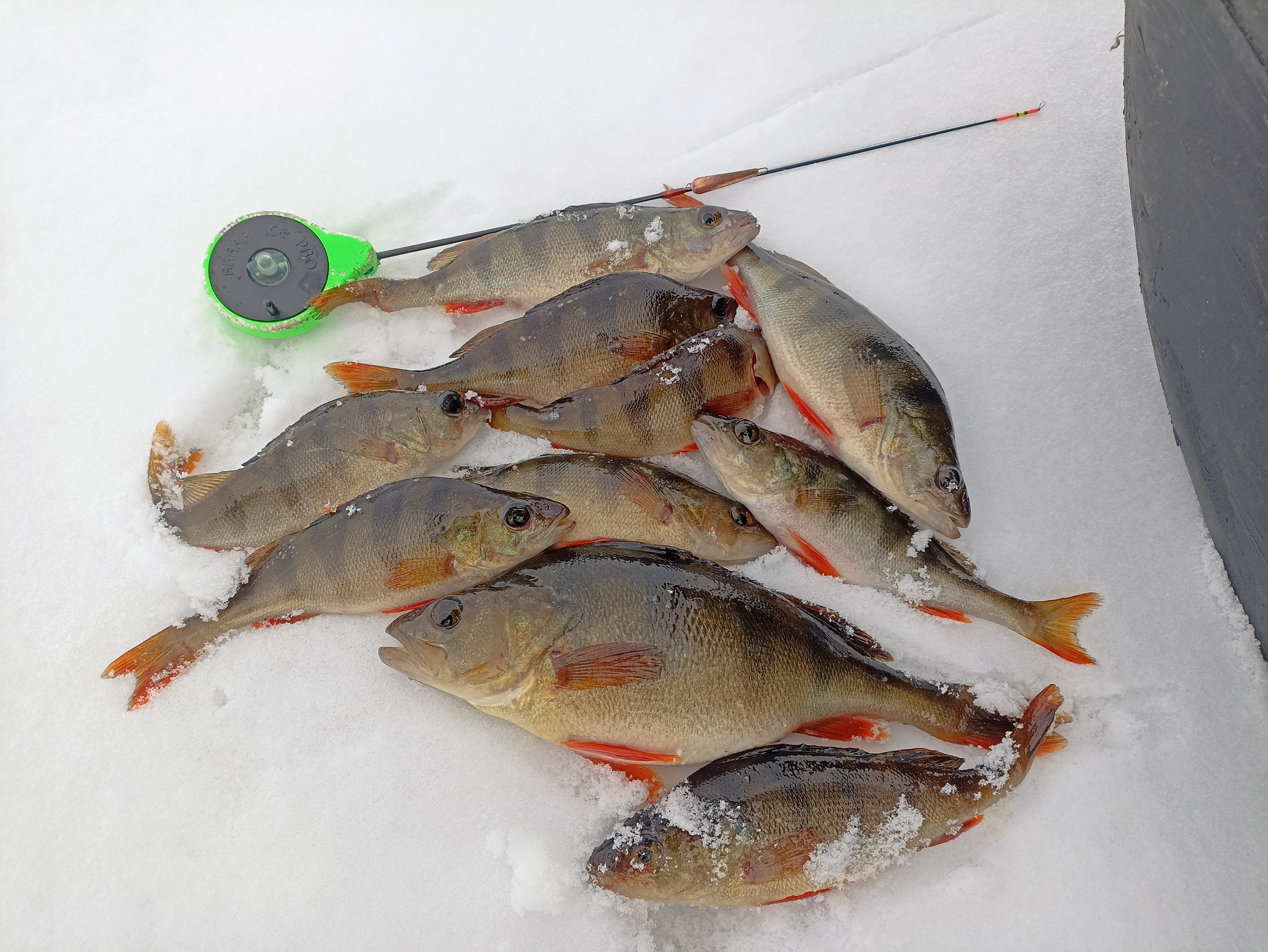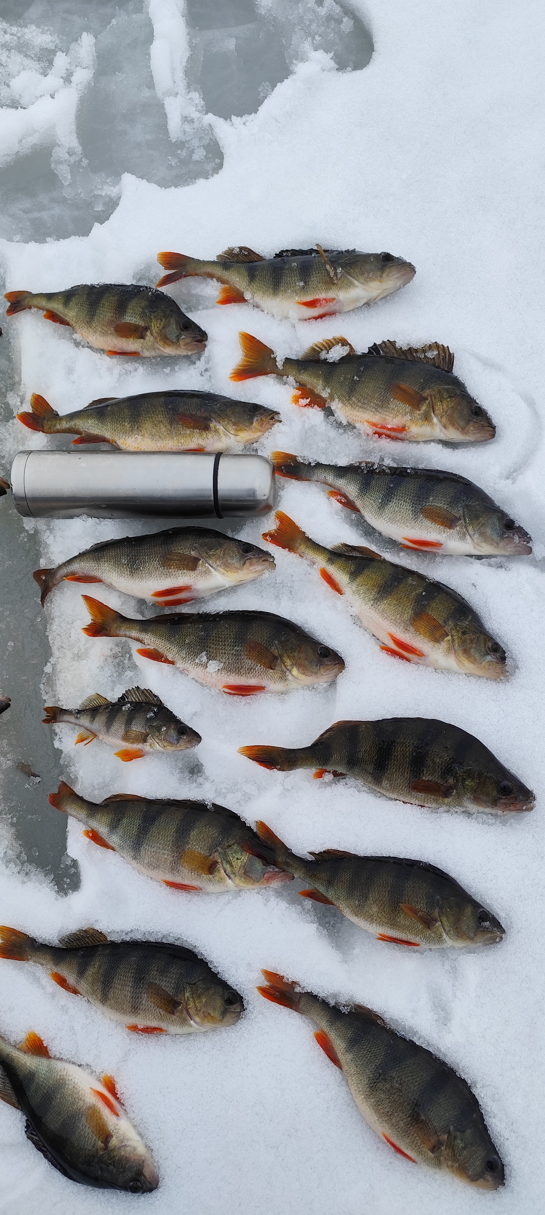 Локация та же. С утра прошёлся по своим старым разбуренным местам. Окунь шевелиться начал только после девяти. Размер весь хороший,но по одному с лунки. До одиннадцати наковырял восемь штук и затем дальше пошел разбуривать русло. По итогу может метров пятьсот истыкал,да не совсем плотно,но одну точку ещё надыбал. С одной лунки даже пять штук умудрился выловить, но размер поменьше, короче в перемешку.. На обратном пути опять обловил точку,где были утренние поклёвки. Снял ещё шестерых кабанчиков и до дома засобирался. Пора,как говорится и меру знать. Было ещё тройку сходов и раза четыре царапнул "полосатых", но это,как говорится,не считается.