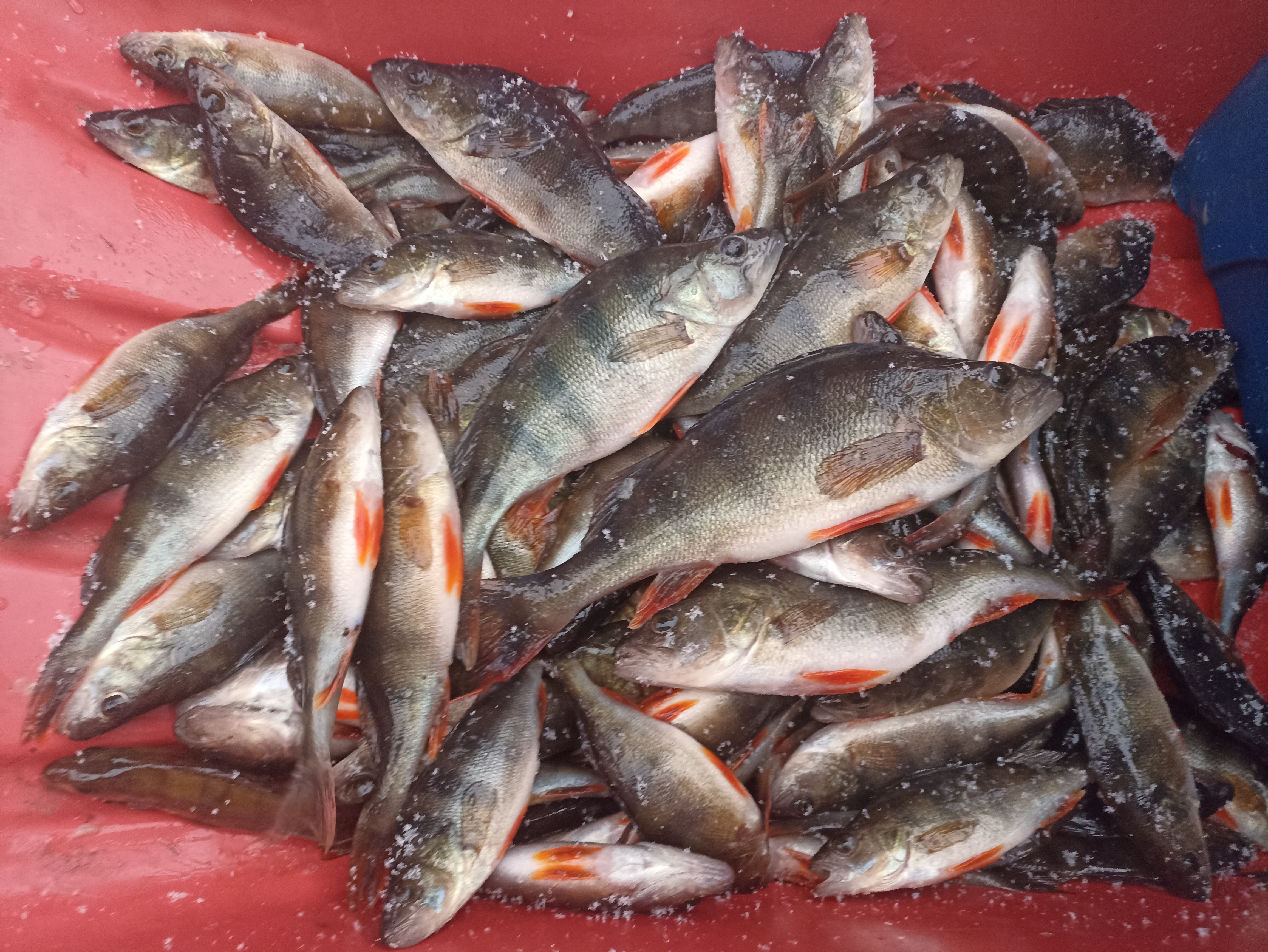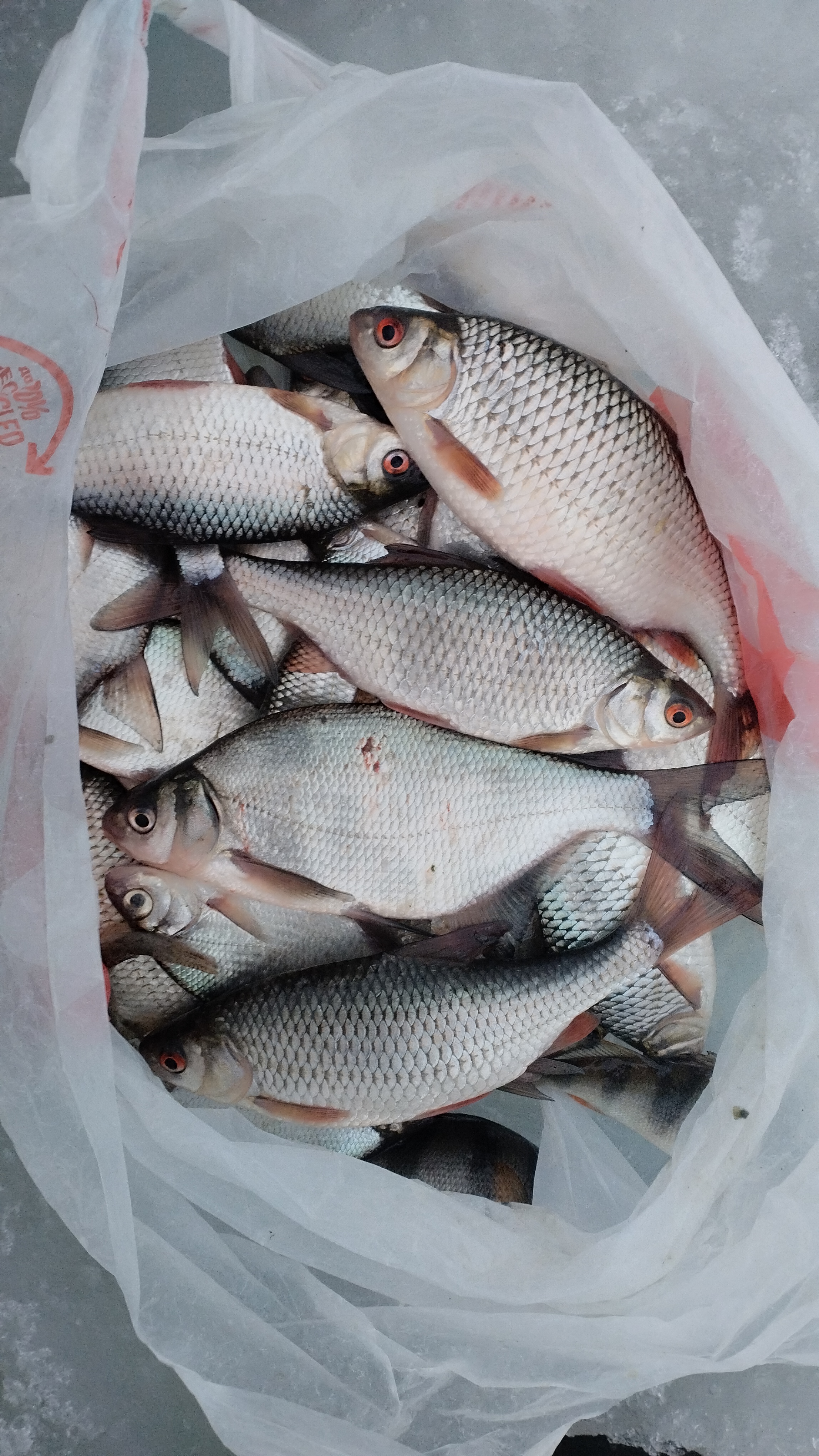, на берегу рыбачок жжёт костёр и выставил несколько жерлиц, спрашиваем этот пруд ,тот утвердительно кивает, а как с окунём тут, да никак и по жерлицам глухо обычно. Выходим на лёд и начинаем бурить, но видно что не то что-то , на окунёвых прудах всё избурено, а тут и лунок то старых не видно. Алла берёт трофей в виде щуки с палец, таких ещё ни разу не ловили. Выходим на берег, пытаемся позвонить Деду Морозу, не отвечает, тоже на рыбалке. Опять к мужичку с вопросом, а тут ещё есть пруды. Тот пытается объяснить дорогу, нихера непонятно, но хорошо что есть Нивас. Какими то тропами выезжаем на плотину другого пруда и о чудо, вот они три силуэта с шуриками бегают и пакетами в руках. Нашли . Платник, сторожка, в ней никого нет, но телефон написан. Позвонили, сторож на охоте по соседству, подъедет позже. А пакеты этих силуэтов так и драконят, клюёт значит. Начинаем бурить от сторожки, попутно облавливаем старые лунки, видно за ночь ещё не успели застыть. Пошли поклёвки живцового на тридцатой лунке наверно, потом Алла съедобного полосатика вытаскивает. Банда охотников на окуня почему-то уезжает, с хрена ли. видно что рыба была у них. Подъехал сторож, говорит эти тут обрыбились уже несколько раз, а сегодня типо хреново, потому решили до дома ехать, но вы не там ловите и указал место. Пошли поклёвки, на каждой пятой лунке где-то нет нет и удар, трофейного не было, но интересно с..ка, когда знаешь что он отзывается сегодня. Много времени потеряли на поиски пруда, места, новый пруд, но он клевал до конца дня. Прикольно когда под вечер бросили сани у сторожки и пошли уже почужим лункам, отошли хрен знает куда, Алла трёх с лунки ловит, в руке их переносит, я в карман складываю, видим как от сторожки идёт собака жрать колбасу нашу из саней, а поделать ничего с собой не можем, ловля окуня на блесну моя любимая и самая азартная рыбалка. Короче кайфанули хоть немного после всех этих бесклёвий. Деду Морозу респект и уважуха