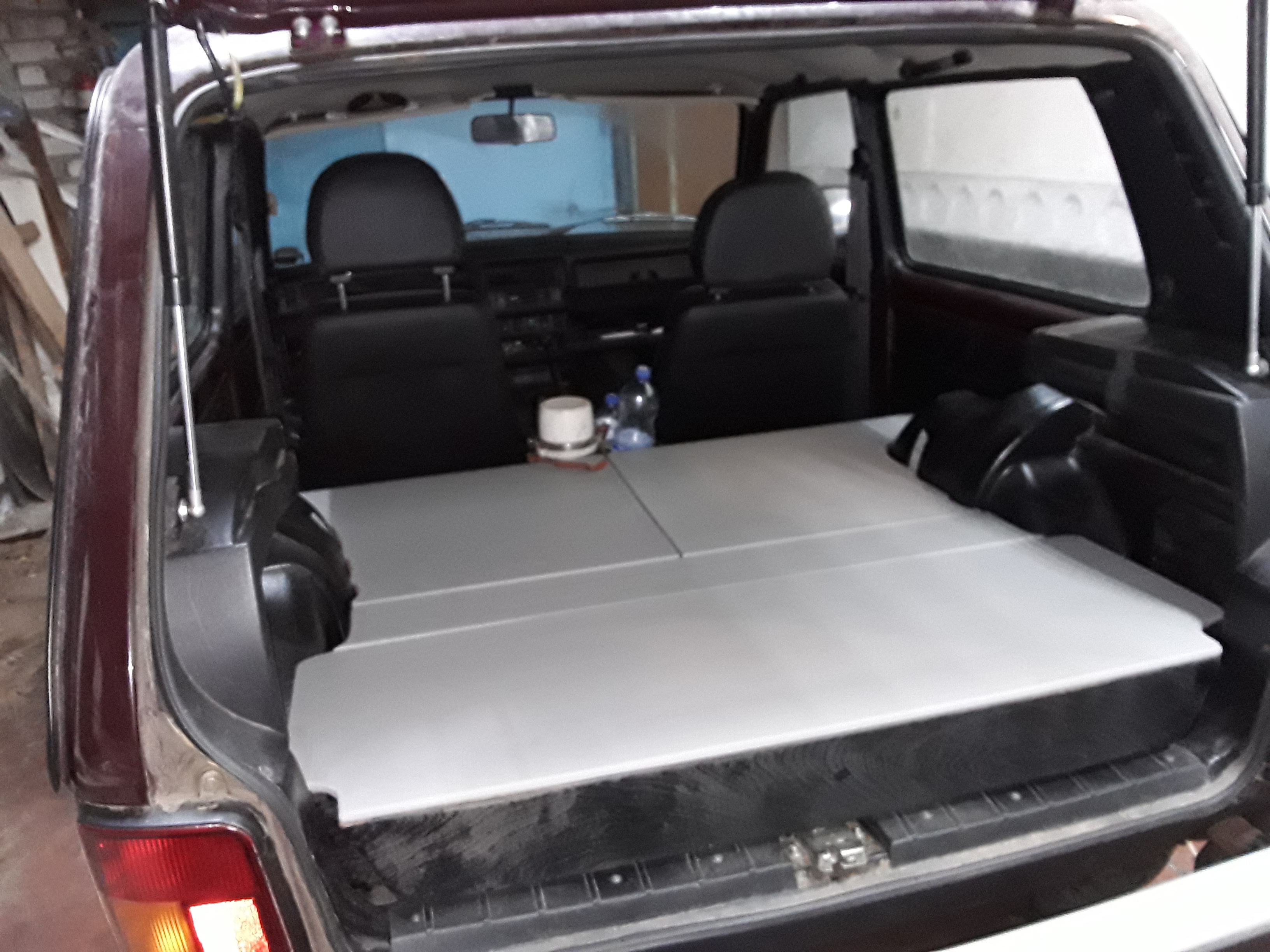 .. т.к. ездить есть на сем - от и раскидал нинку на новый год... и понеслось - парктроник ей(на кой ляд он ей нужен то?), камеру заднего вида.... рацейку... подиум... спалку.в полный рост.. задние сидушки на фиг... Сейчас подим вынул и пластик снял - вот фотки обработки самодельным составом той самой нивы...