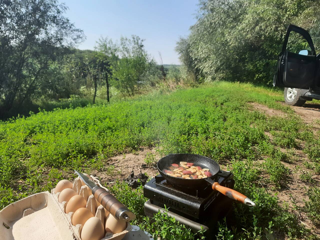 Всем привет! После длительного перерыва удалось выбраться с ночёвкой на наш прекрасный Дон. Решил проверить перспективное место в конце села Конь-Колодезь, где когда-то осенью неплохо отлавливался по лещу. Закинул вещи в машину и пулей устремился, из задыхающегося под палящим Солнцем города, навстречу свежести речного бриза.