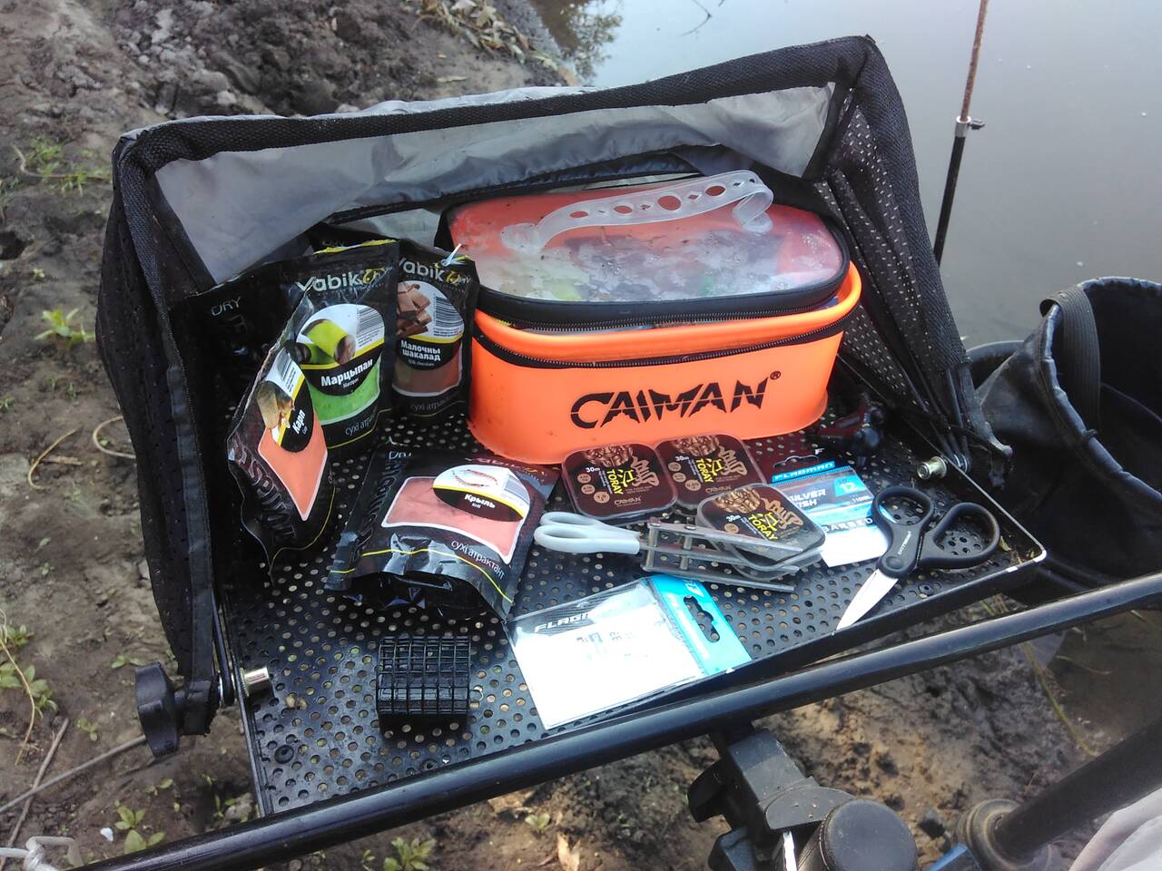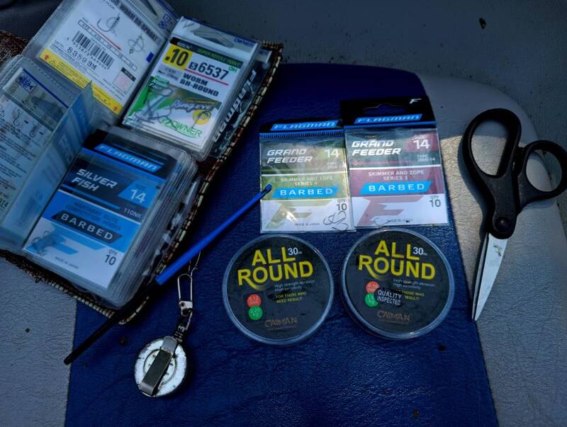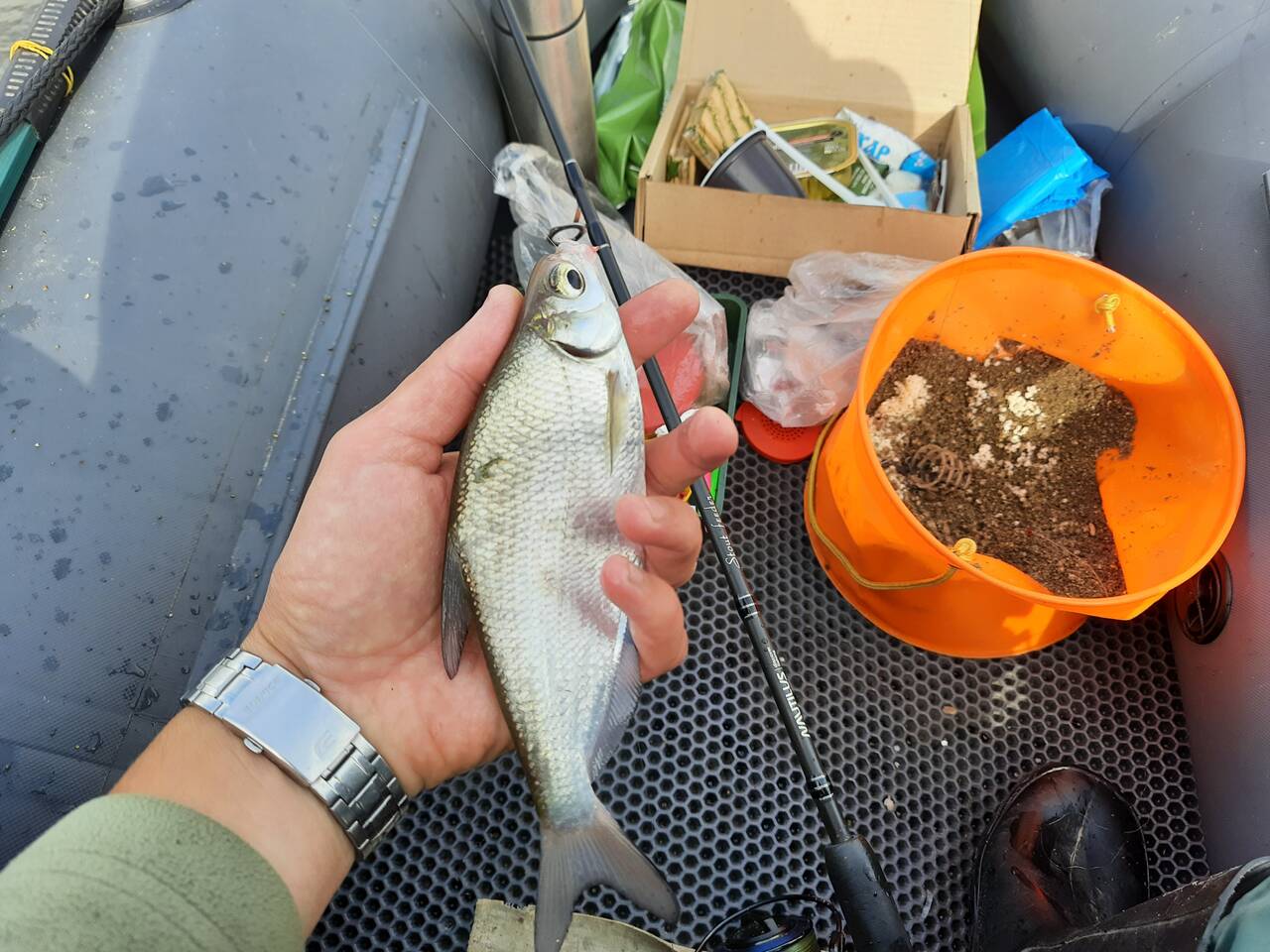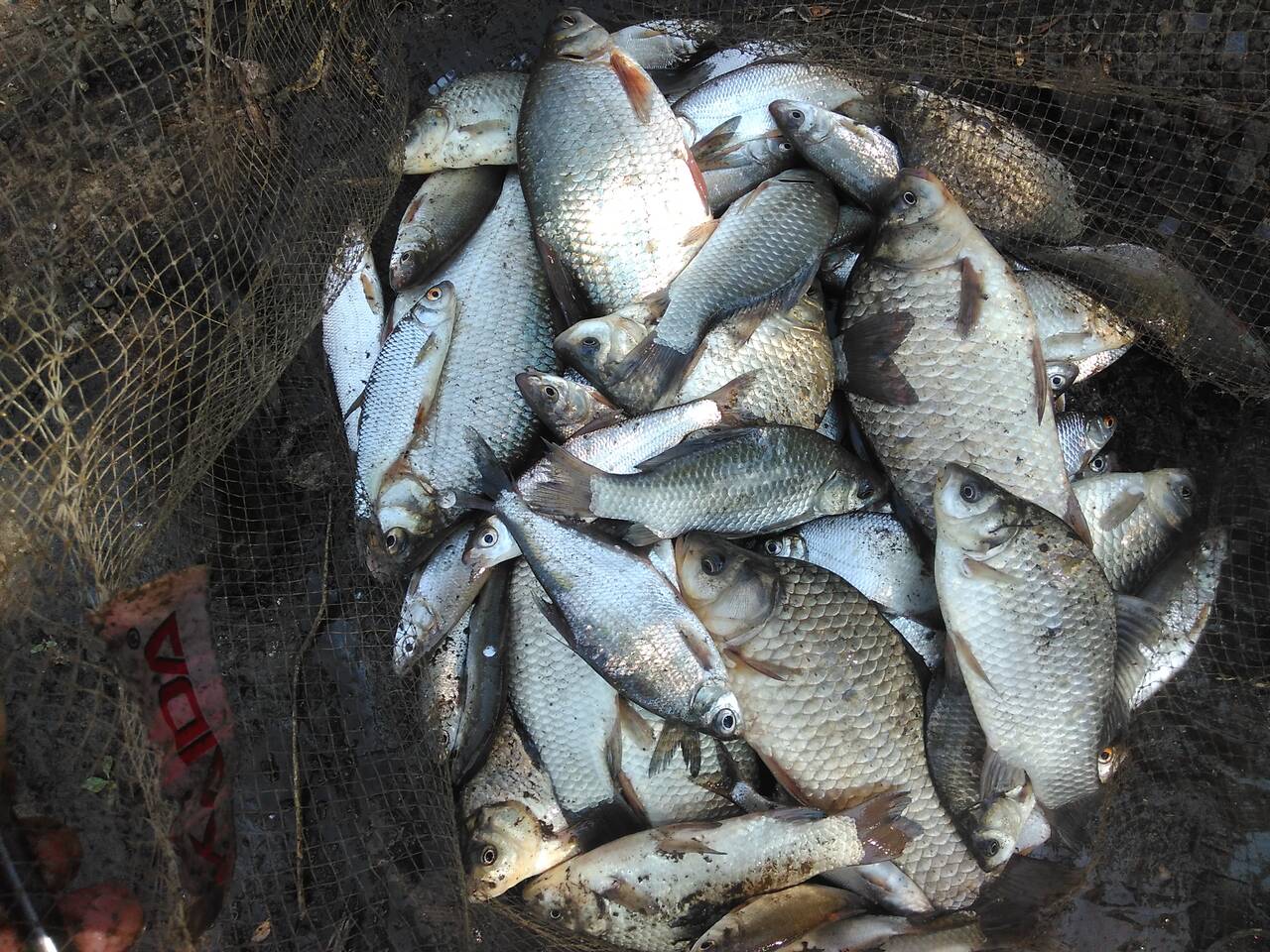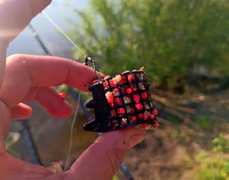 В перерывах между замесом прикормки, перетаскал вещи и отмаркерился на 18 метрах. Сплошная ракушка и примерно одинаковая глубина в районе 2 м. Скользящая оснастка, кормушка 70 грамм лежала как вкопанная, несмотря на сильное течение, поводок 0,1, крючки подбирал под насадку. Из насадок – опарыш, червь и кукуруза. Прикормку дополнял утопленным опарышем и смесью из гороха, кукурузы и конопли, размолотой в «ебушилке».