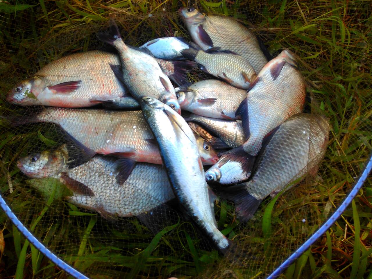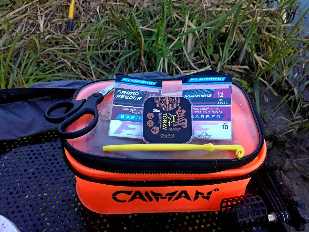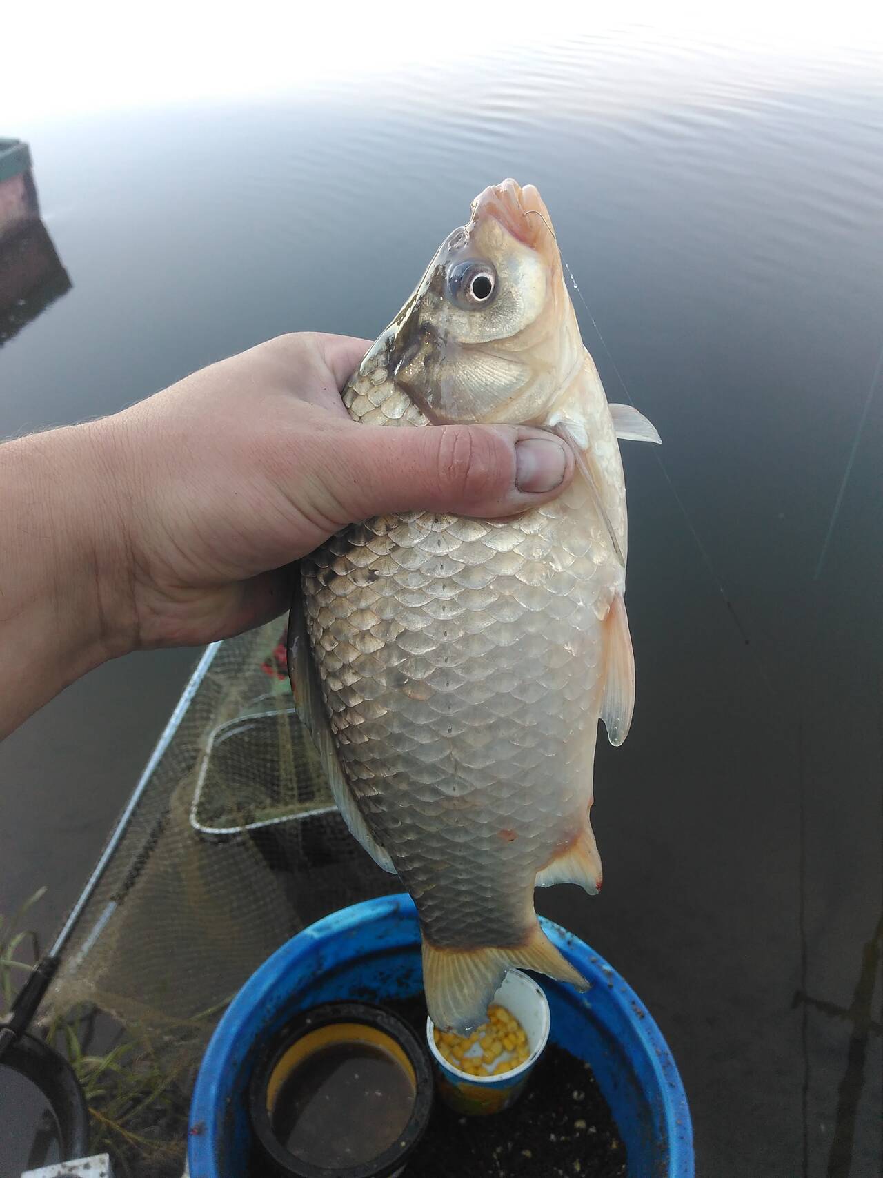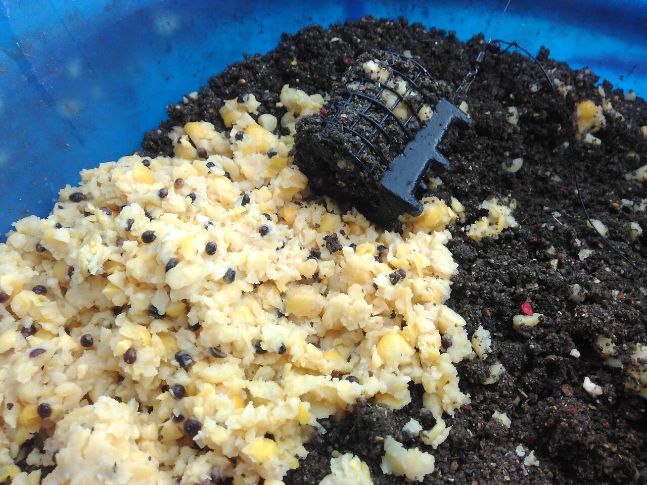 В перерывах между замесом прикормки, перетаскал вещи и отмаркерился на 18 метрах. Сплошная ракушка и примерно одинаковая глубина в районе 2 м. Скользящая оснастка, кормушка 70 грамм лежала как вкопанная, несмотря на сильное течение, поводок 0,1, крючки подбирал под насадку. Из насадок – опарыш, червь и кукуруза. Прикормку дополнял утопленным опарышем и смесью из гороха, кукурузы и конопли, размолотой в «ебушилке».