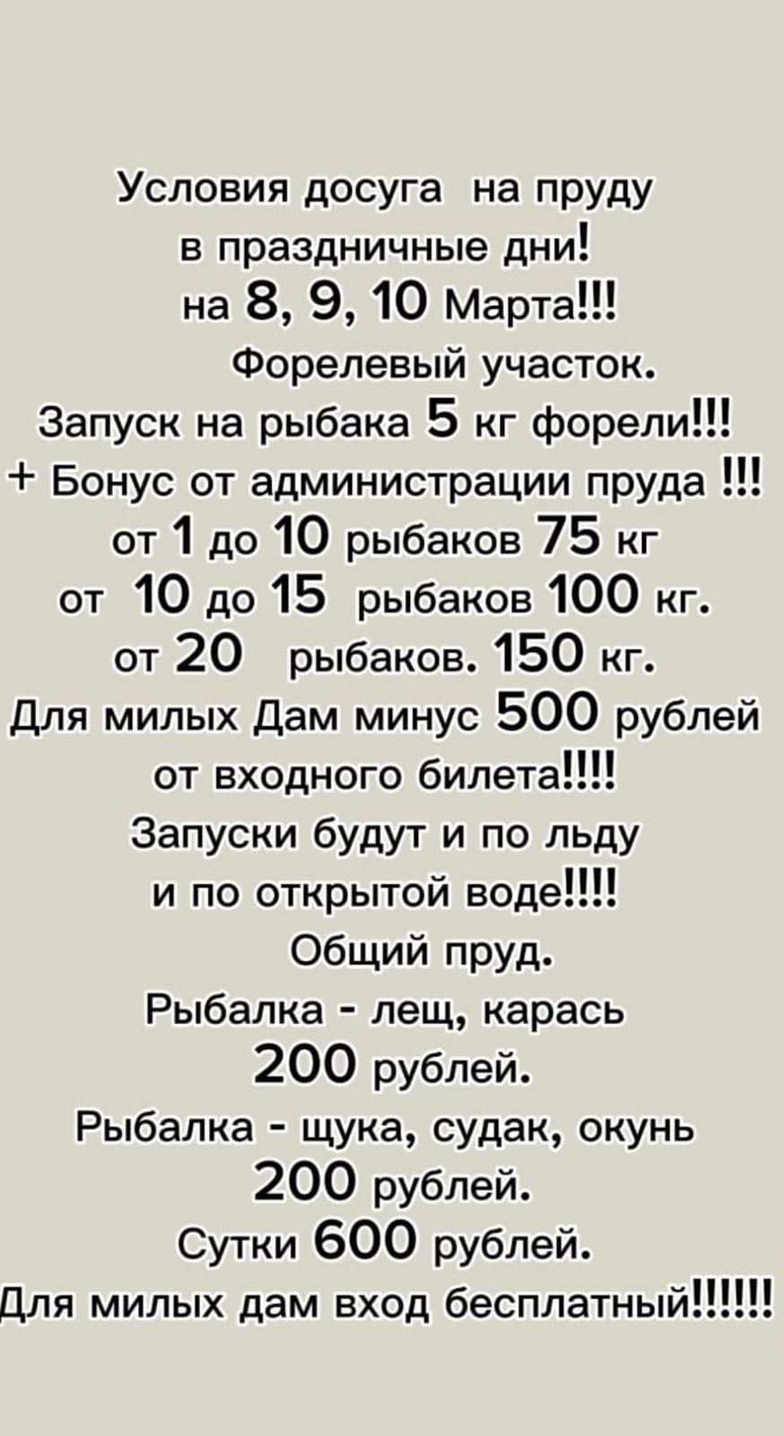 2500 рублей - на рыбак 1 активная удочка + 2 пассивные удочки. Нормы вылова по форели нету!!!. В будние дни запуск на рыбака 2 кг !!!