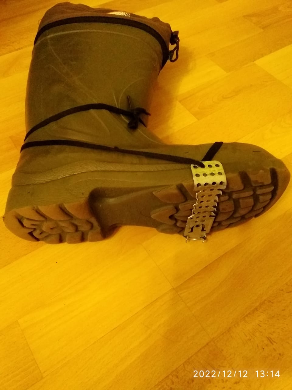 Что-то стало скользко... Решил поделиться бюджетной приспособой, чтобы не спроецироваться на лёд фейсом или задницей... До этого пробовал резиновые насадки на сапоги с шипами - видимо делают на китайских гейш- на 44 сапог налозят ну никак!!! Пробовал клеить крупную наждачку- хватает на один раз.,.. Эх были старые ,"Роксы" да сносил давно... Теперь к делу- берём два обычных подвеса которые используются для монтажа профилей под гипсокартон. Меряем ширину сапога по ступне и делаем два загиба по 3 см. По размеру. Прямые выступы вырезаем болгаркой или ножницами по металлу под шип. И загинаем пассатижами под прямым углом. Вставляем длинный шнурок с петлей на носок сапога и перевязываем через пятку (как в детстве лыжи). Мне хватило на прошлый сезон, в субботу один подвес лопнул- замена 10 минут дома...дешево и сердито! Но главное РЕАЛЬНО не скользко!!! Р. S. Сейчас попрошу друга Дмитрича скинуть фото- я в этом никак не силен...