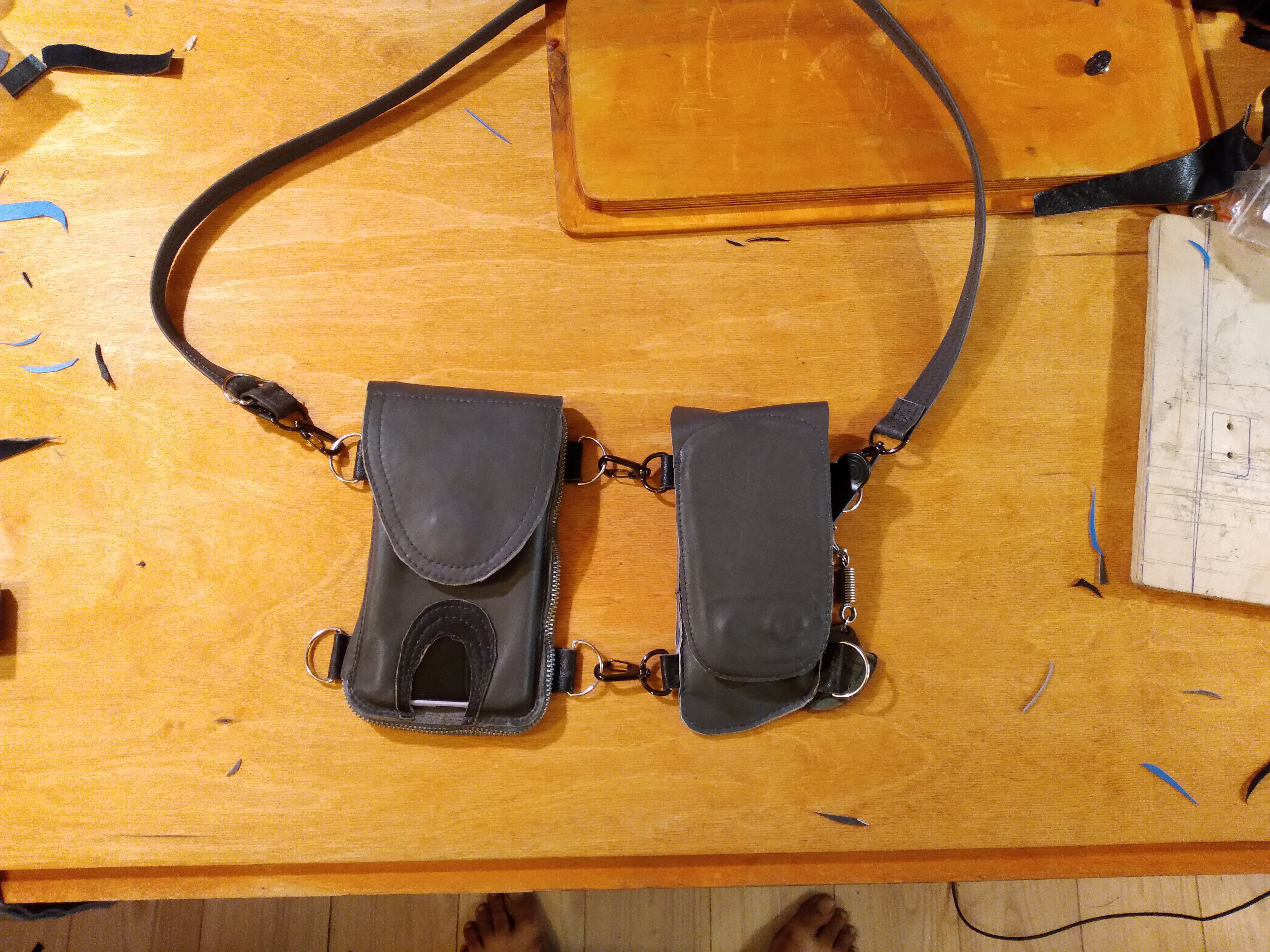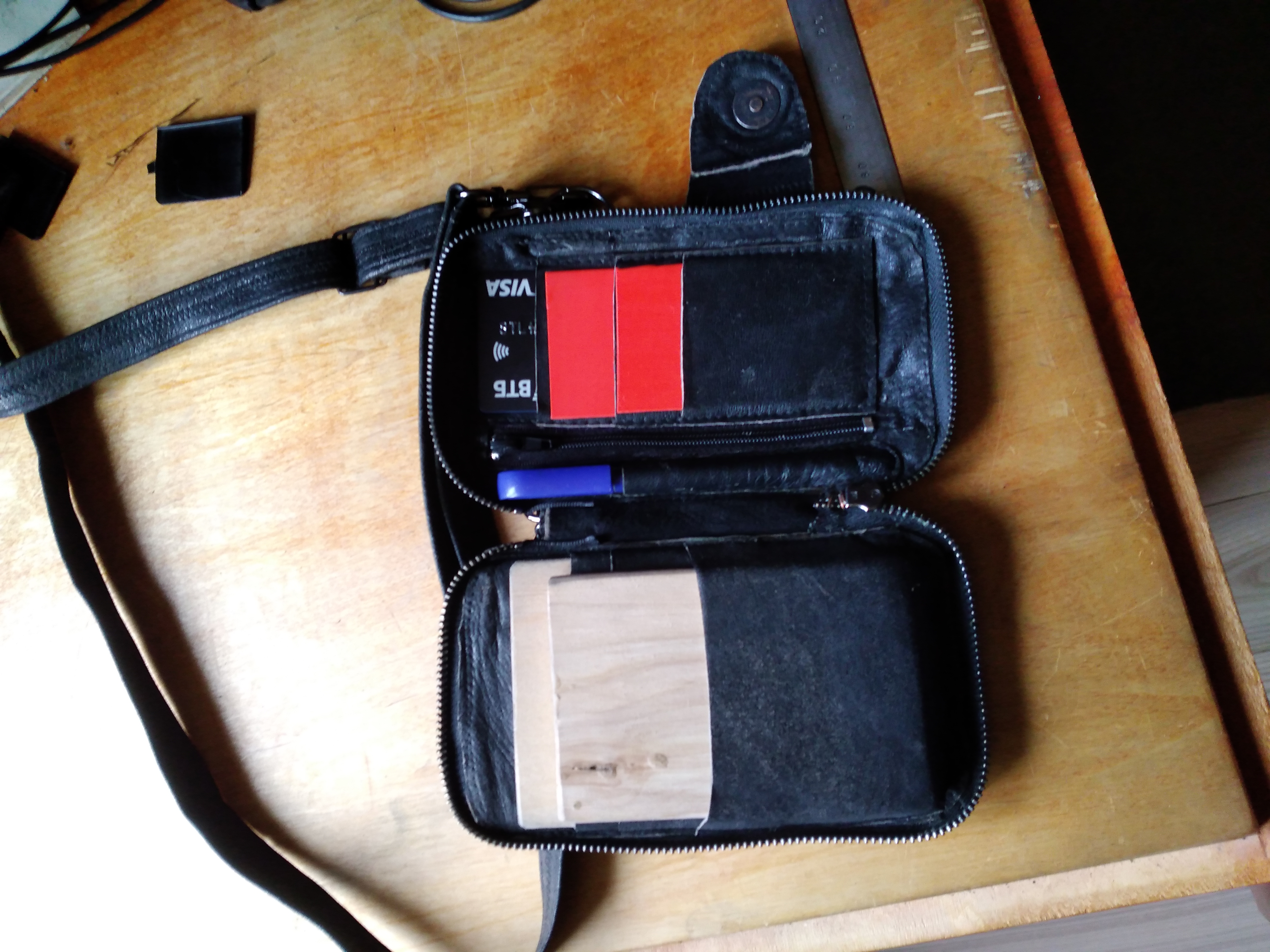 Решил "упаковать" охот доки, то телепаются по карманам. Получился толстоват. Кожа 1,8 - 2мм, нить 1мм плоская, шаг стяжка 5мм. Полировка пчелиным воском.