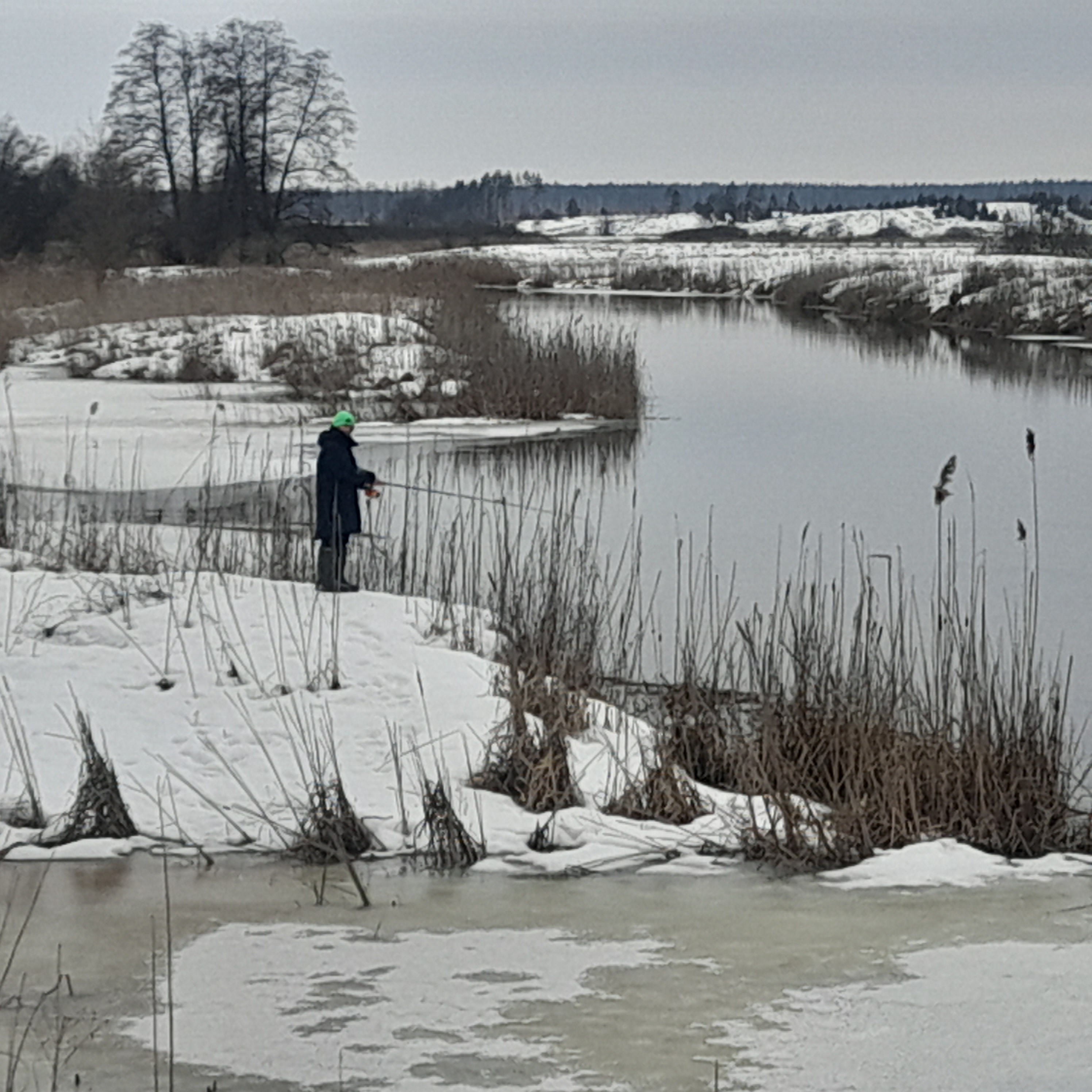 Выехали в девять, в принципе по последним 2-3 рыбалкам было видно , что раньше нет смысла ехать. За неделю морозов не которые места затянуло льдом, выйти на него нельзя, но и кидать тоже не удобно, но все же открытой воды много.