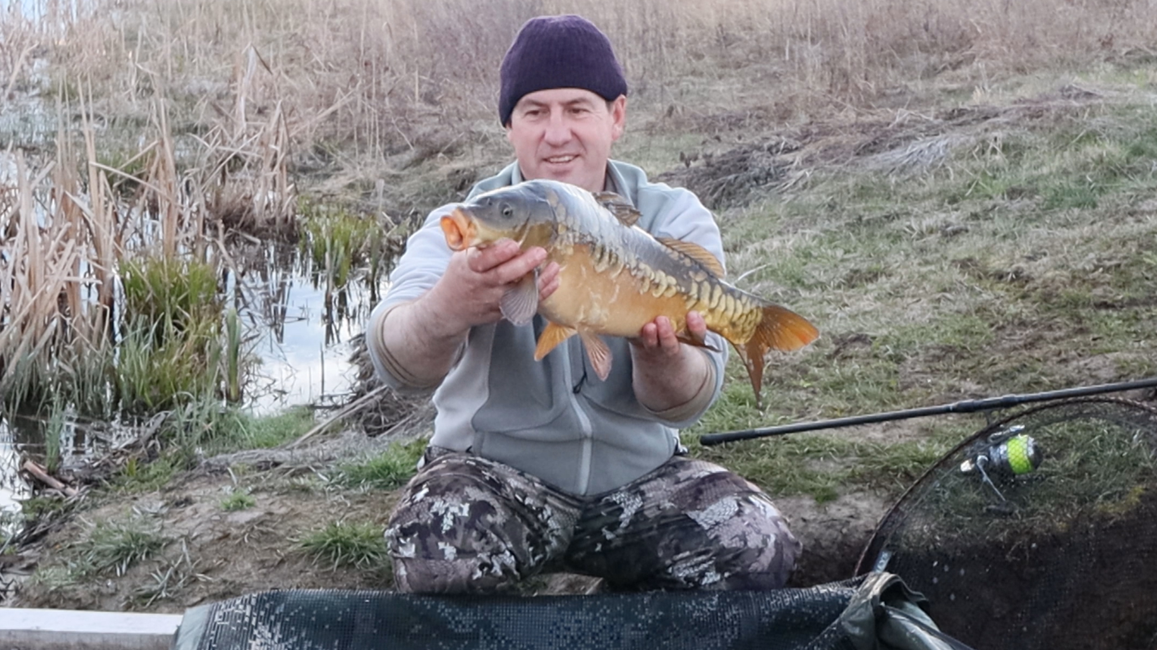 Ночь была очень холодной, всего +5, было всего пару невнятных пиков.Но рыба ходила, то тут , то там выворачивались приличные поросята, но тем не менее поклевок не было.После рассвета, в 4:15 получаем дуплет на удилища со второй точки, первый-практически сразу сход, второй- припаркован.При вываживании, до последнего не могли понять в лучах восходящего солнца, что за рыбина попалась, пока не подвели к подсаку, оказалось - классический зеркальный карп, большая редкость сейчас, очень прогонистый , при длине в 85 см весил всего 9200, красавец, с черно-золотистым отливом.Когда подвели первый раз к подсаку, вначале показалось , что белый амур, шел торпедой и сверху было видно длинную толстую спину, лишь когда он при борьбе показал свой бок, стало понятно,что зеркалка...